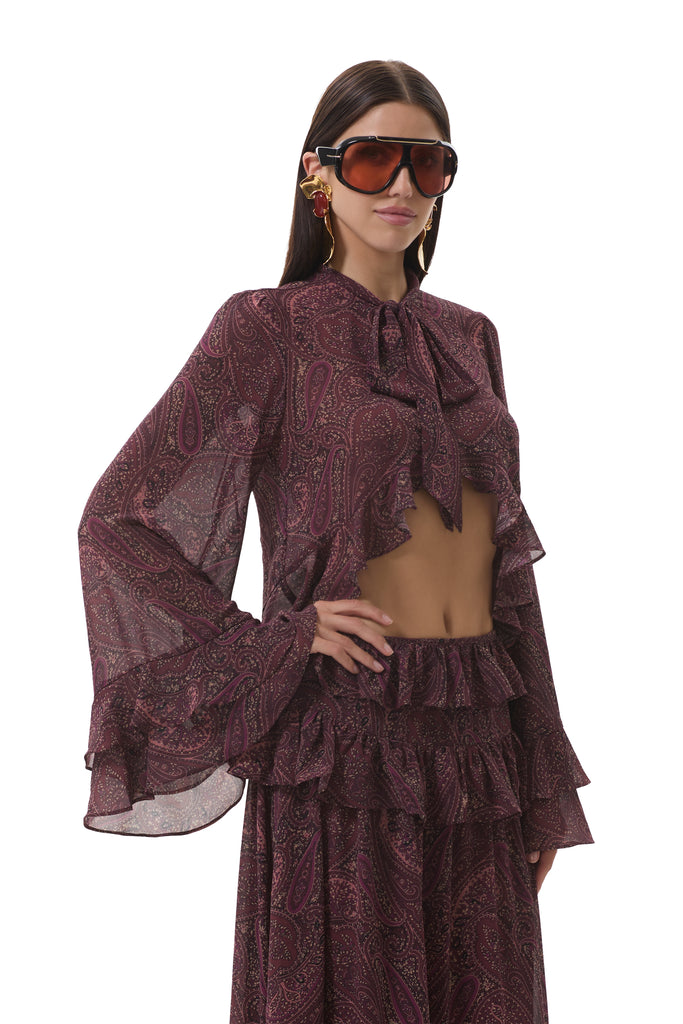The Aldora Top is the ultimate expression of feminine romance. Aldora is designed with a statement making pussy bow neckline, flowing wide long sleeves, and delicate ruffle accents at the hem. The high low shape of this top brings to the drama to any look. Style it with the matching Pierre Skirt.