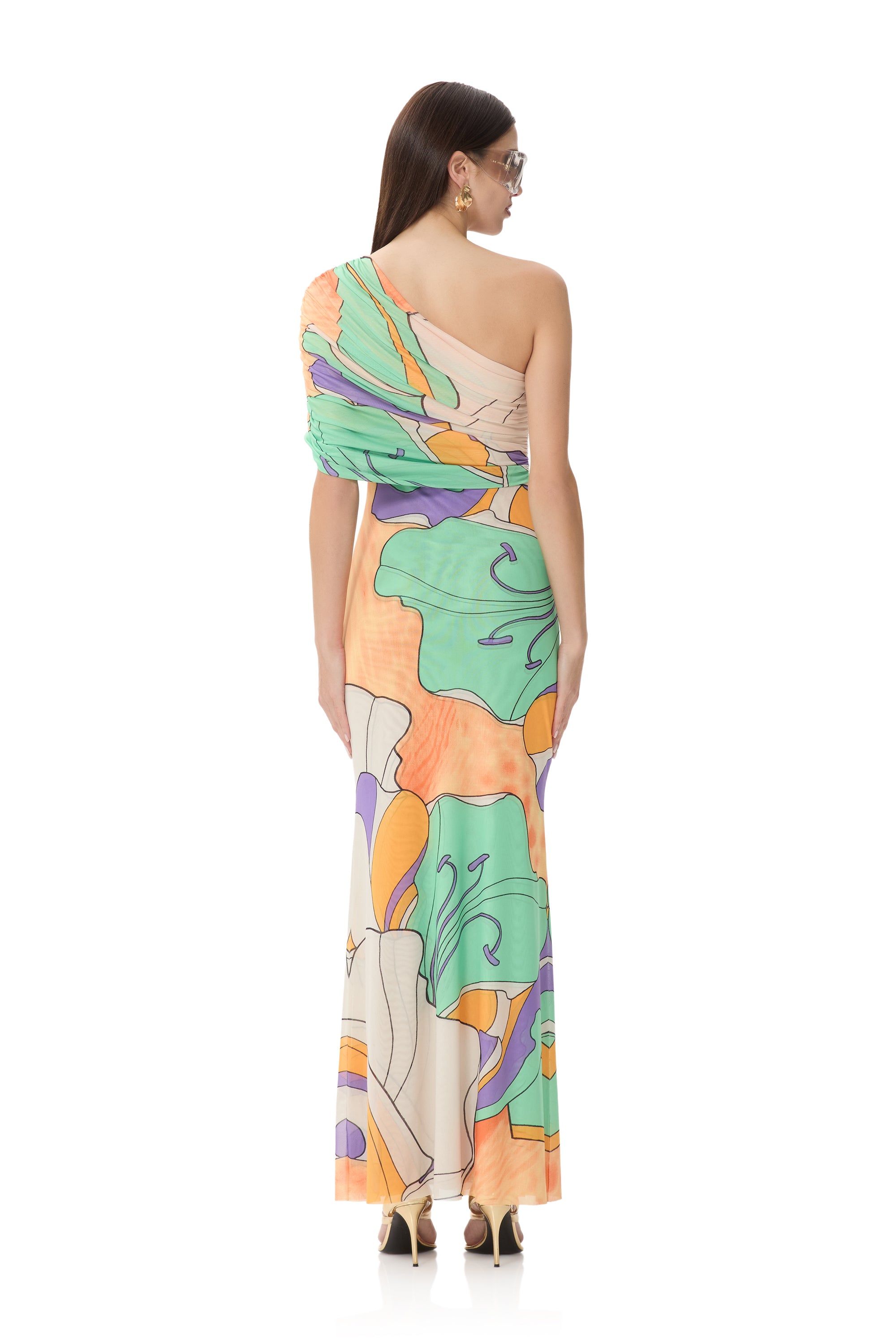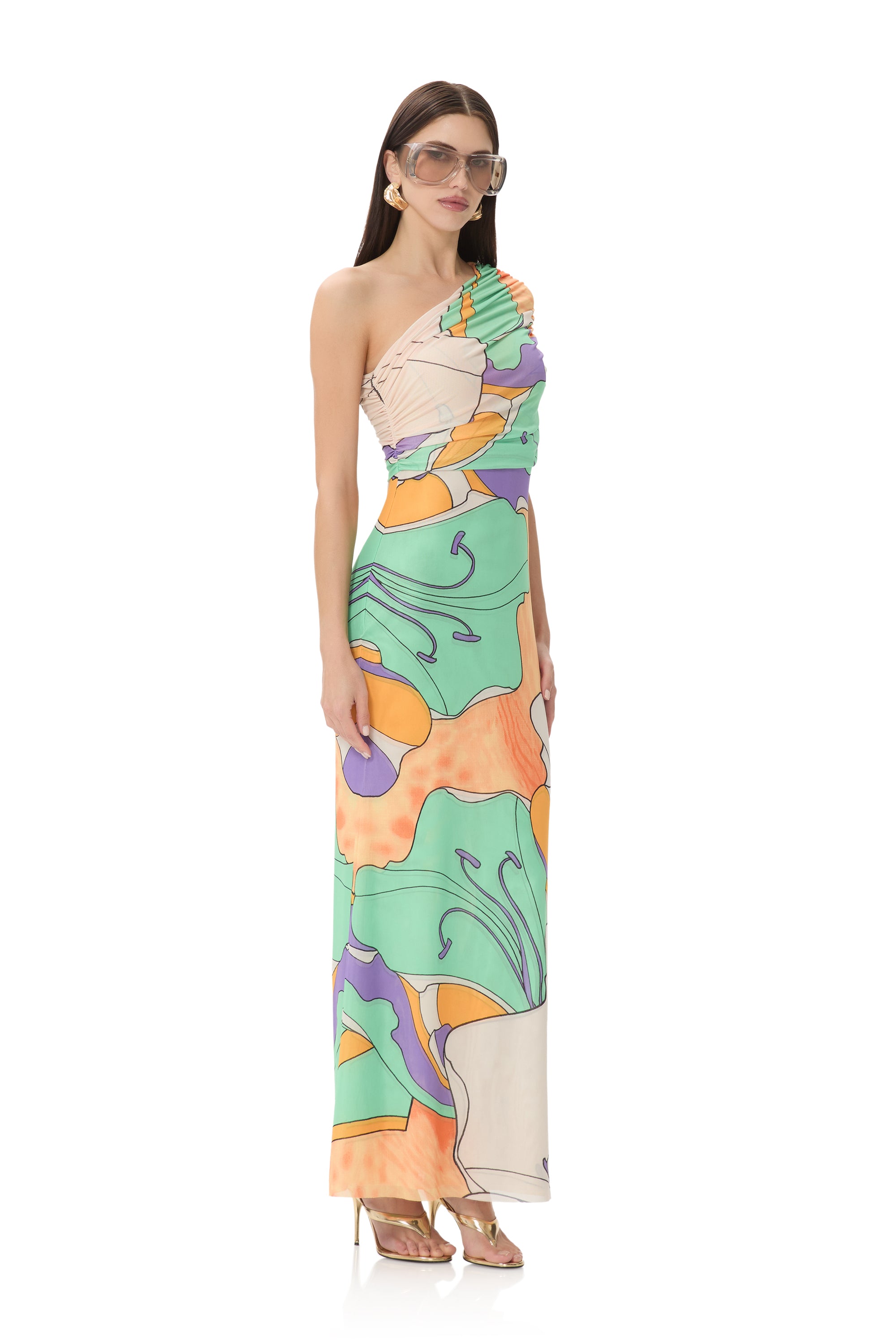Introducing this season's standout dress, the Mirabel. Defined by its asymmetrical one shoulder neckline and delicate draping shoulder detail, this fluid maxi silhouette makes a bold statement in our vibrant Scarf Floral placement print.