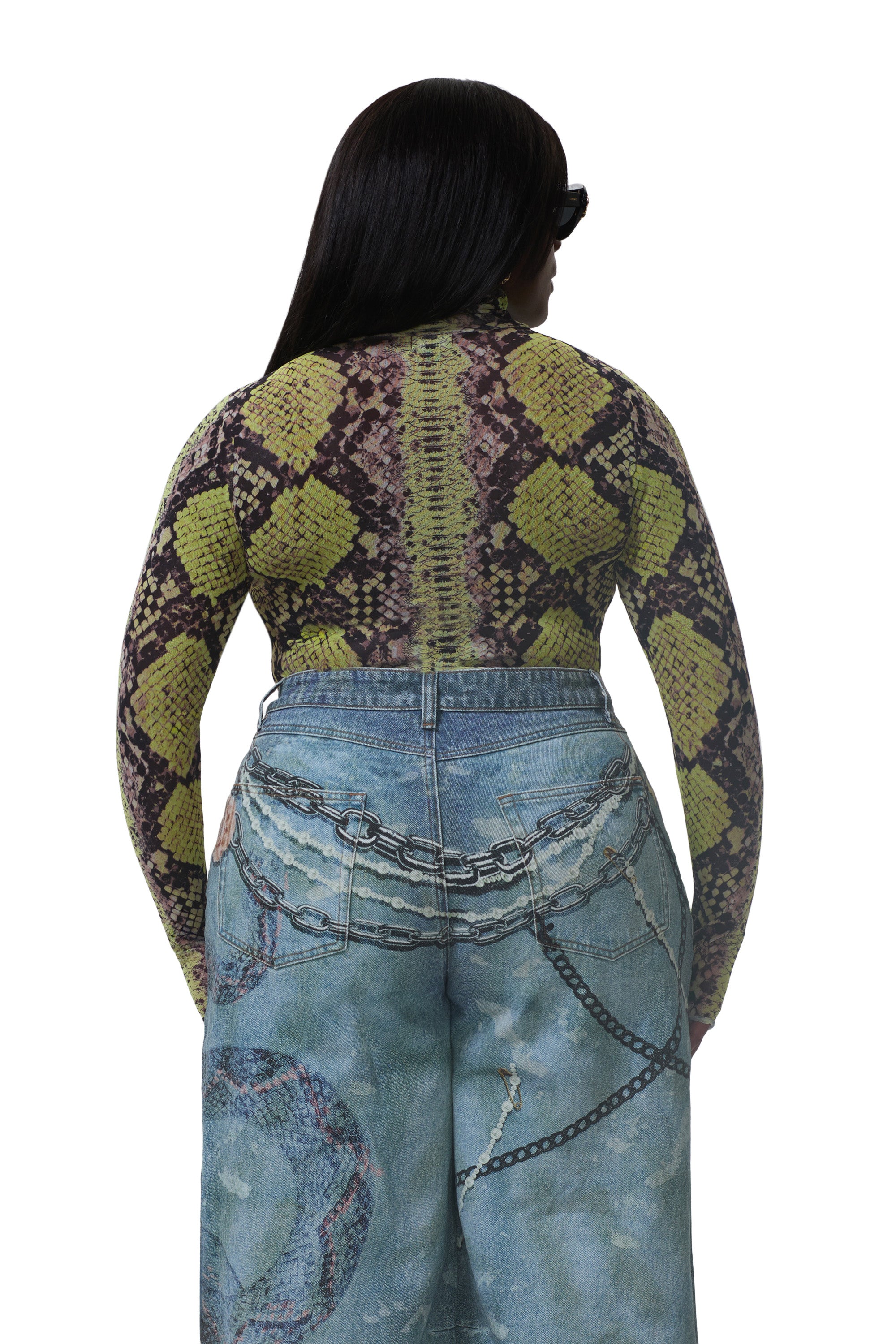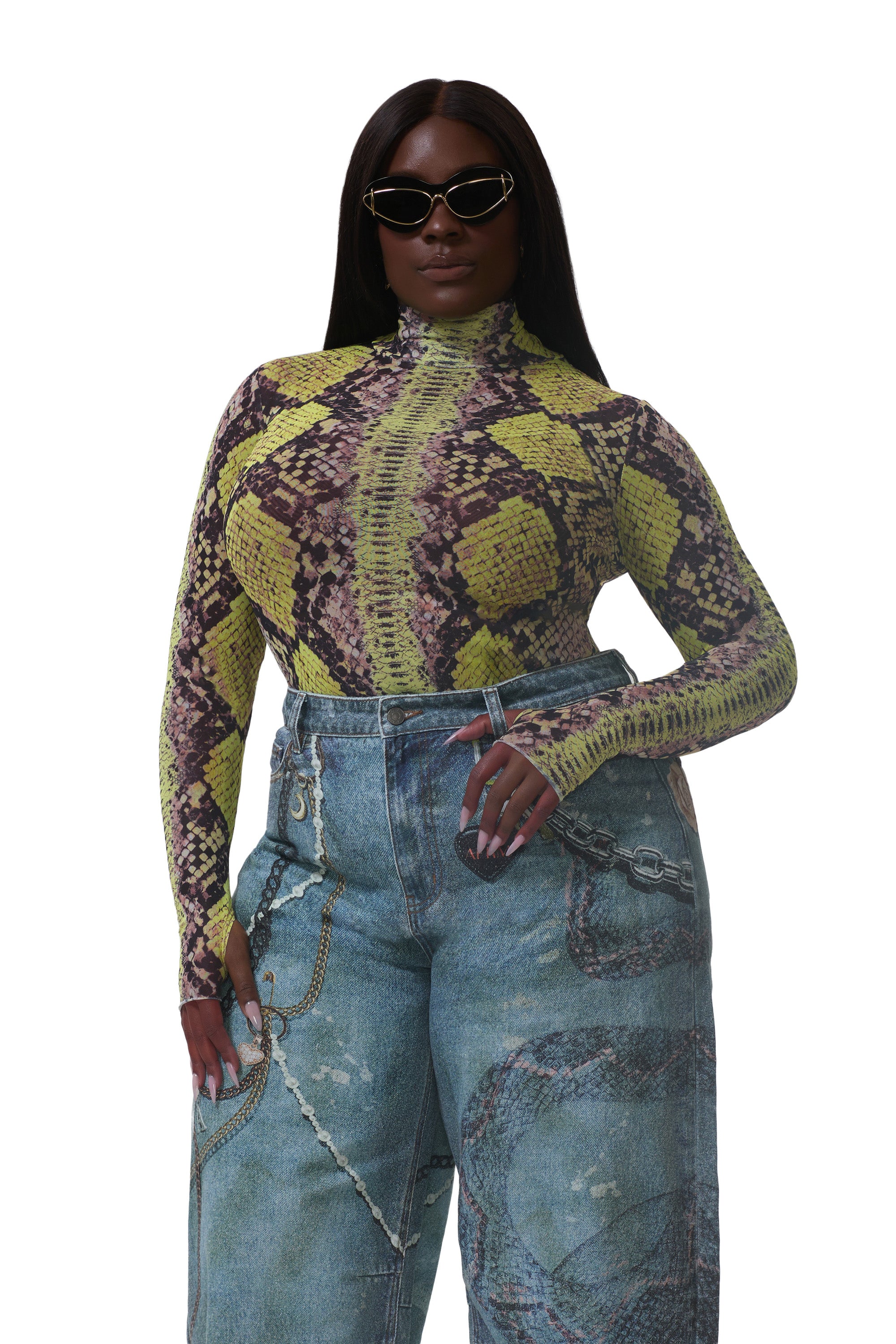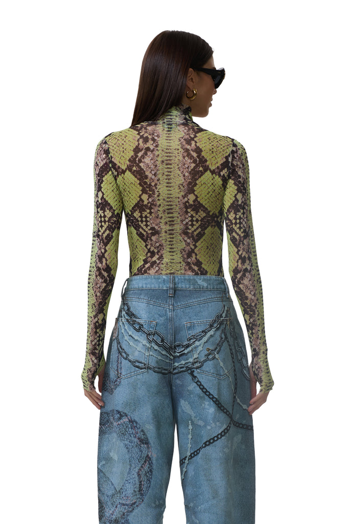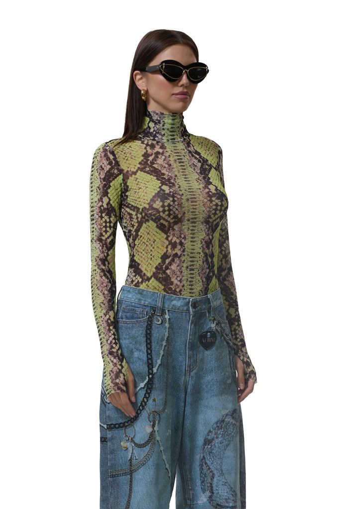 The Zadie top features a sheer mesh material and street-style thumbholes that lend an edgy update to off-duty style. She comes in Lime Snake.