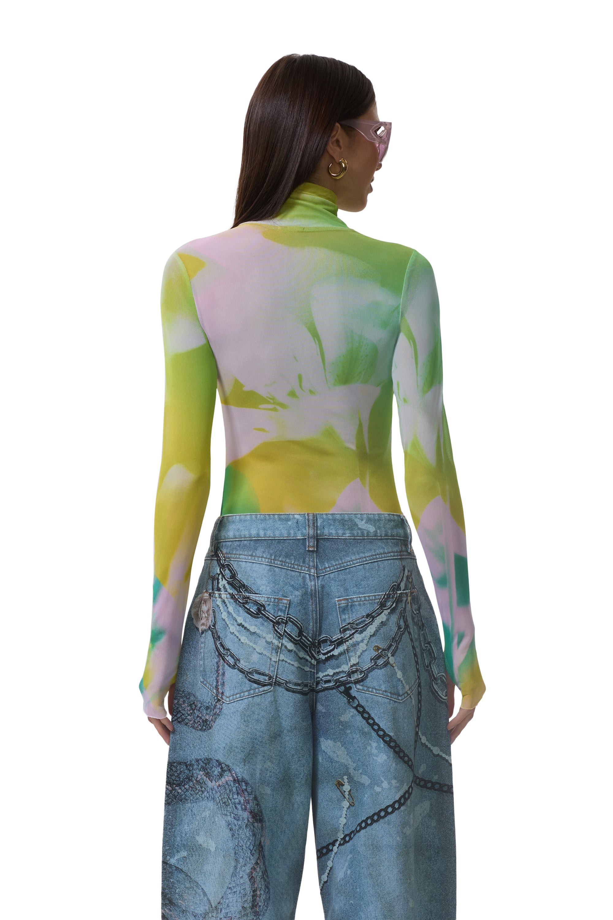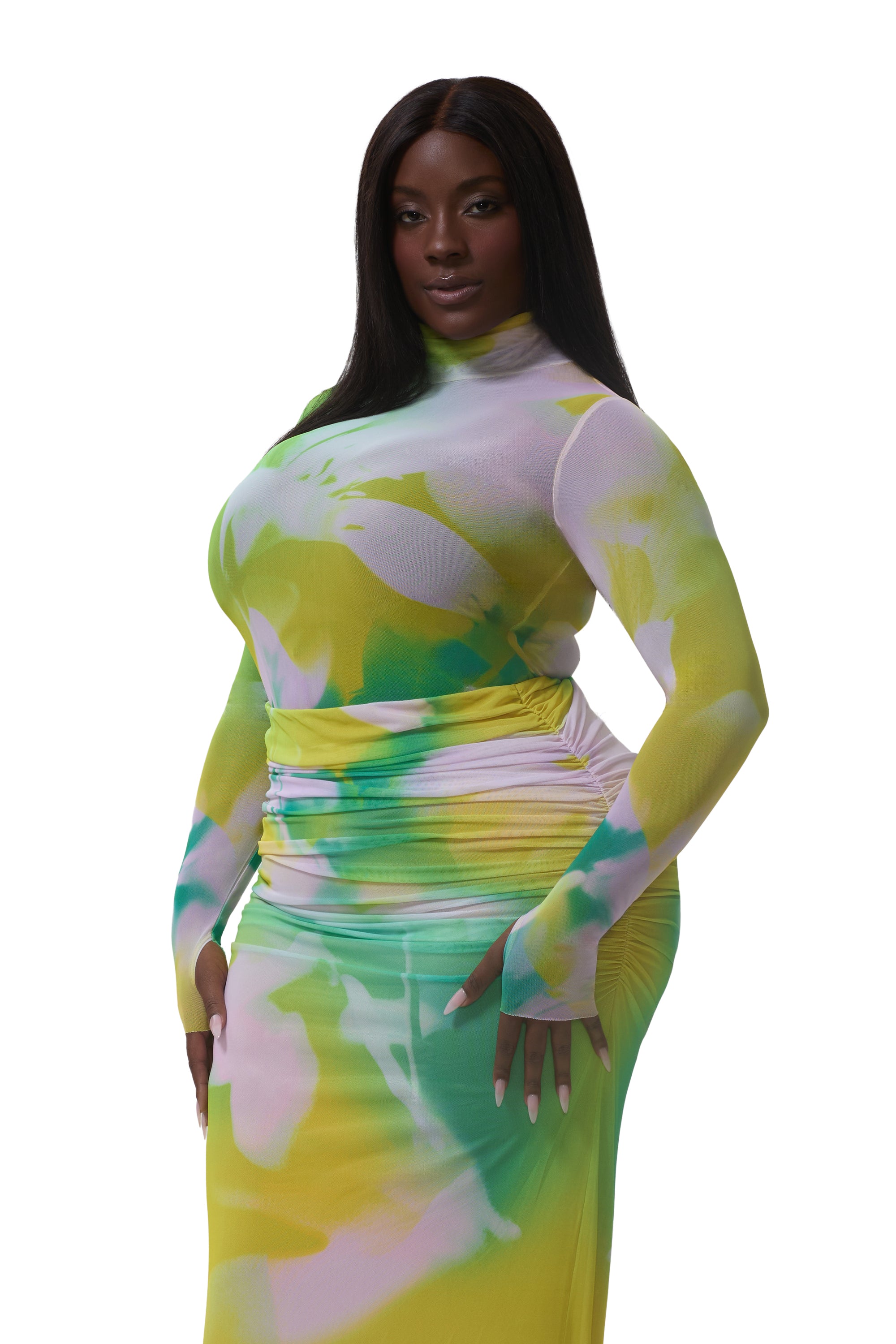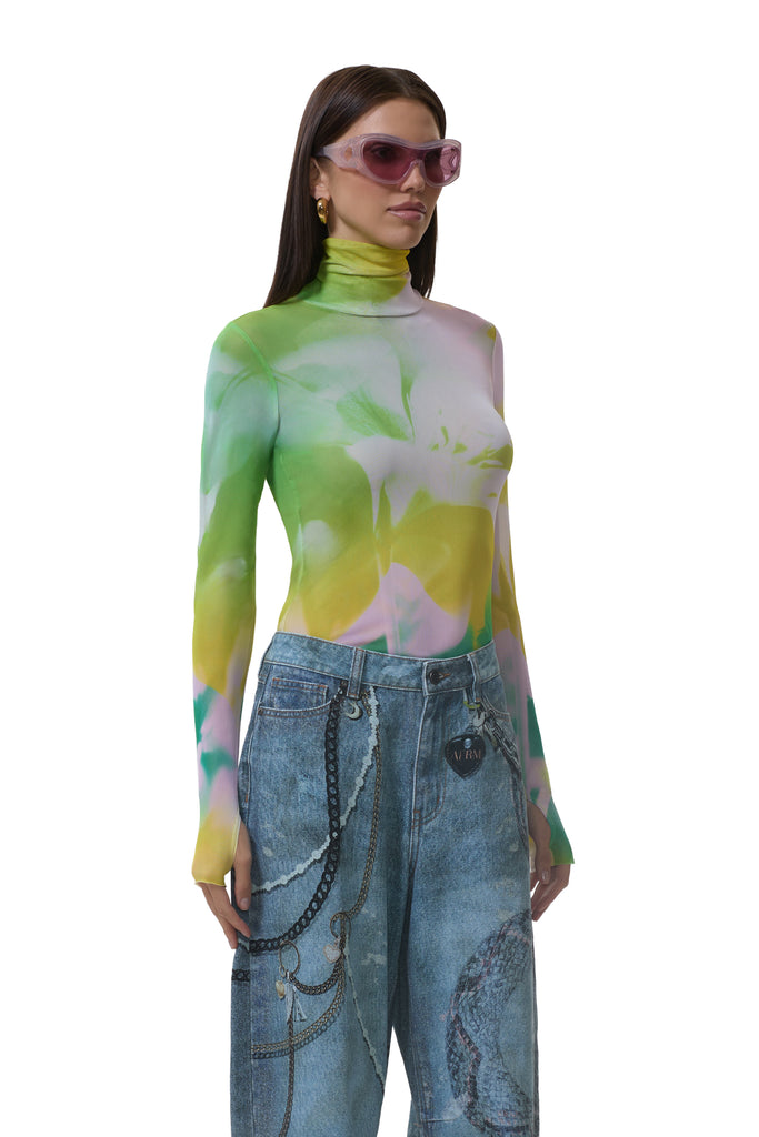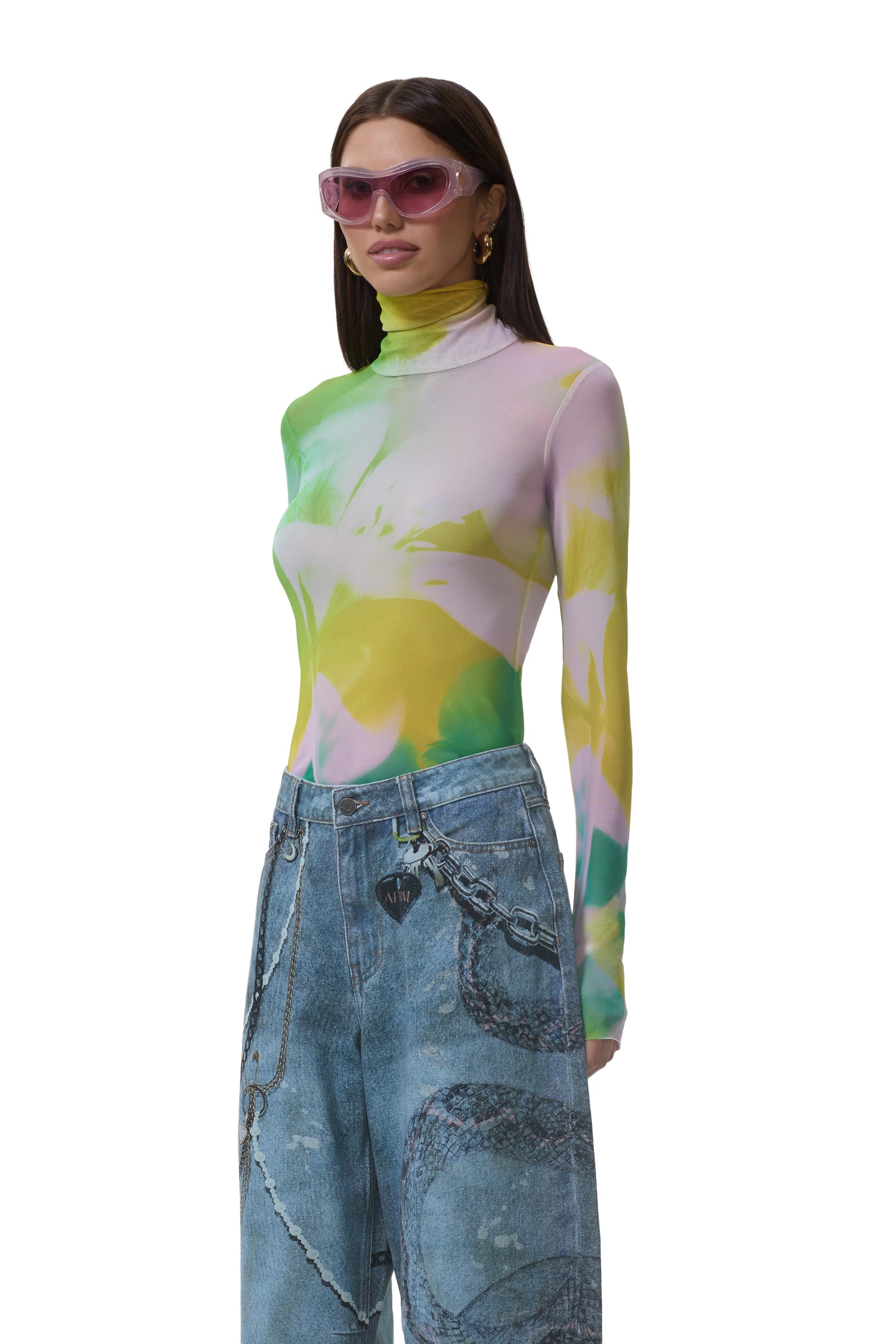 The Zadie top features a sheer mesh material and street-style thumbholes that lend an edgy update to off-duty style. She comes in Sunblur Blossom.
