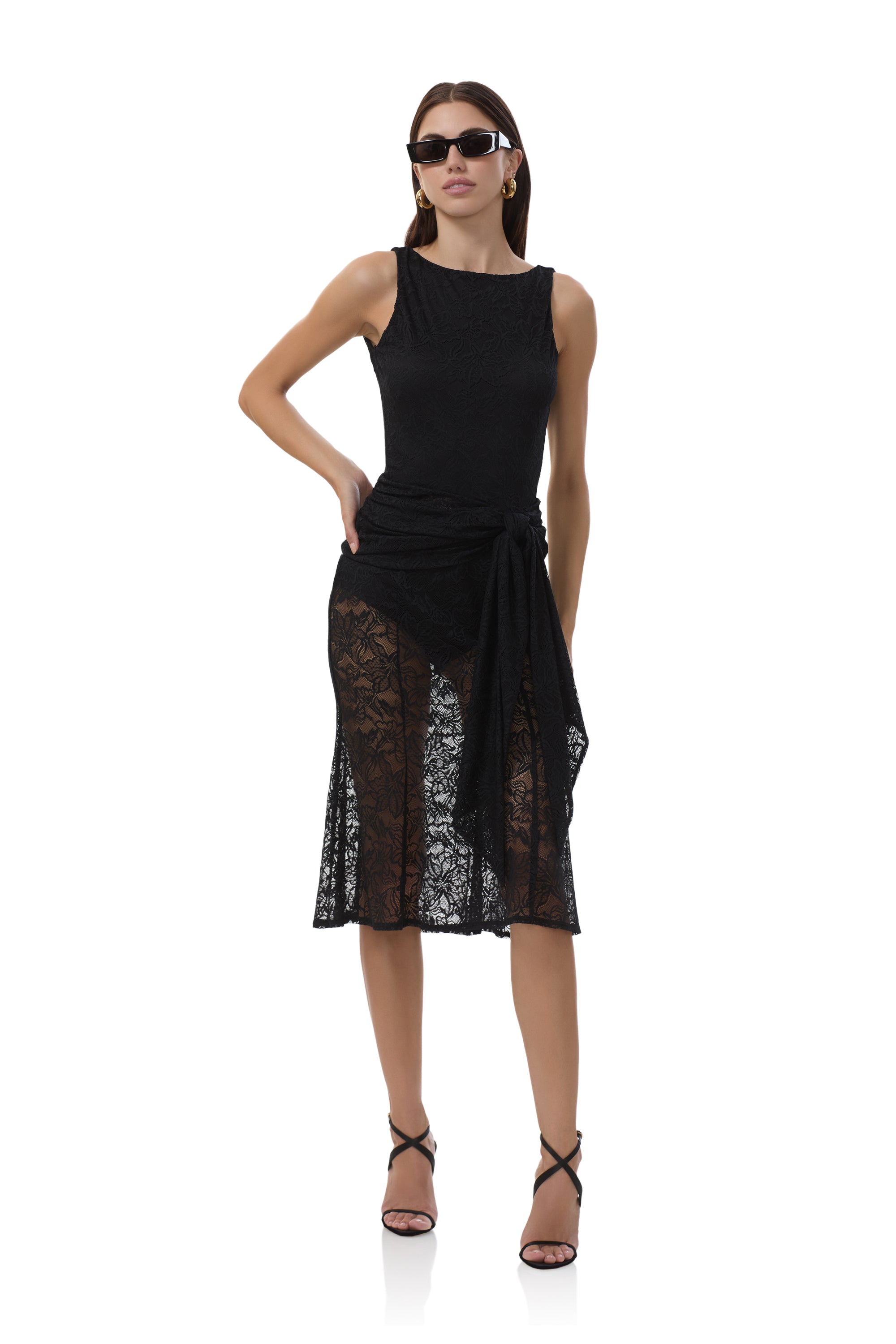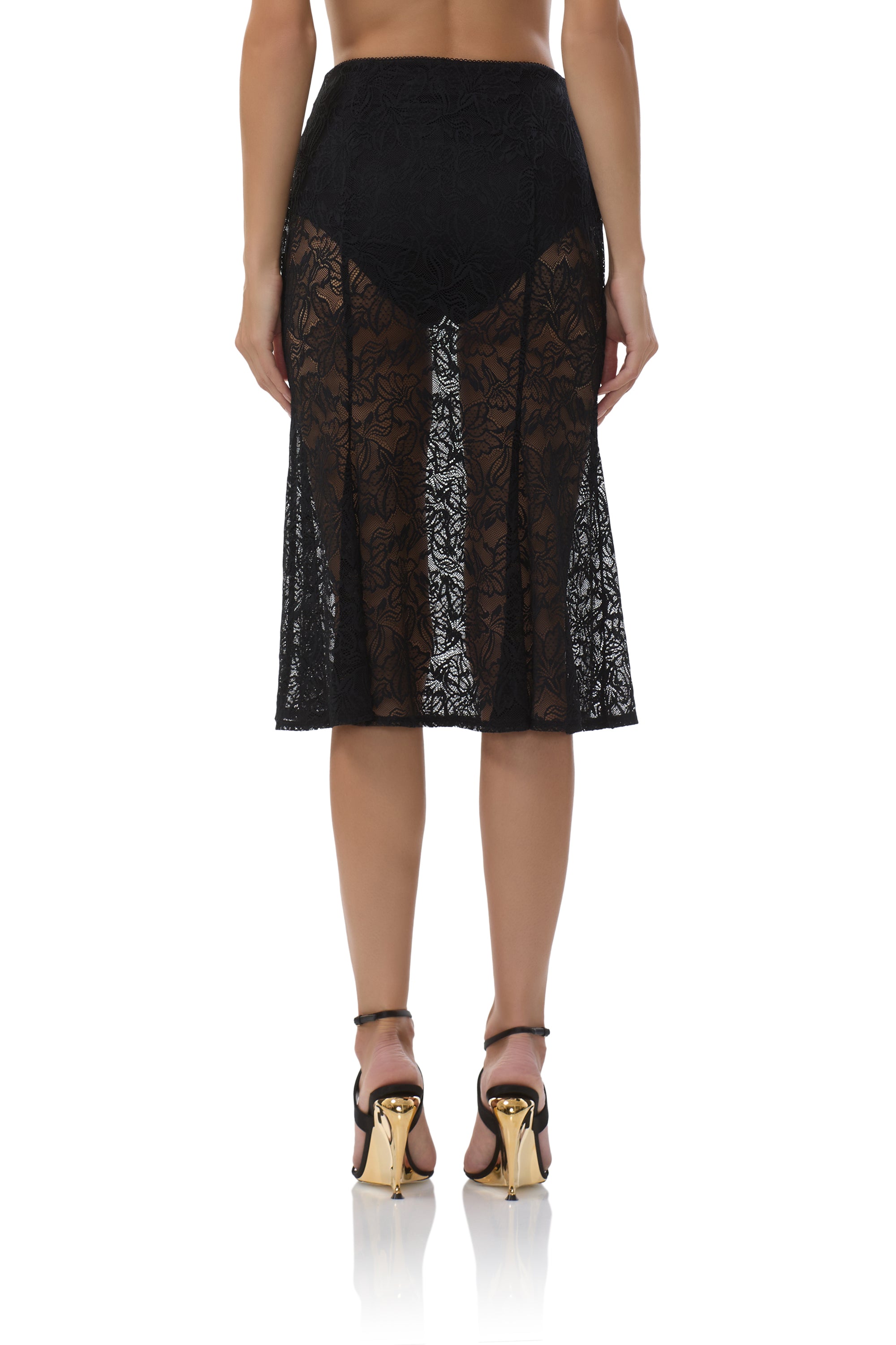 Timeless in Noir, meet the Hayward Lace Skirt. Designed with a sheer, knee length silhouette that flatters the figure and moves beautifully with every step, she’s the perfect balance of elegance and edge. Style her with our Batya Lace Top for a striking all over Noir look.
