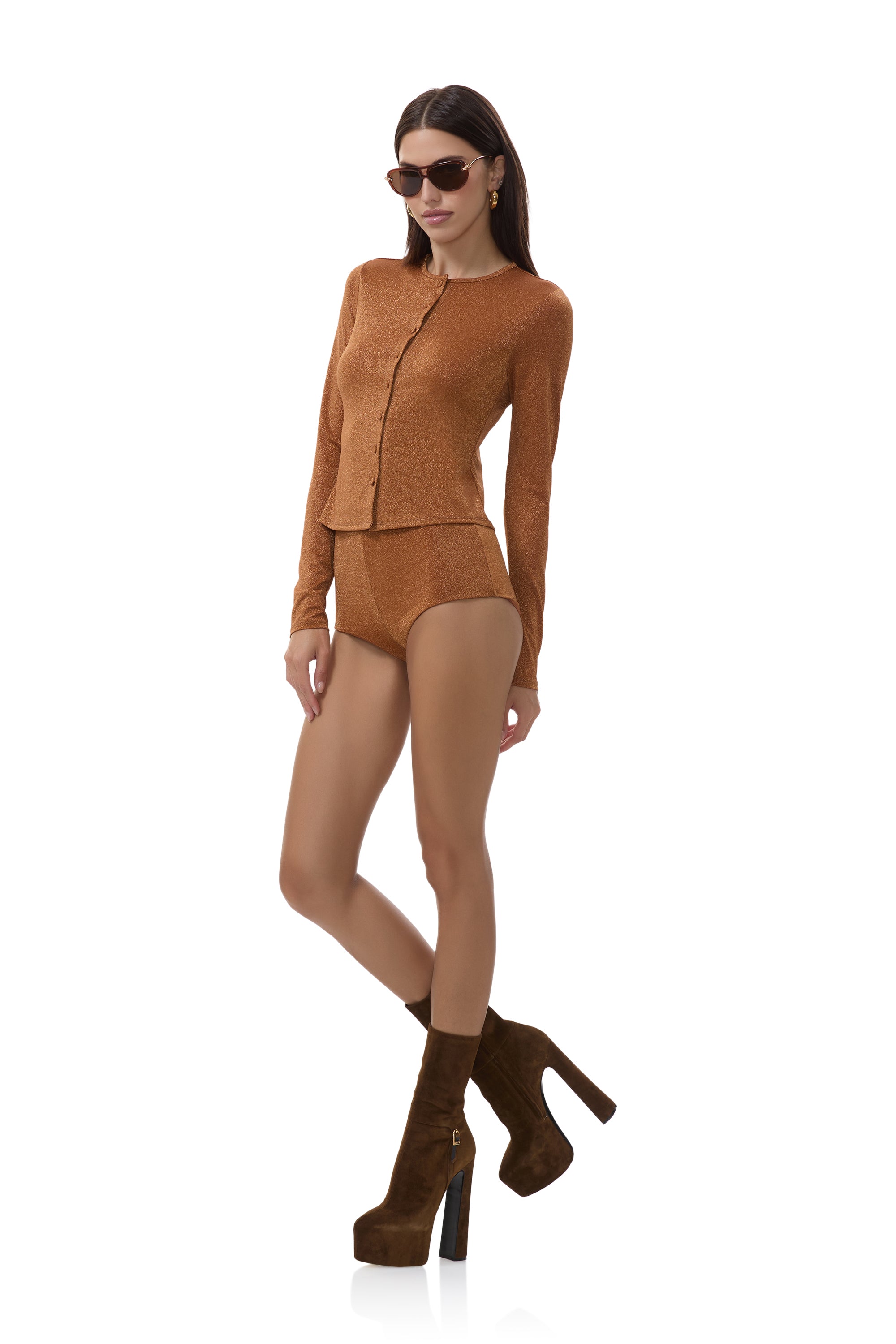 Meet Linda, the statement making cardigan made to shine all season long. Crafted from our luxe sparkle jersey, she features a flattering figure hugging fit that catches the light with every move. Pair her with our Yves Hot Short for the ultimate Bronze matching set.