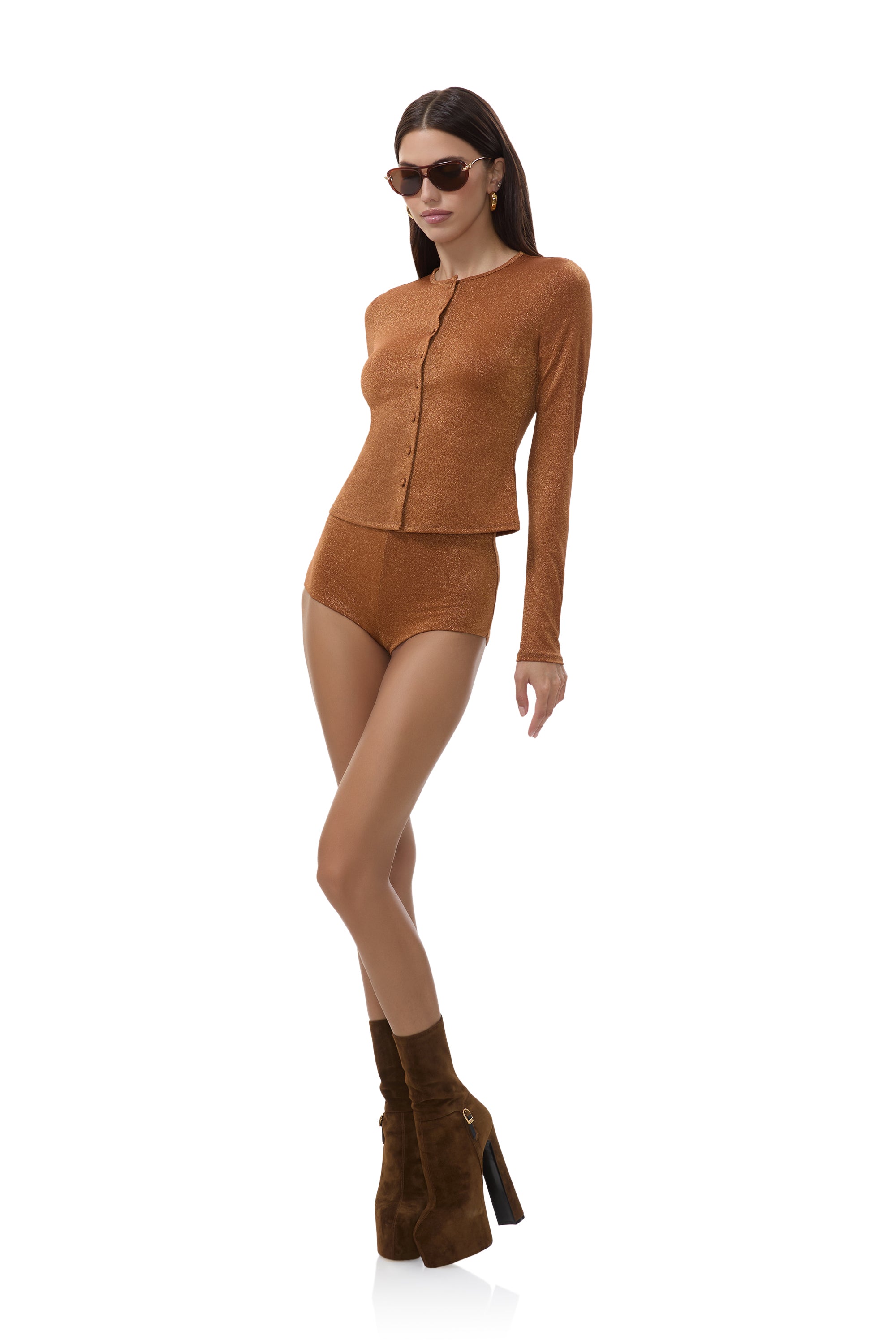 Shorter, sexier, and hotter than ever before, meet Yves, now designed in our luxe sparkle jersey fabrication. These fitted hot shorts were meant to fit, flatter, and most importantly, turn heads. There are so many ways you can style these, pair with our Linda Cardigan for a perfectly paired Bronze look.