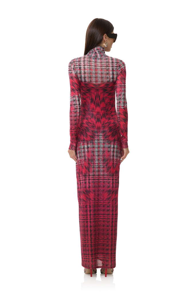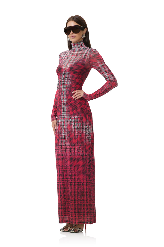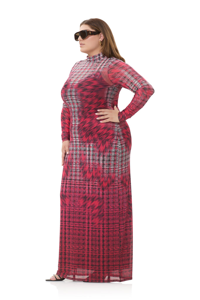 The Billie Dress is back and better than ever. Crafted in sheer power mesh and adorned with our new Ruby Houndstooth print, she’s designed in an effortless column fit with a sleek mock neck and flattering maxi silhouette. A true wardrobe essential, Billie transitions seamlessly from day to night with timeless versatility.