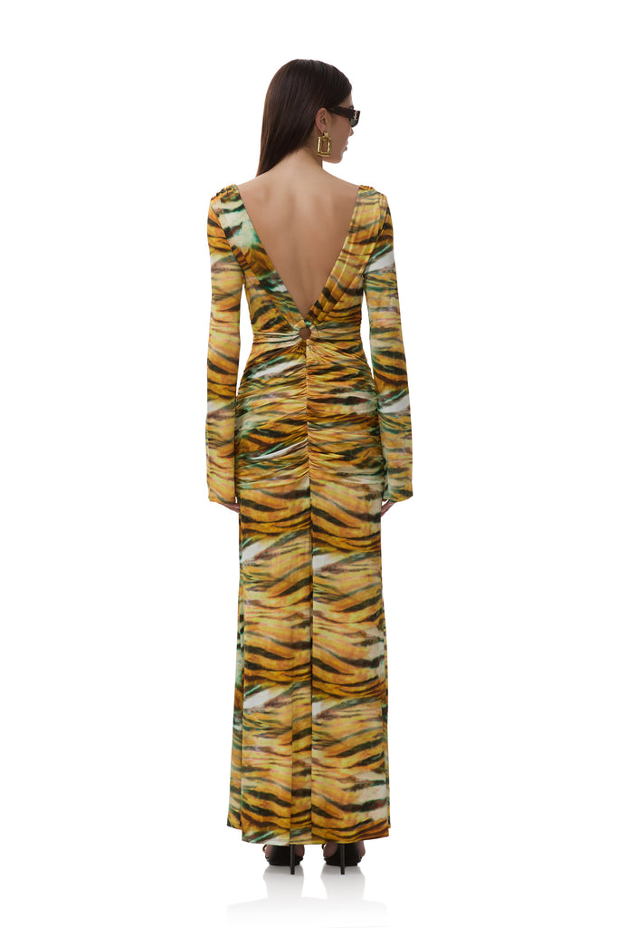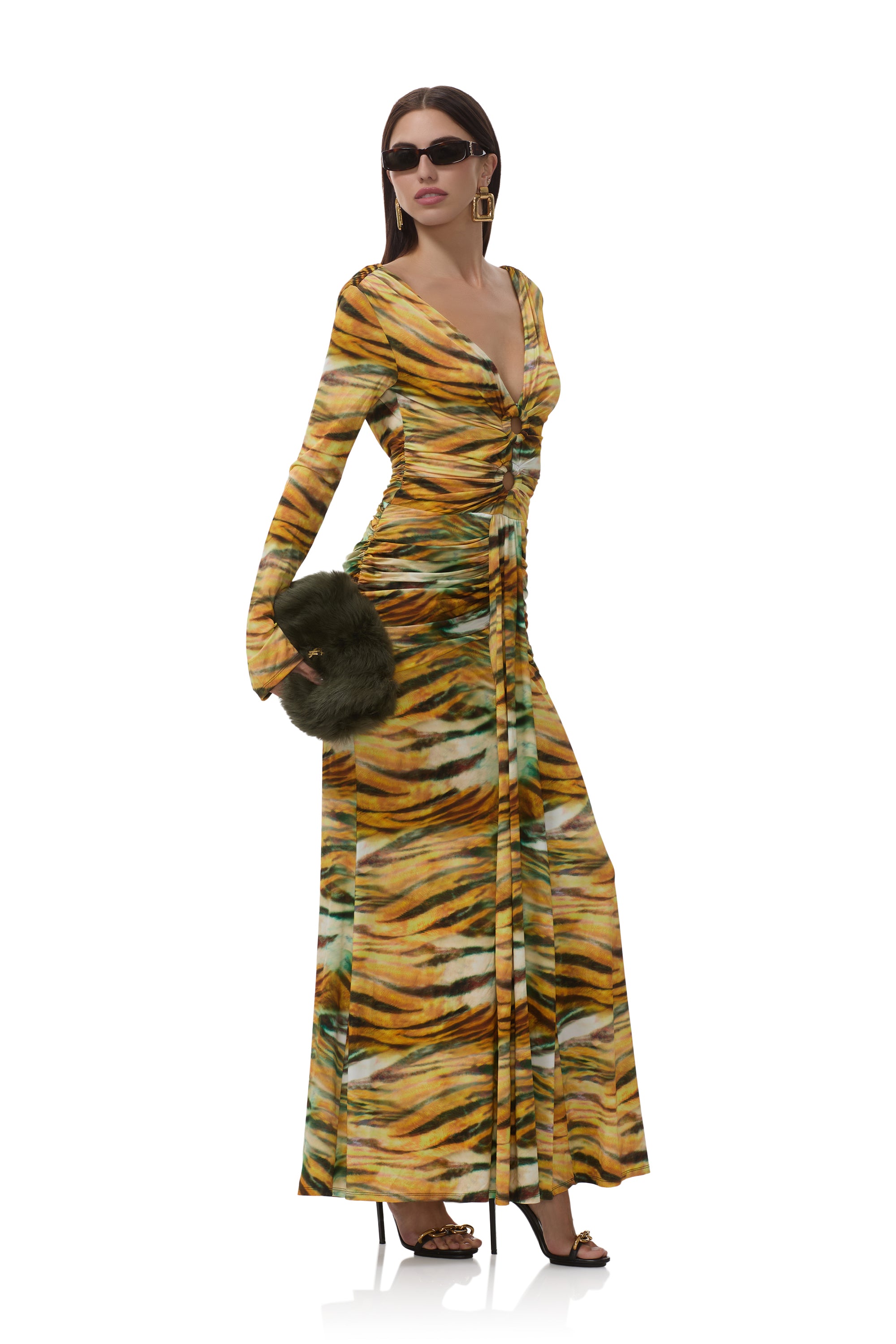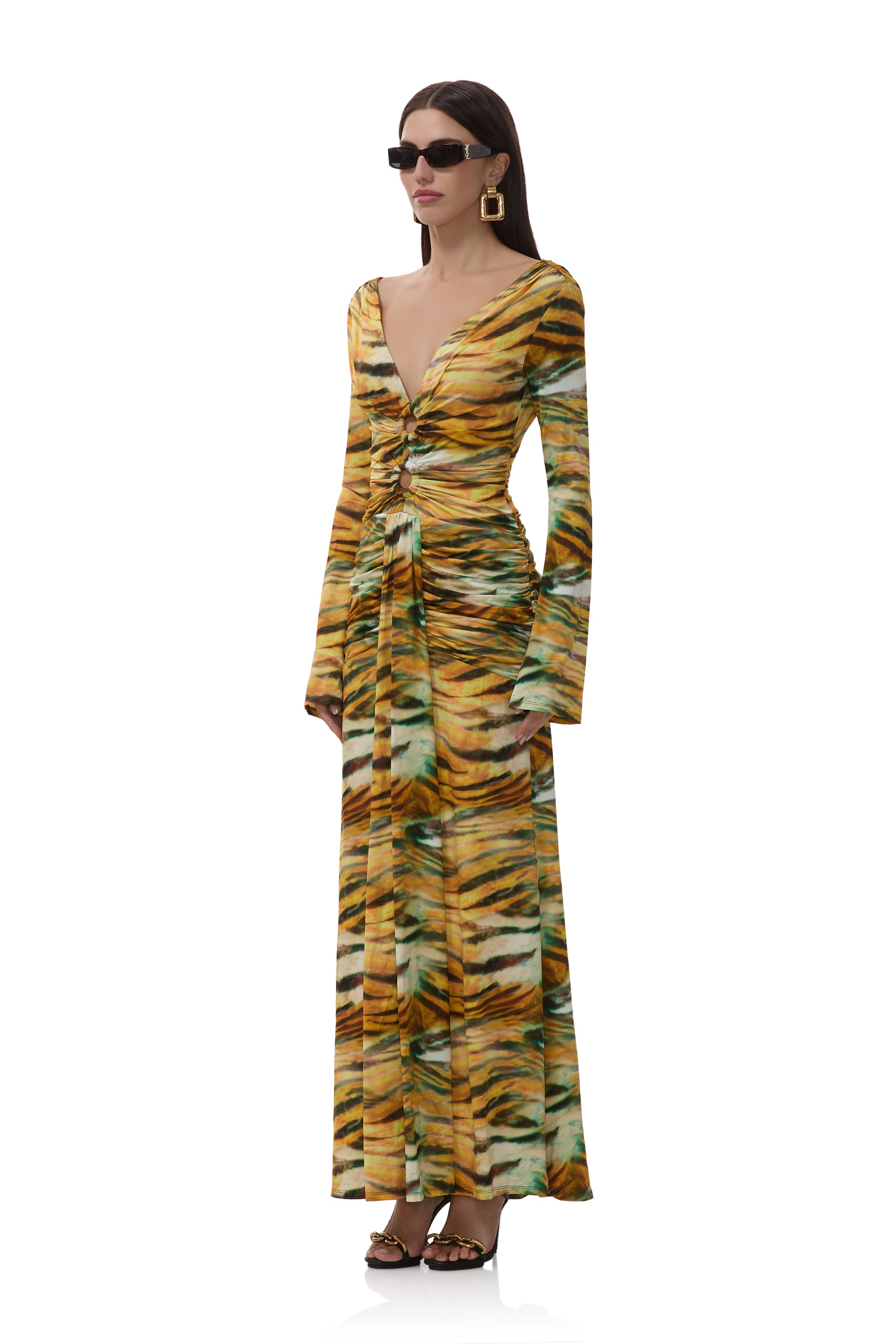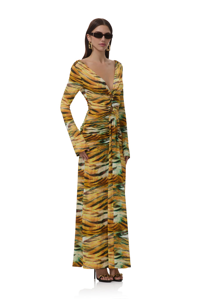 Make every moment unforgettable in the new Iko Dress. Featuring a romantic deep V neckline, delicate o-ring accents, and cascading waist details that flow effortlessly, she’s designed for warm nights, enchanting evenings, and your next head turning occasion. She comes in our newest Citron Tiger print.