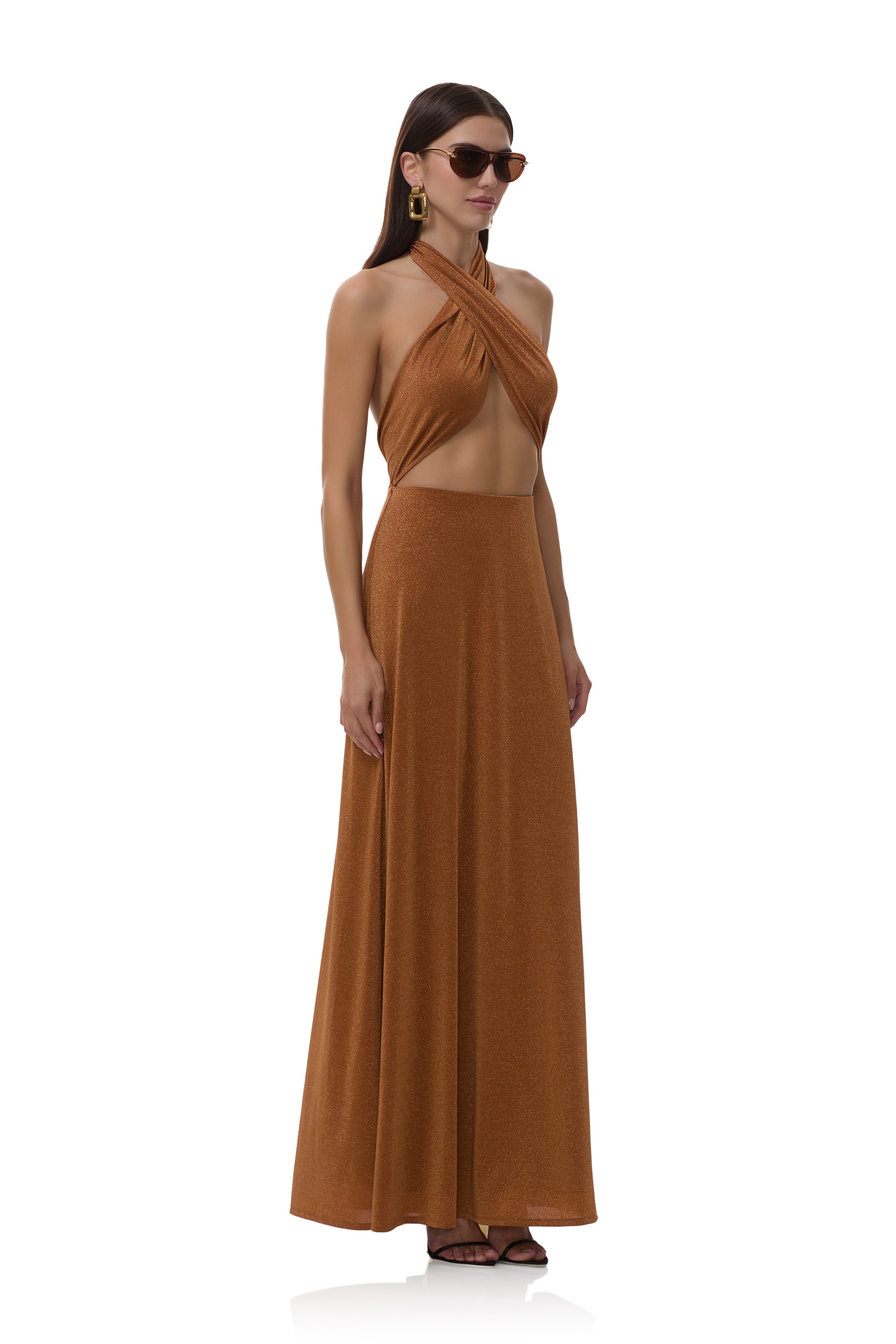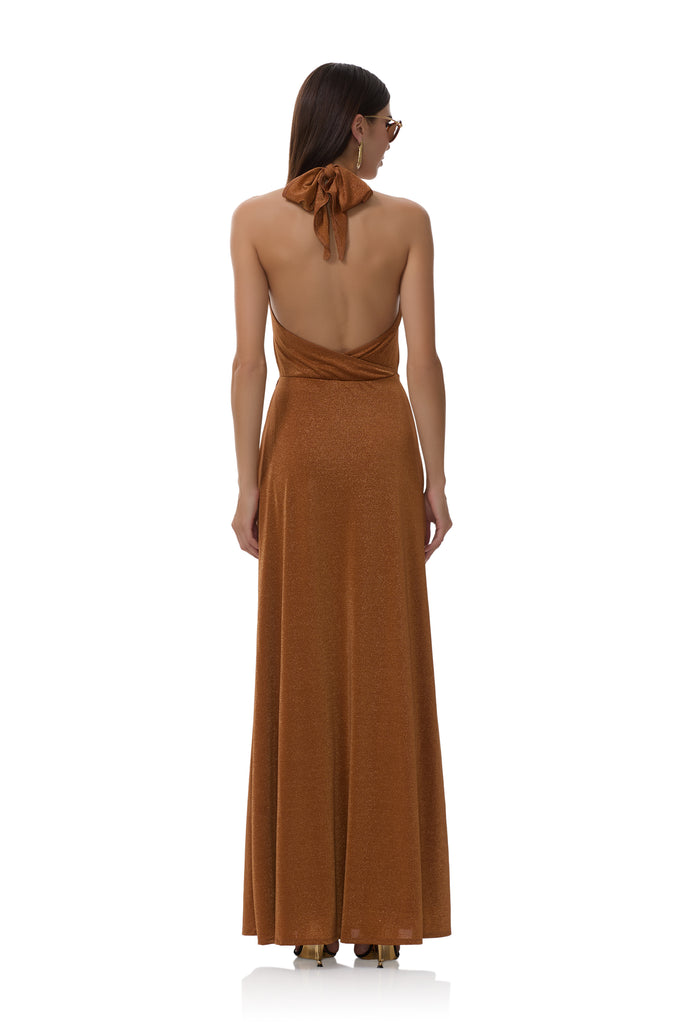 Dazzle at every occasion in the Kendrick Dress. Featuring a sultry halter neckline, a daring plunging front, and crafted from our best selling sparkle jersey, this luxurious fabric takes your look to the next level. Get ready to turn heads and say “yes” to every invite.
