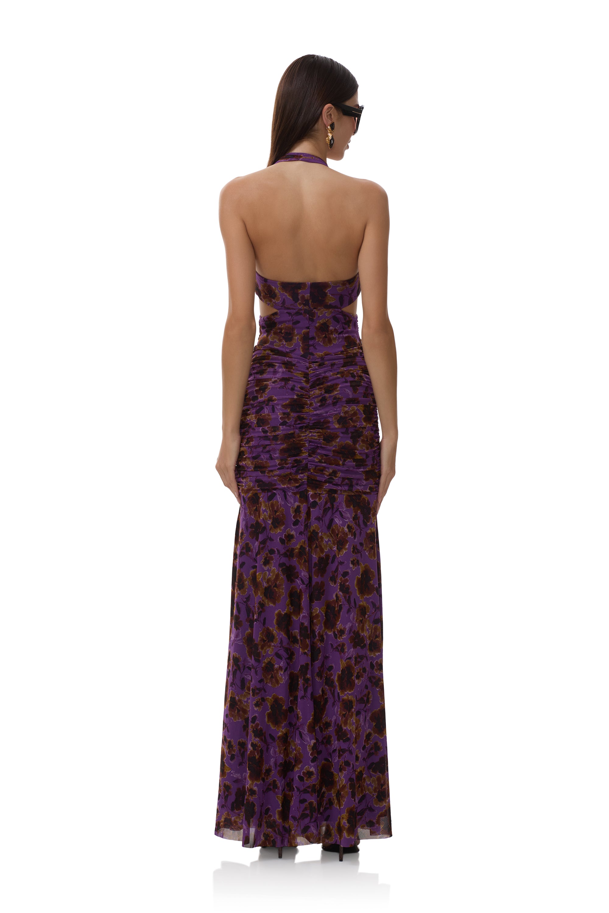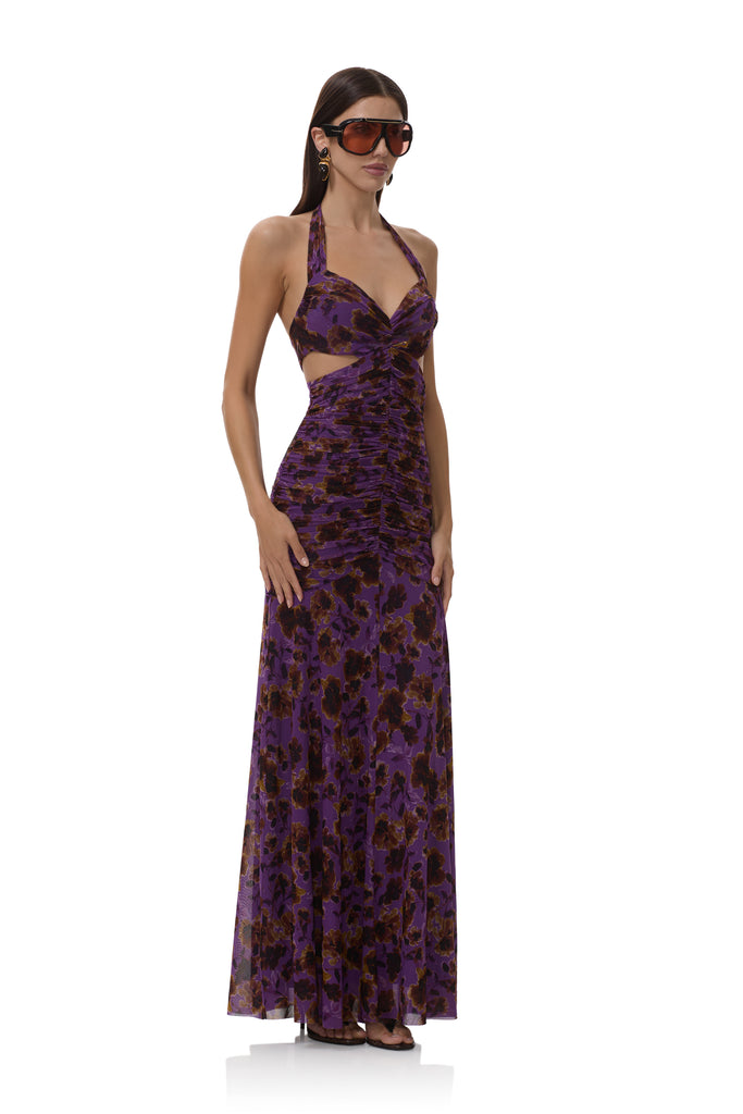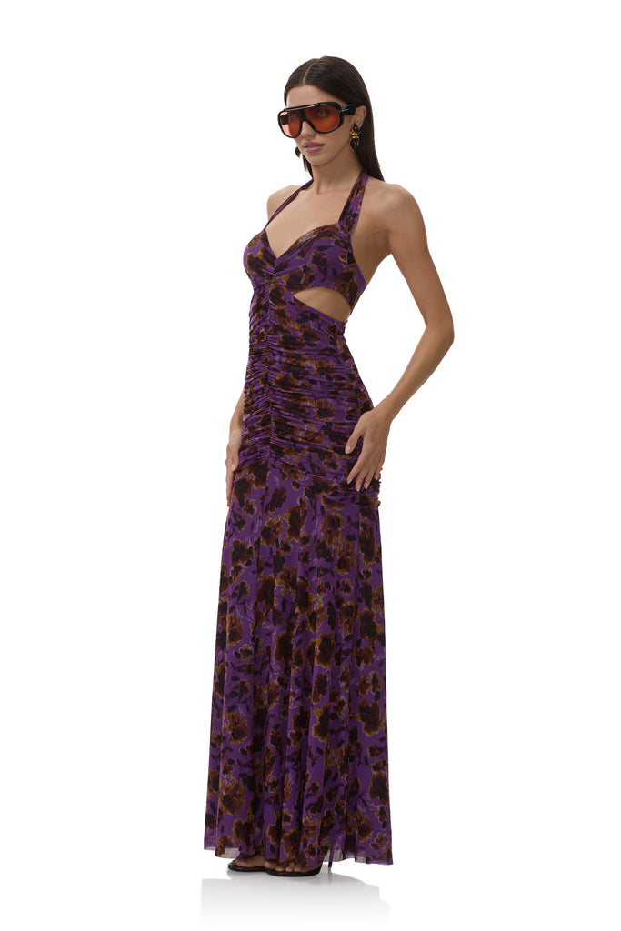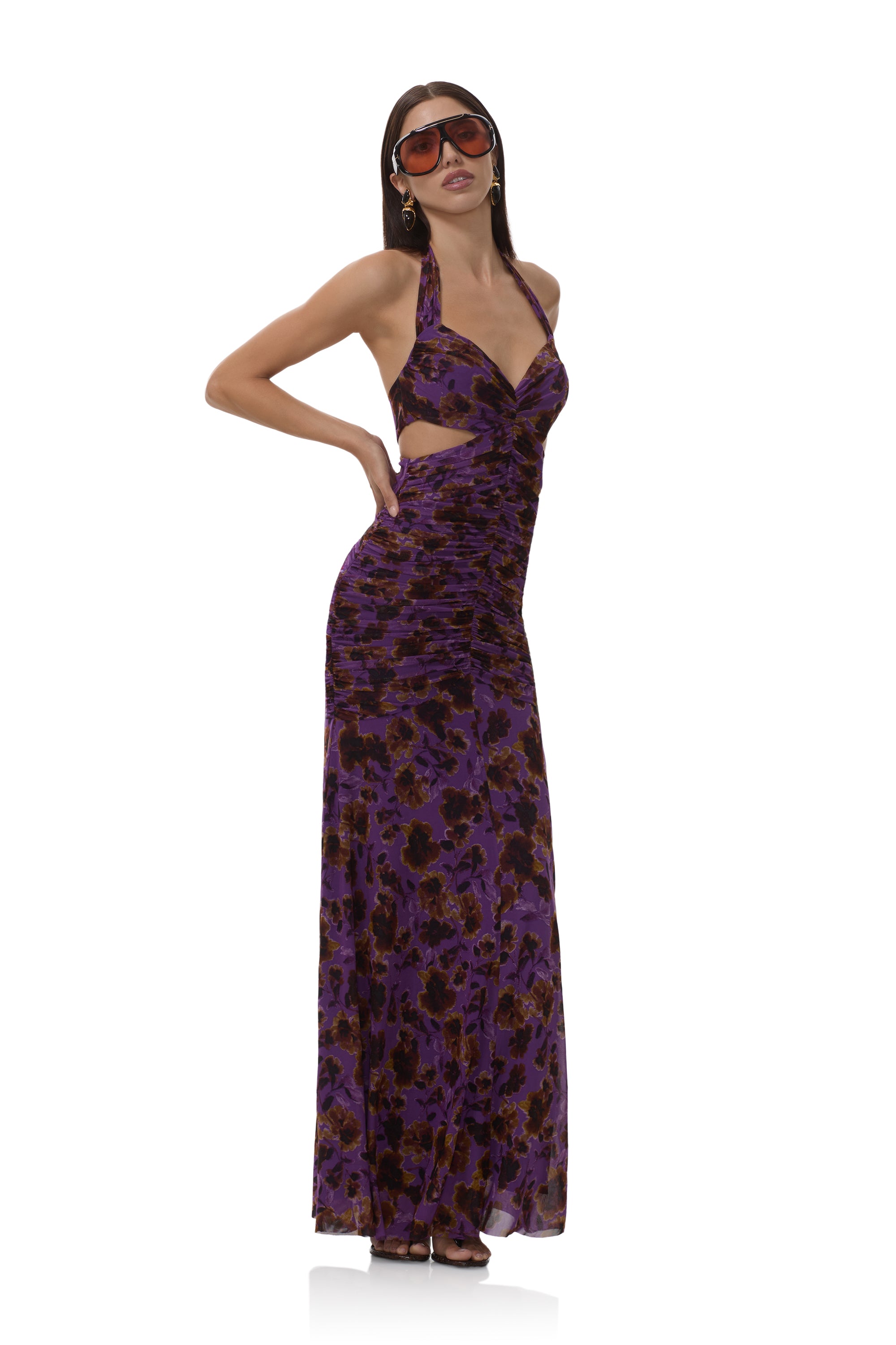 Turn heads this fall in the Lynn Dress, where drama meets romance. Designed with a halter neckline, daring cutout detailing, and all over ruching, Lynn beautifully contours the body while offering soft, flowy movement. Finished in our newest fall print, Violet Haze Flora, she’s made for your most captivating moments.