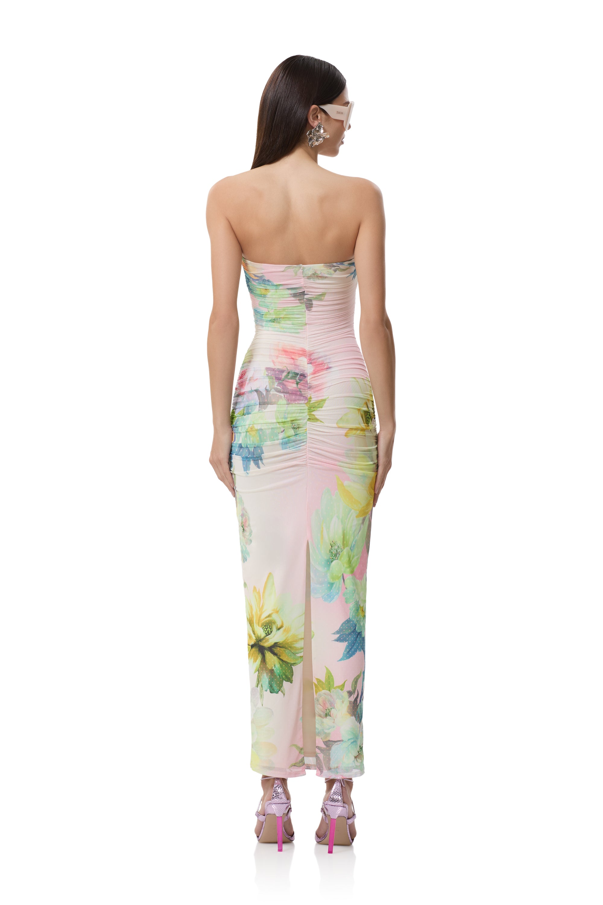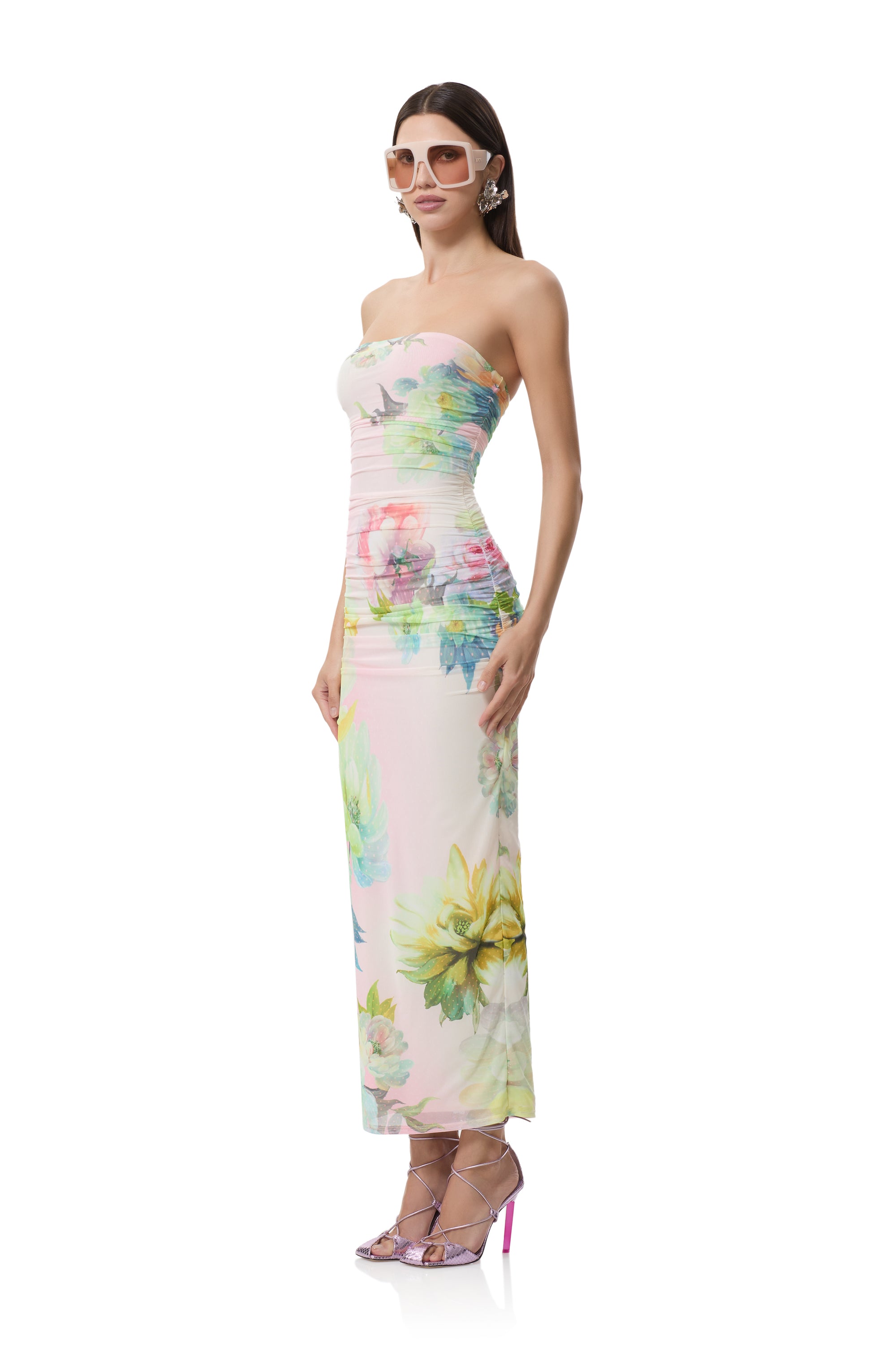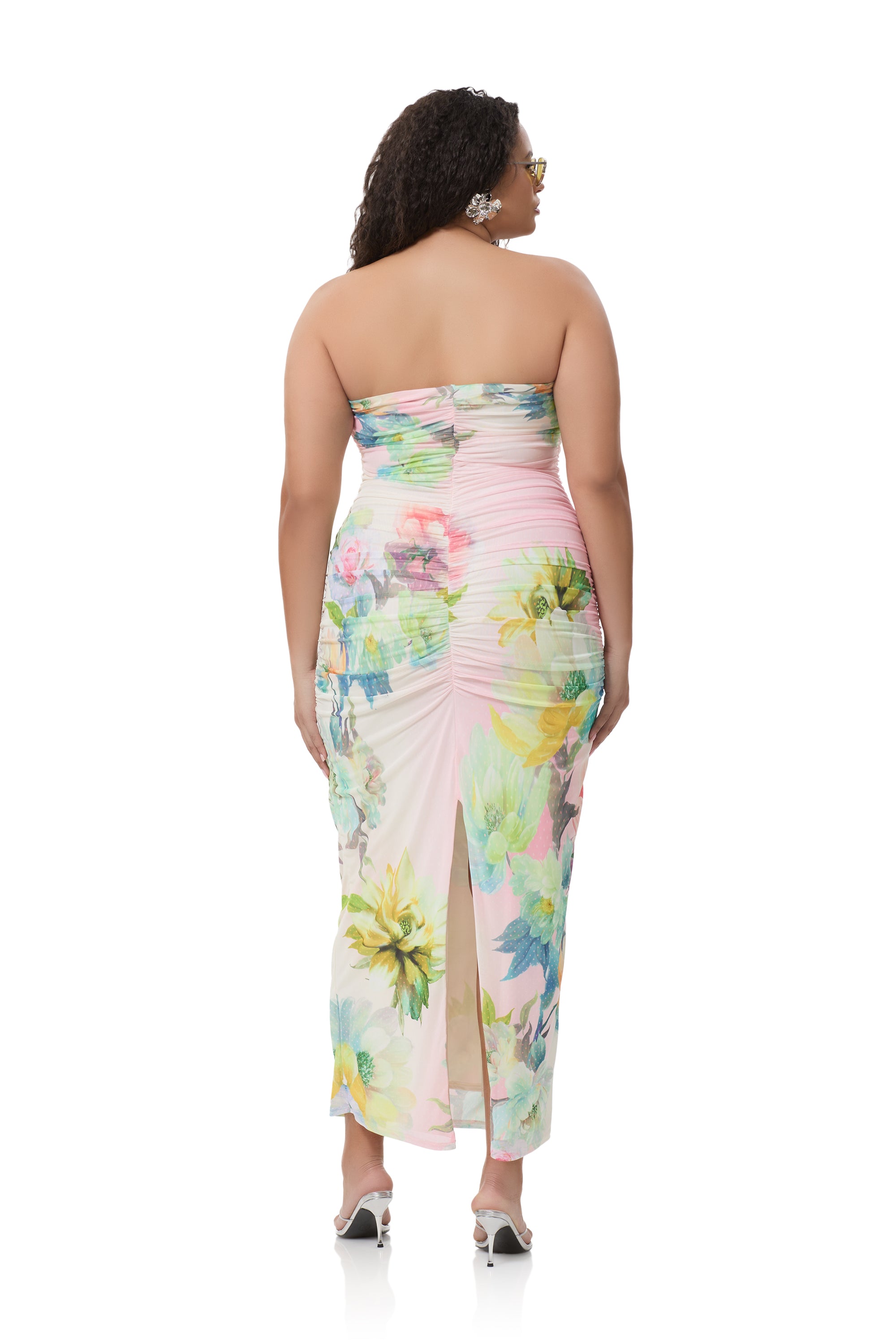 The definition of a warm weather closet staple, the Marlo strapless midi dress features ruching along the waist and hip with a clean column silhouette in a sheer mesh material. She comes in our latest Growing Roses placement print.
