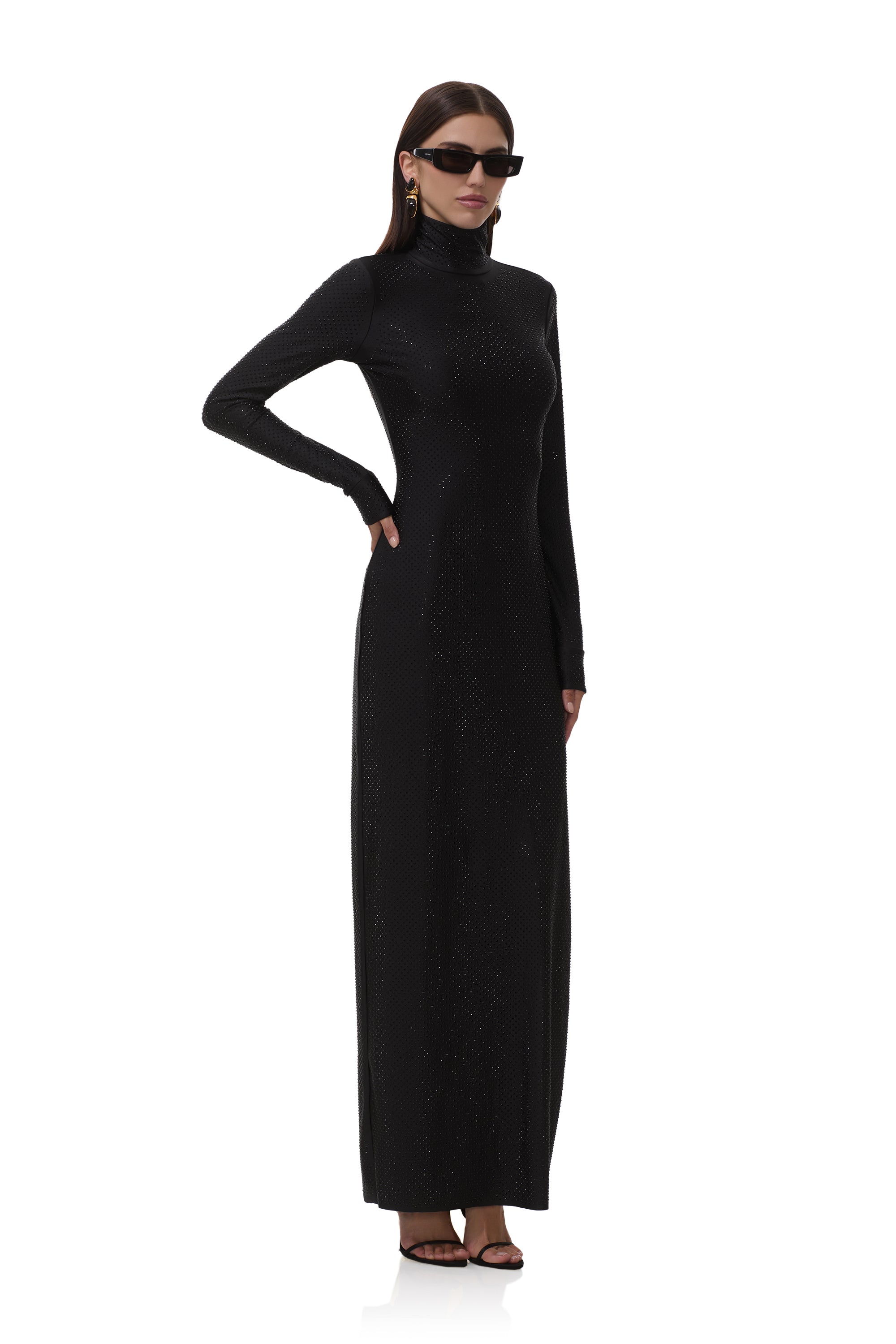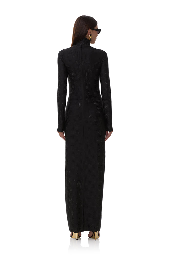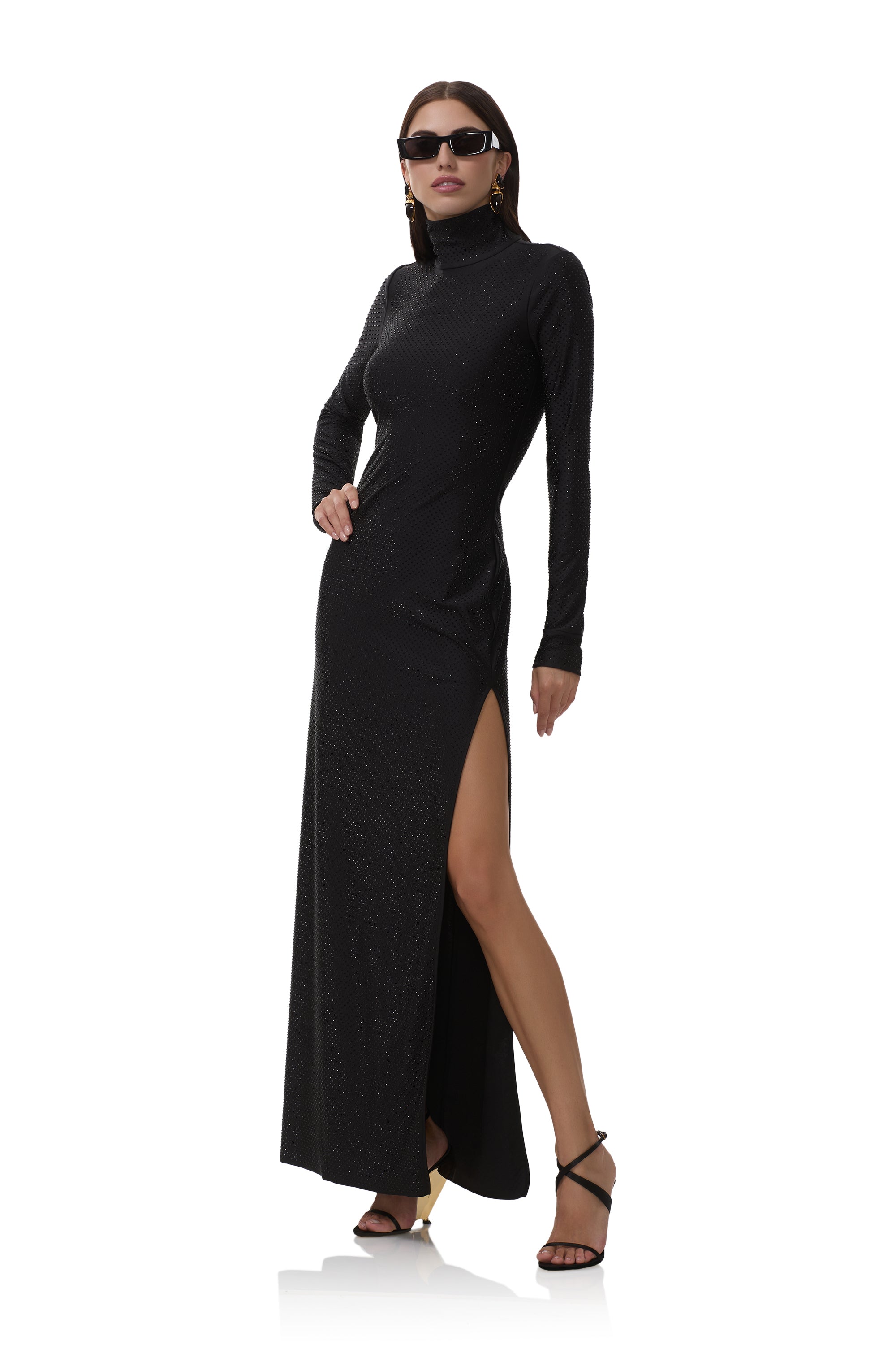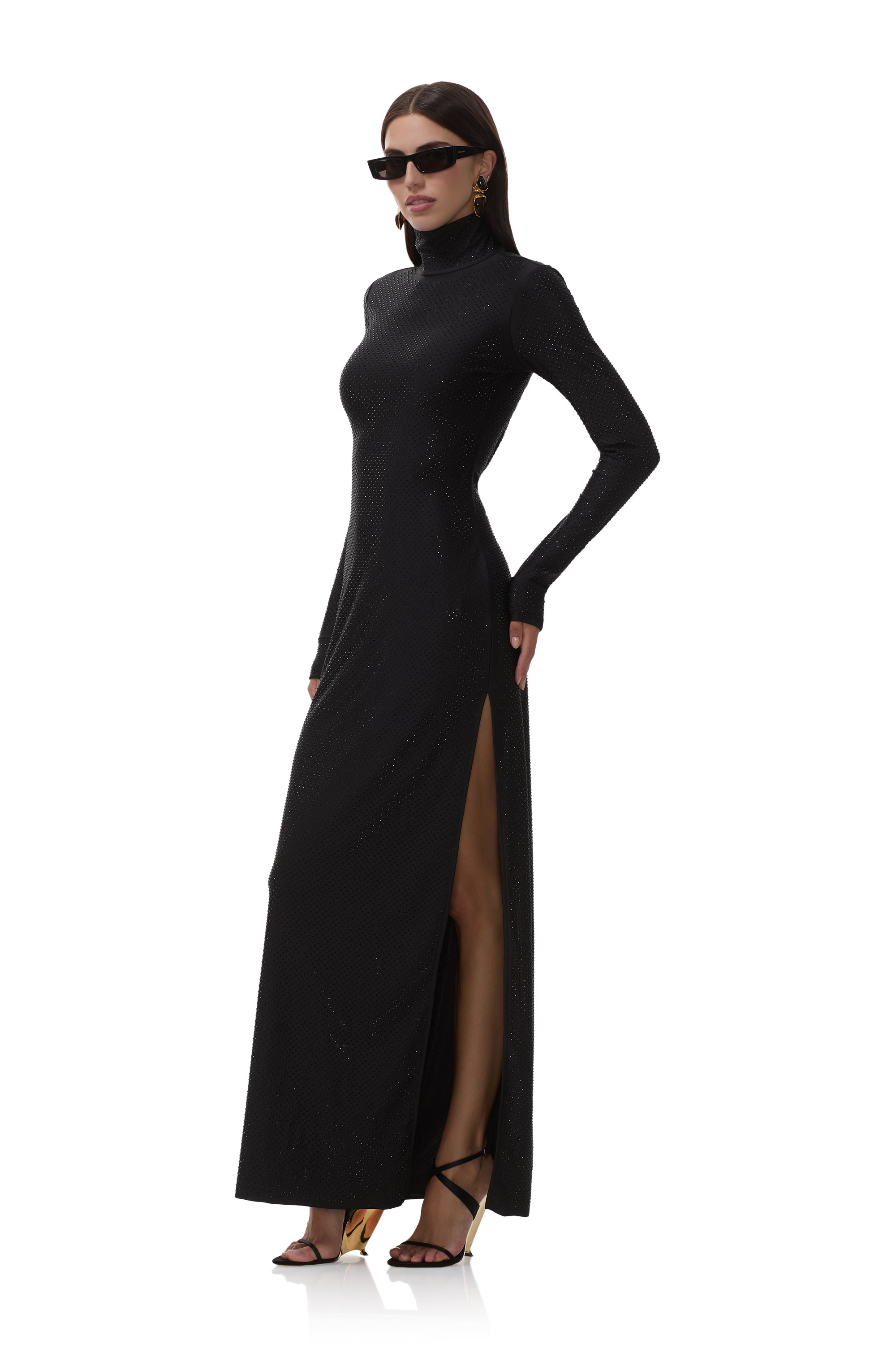 Step into the spotlight in this show stopping Mazie Studded Jersey Dress. Crafted with a sleek, figure flattering silhouette, Mazie features a mock neckline, long sleeves, and sparkling details that catch the light with every movement. A daring high side slit adds a touch of drama, making this dress perfect for evening events, holiday parties, or any occasion where you want to turn heads.
