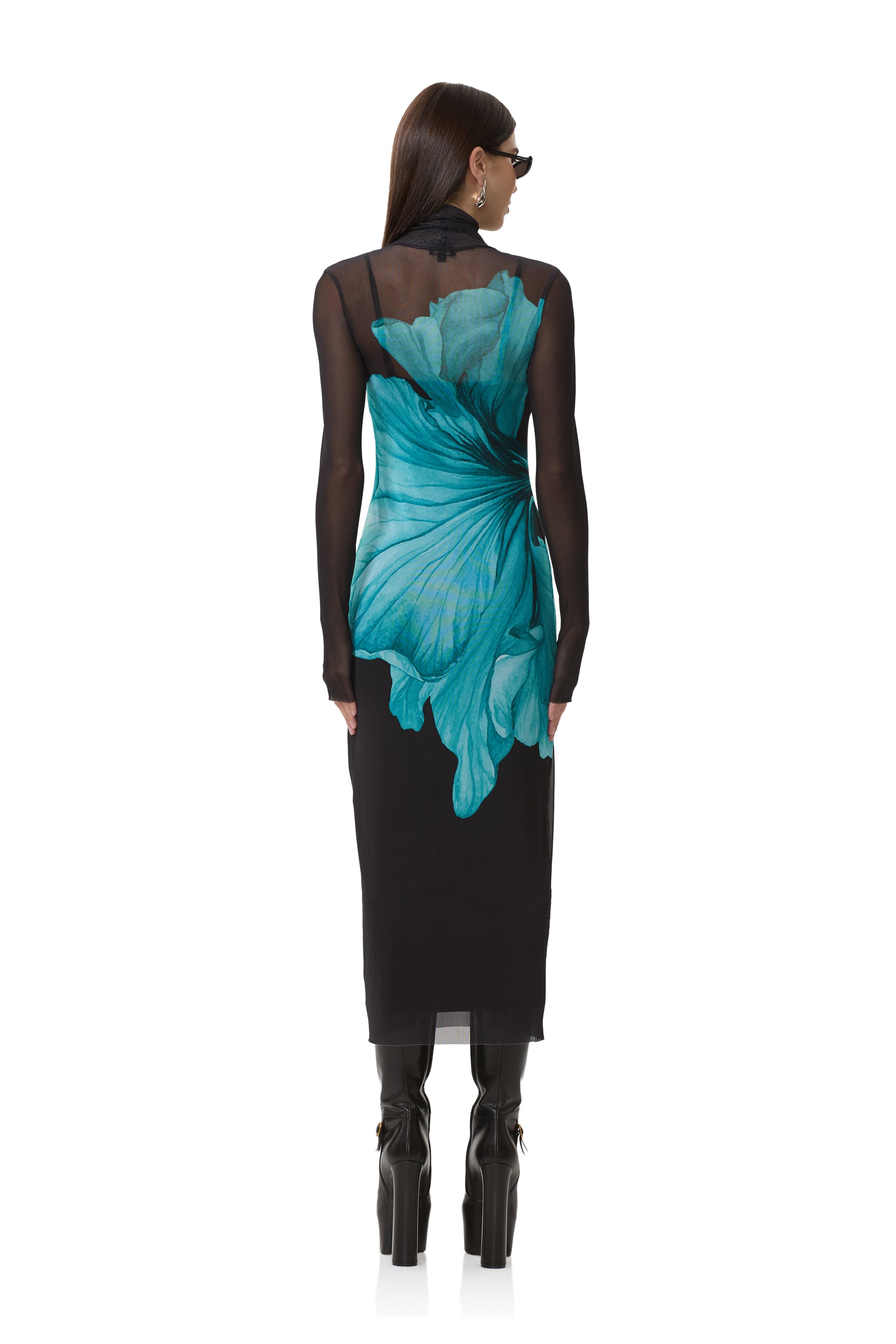 In a sheer power mesh in Teal Flower, the Shailene dress features a turtleneck and fitted midi silhouette. Her sleeve thumbholes add off-duty detail, and she comes in a pullover design that includes a removable slip.