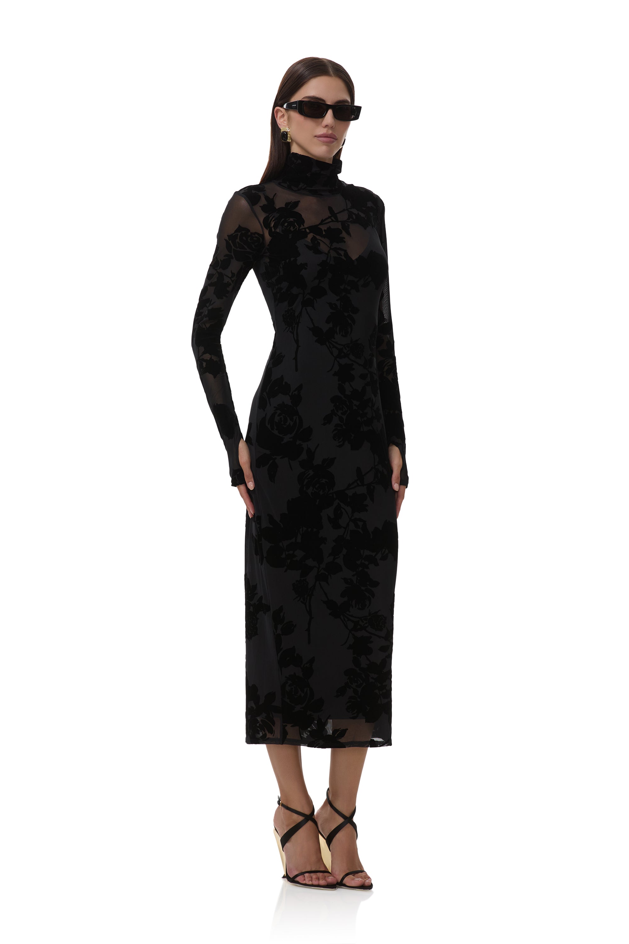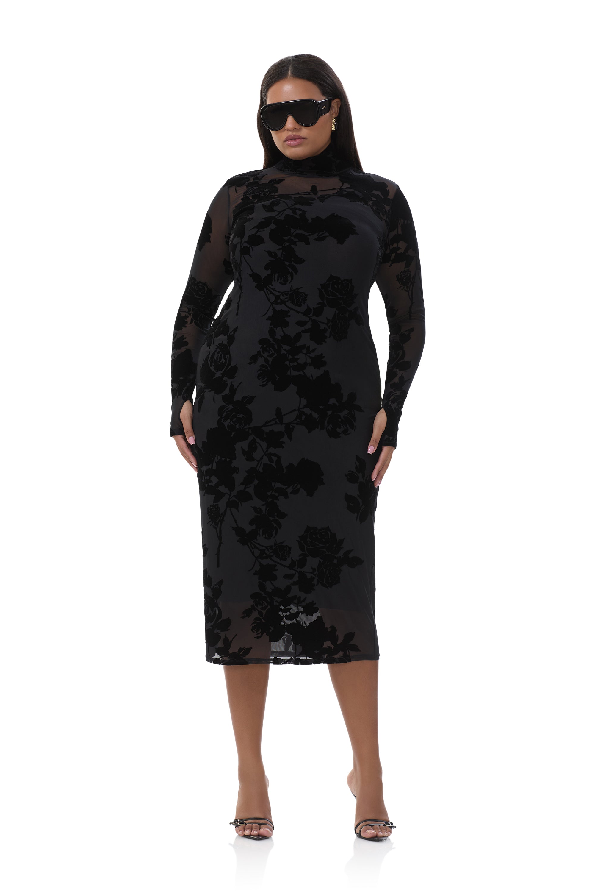 The iconic Shailene Dress is now reimagined in our newest luxe texture, flocked velvet.  She features a classic turtleneck, fitted midi silhouette, and signature street style thumbhole sleeves. She also comes in Cascade Rose with a pullover design that includes a removable slip.