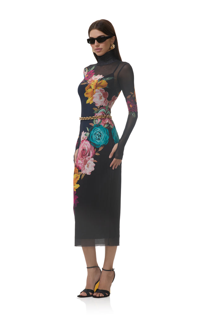 In a sheer power mesh in Navy Block Floral, the Shailene dress features a turtleneck and fitted midi silhouette. Her sleeve thumbholes add off-duty detail, and she comes in a pullover design that includes a removable slip.