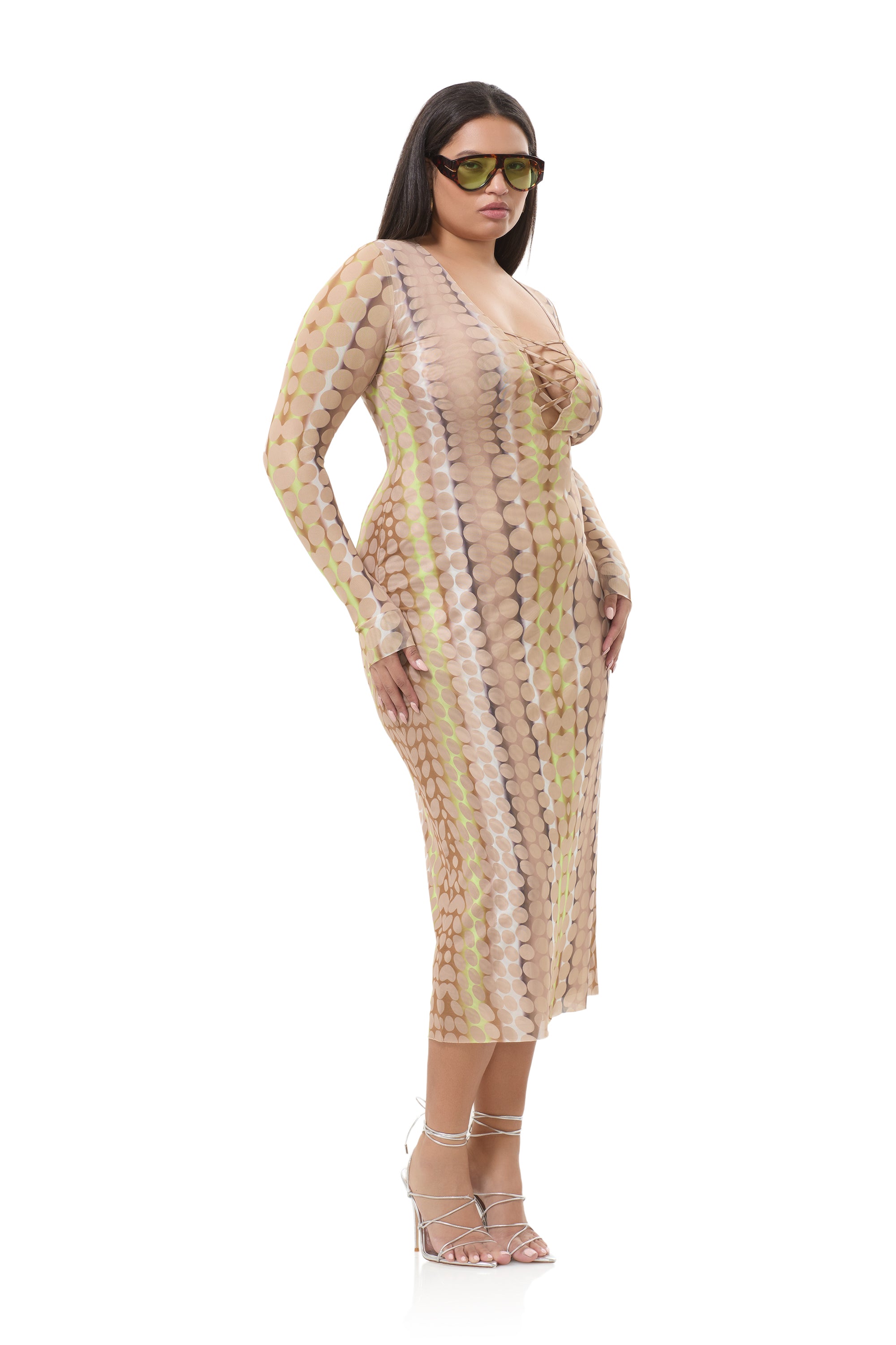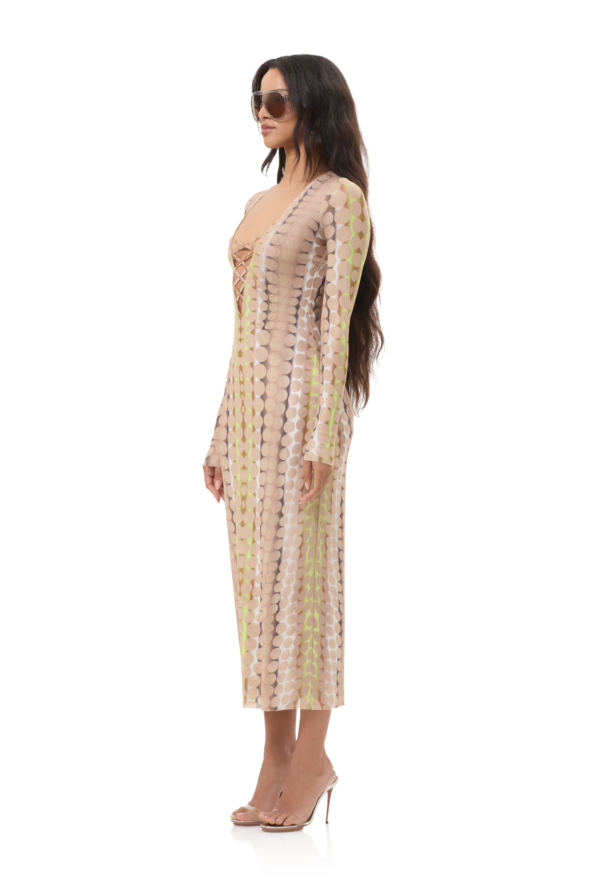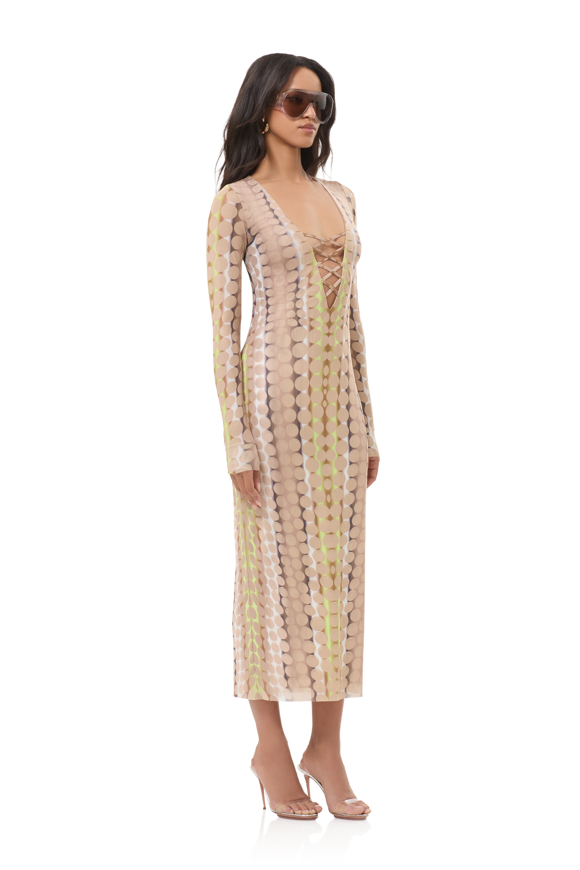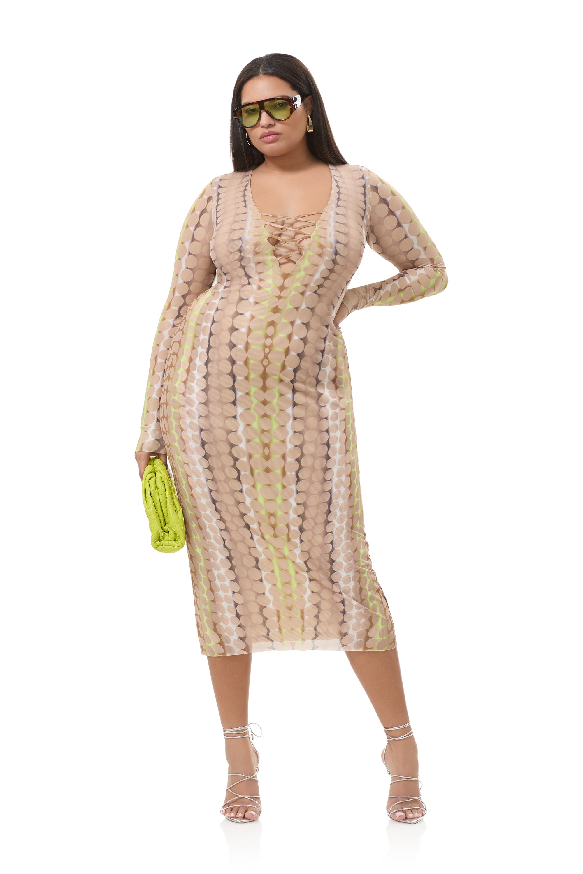 All eyes on the Cambria Dress, the true definition of sexy and chic. Featuring a daring plunge neckline and lace up accents, Cambria redefines sultry sophistication with a modern edge. Now available in our striking bold print, Tonal Dot.