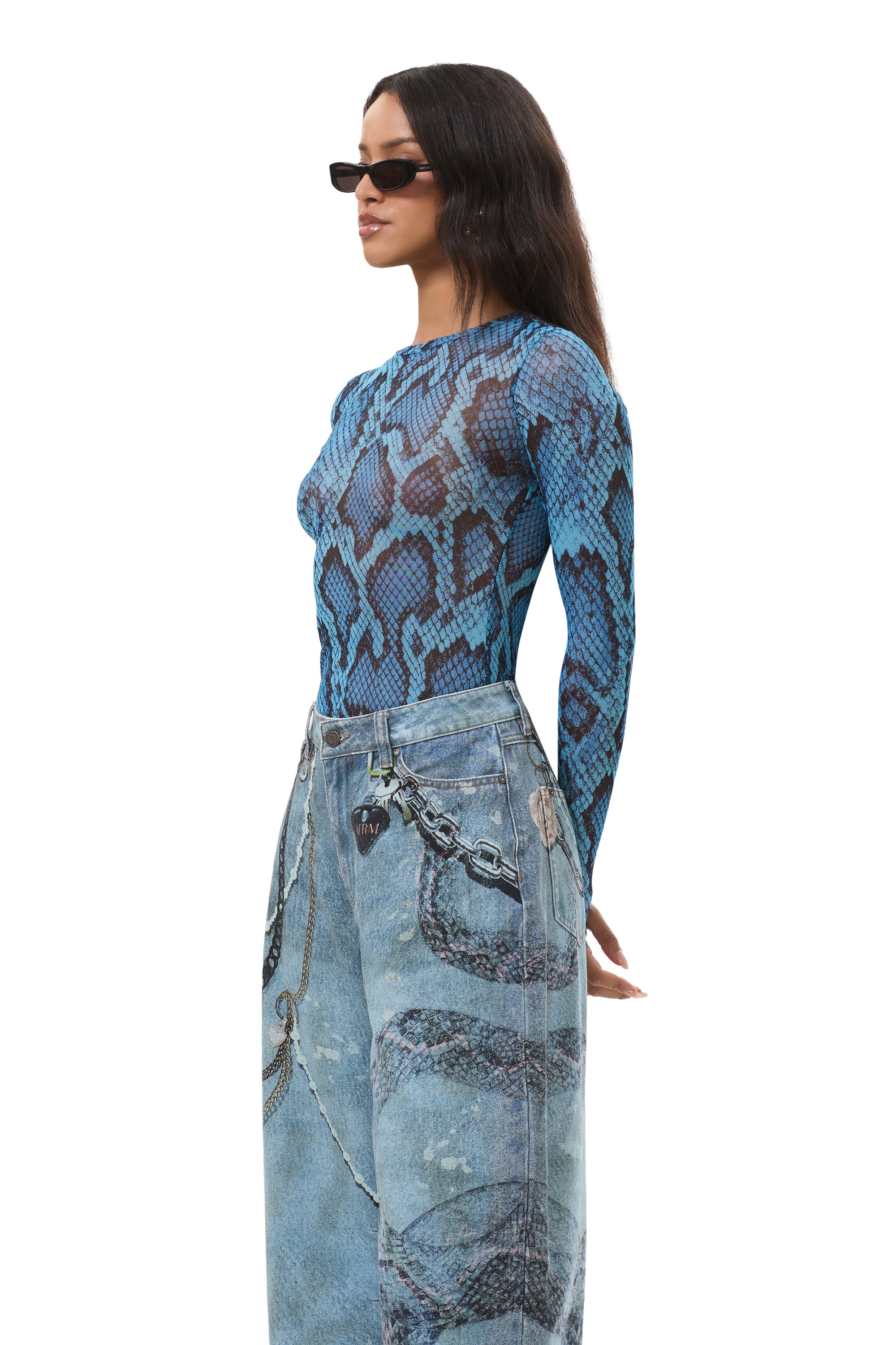 The Kaylee top features a sheer mesh material, crew neck and street-style thumbholes that lend an edgy update to off-duty style. She comes in Blue Fish Snake.