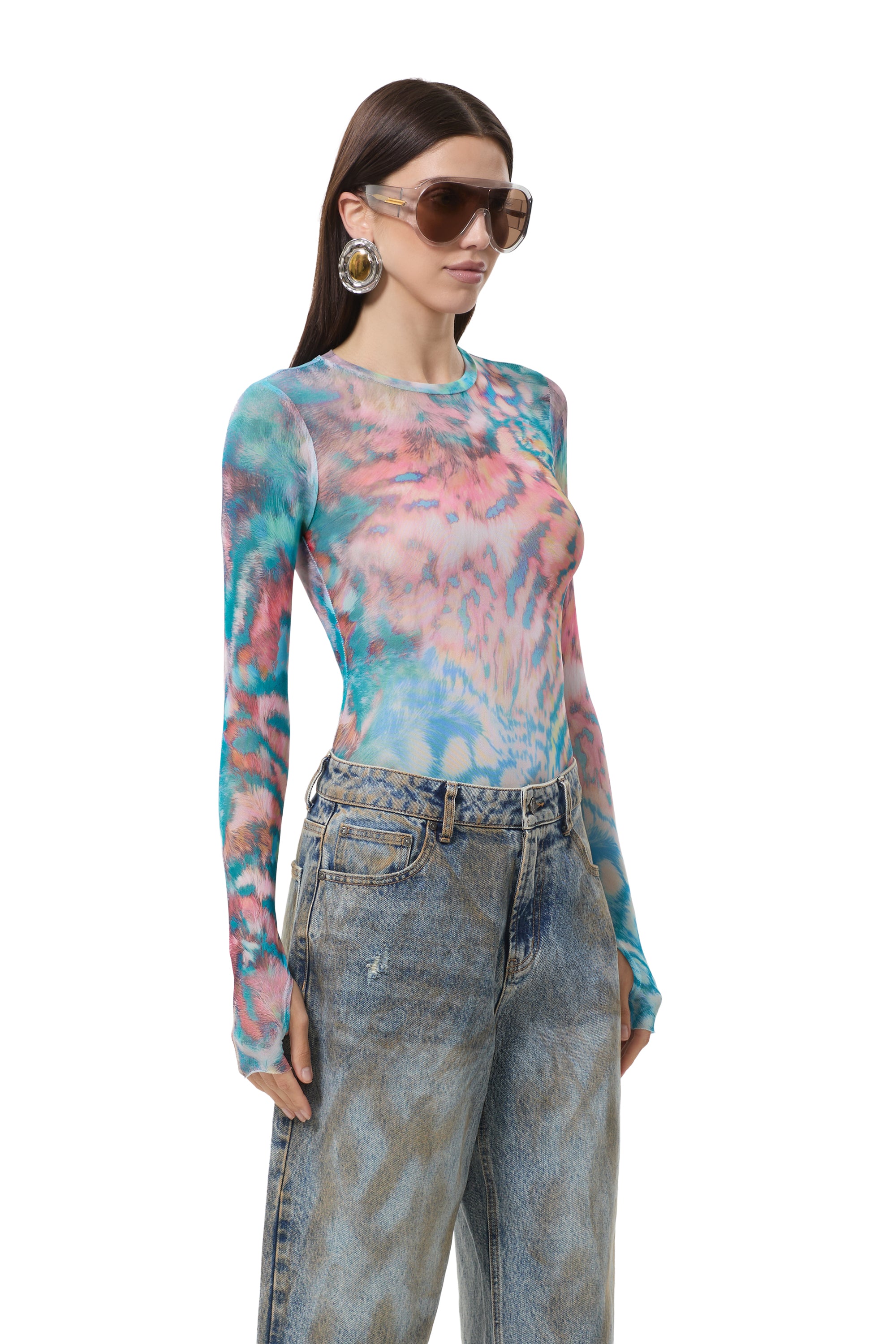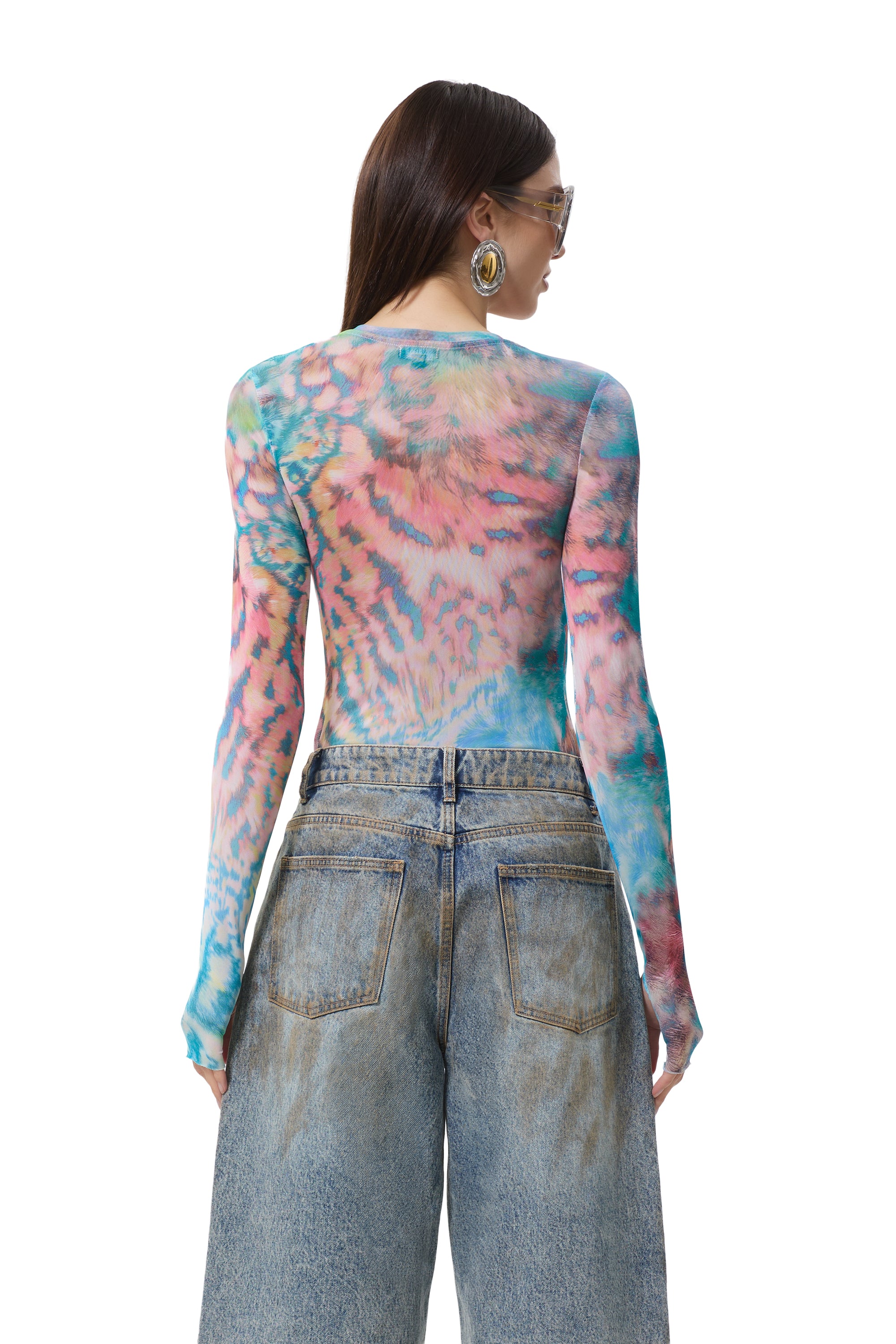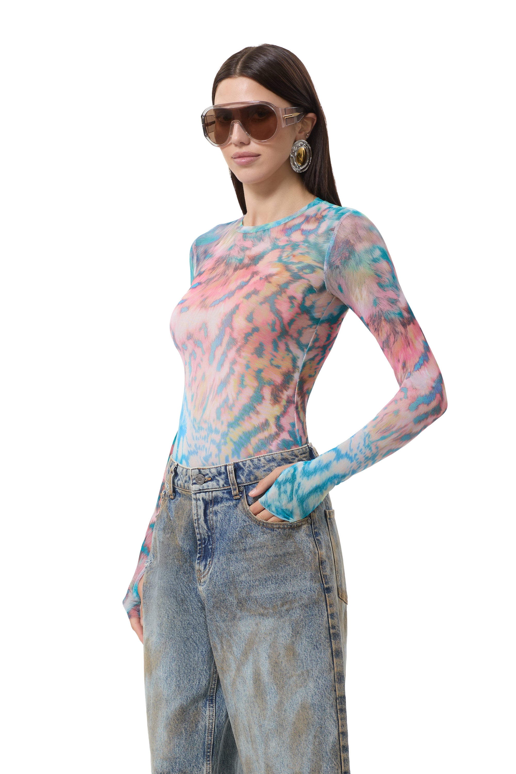 The Kaylee top features a sheer mesh material, crew neck and street-style thumbholes that lend an edgy update to off-duty style. She comes in Pastel Animal.
