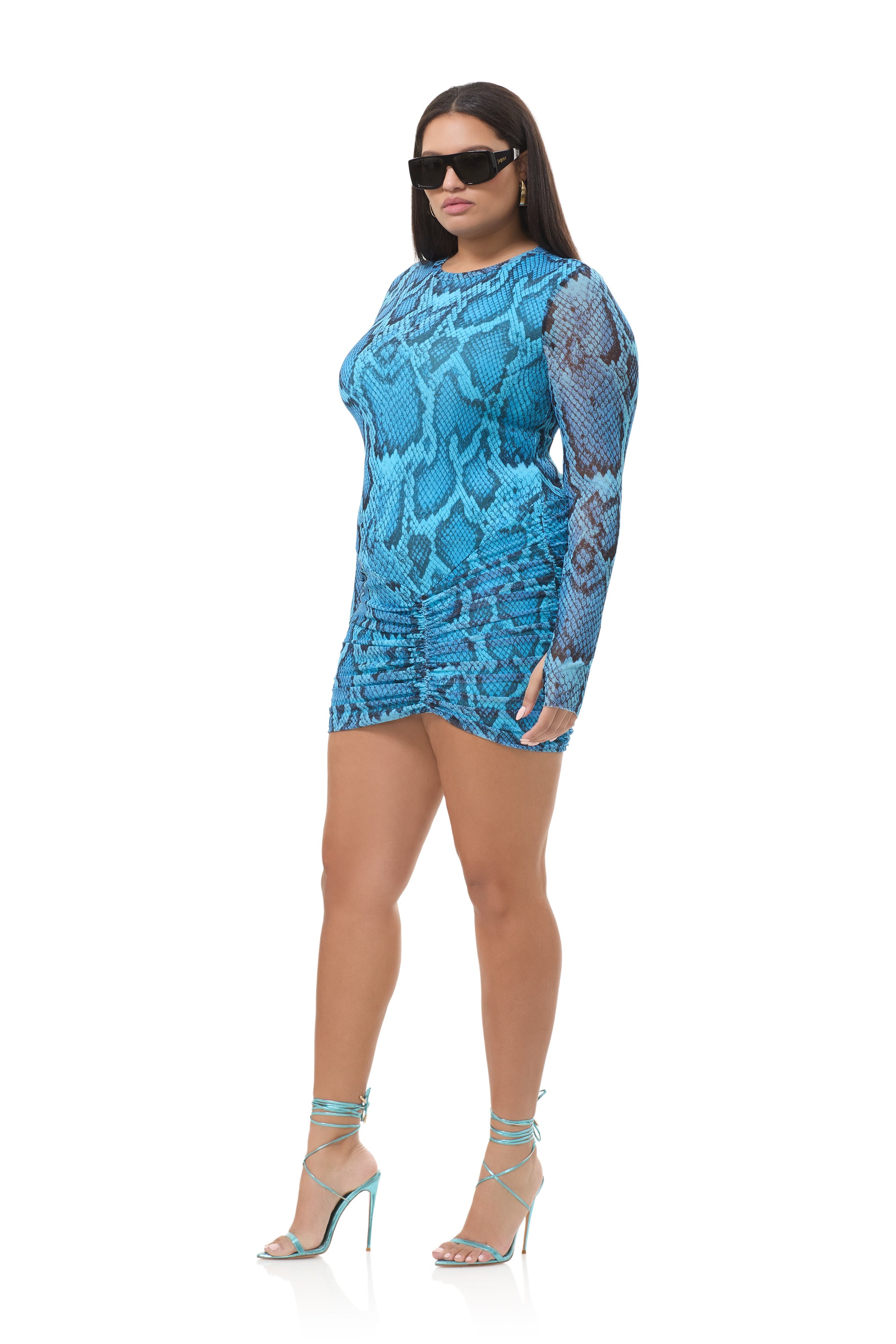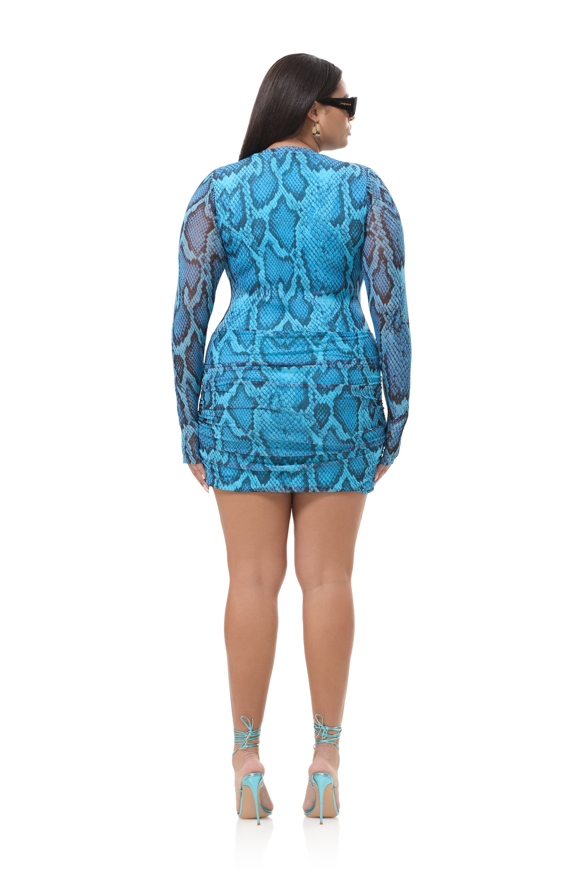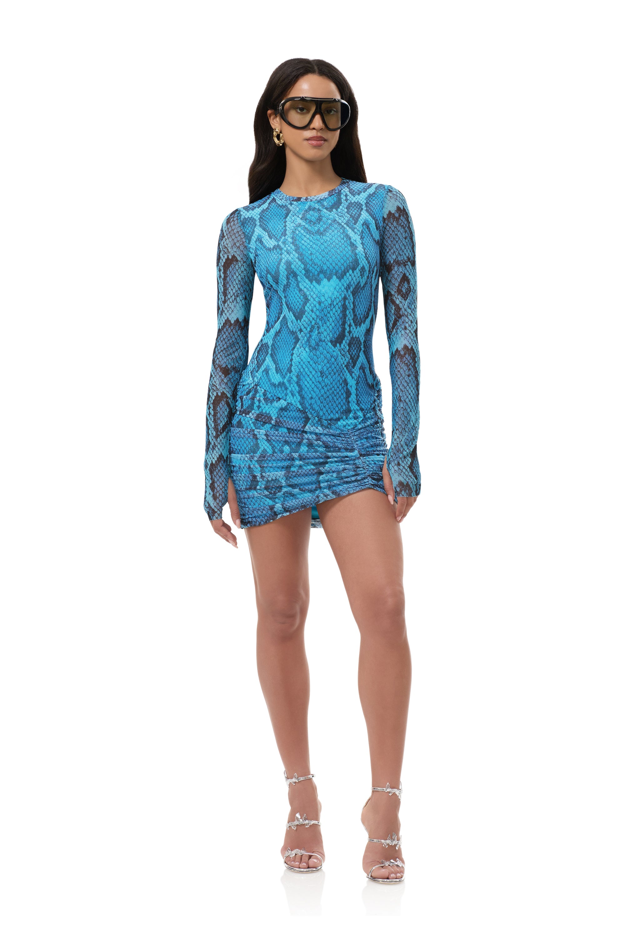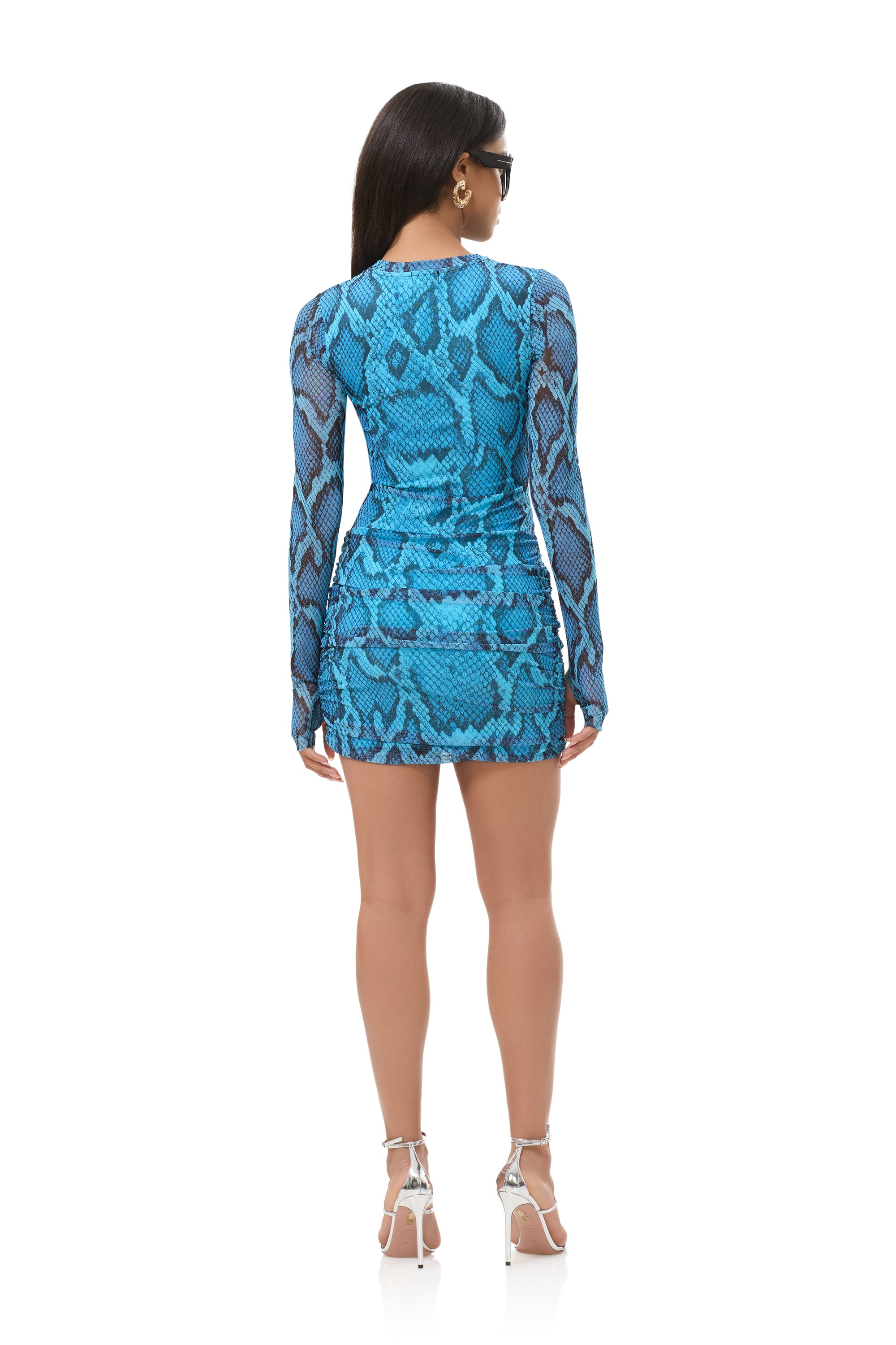 Have a mesh moment with the best selling Mirza crew neck mini dress. This body hugging silhouette finds balance in a sleek fit, drop waist details, and front ruching. She comes in our newest print, Blue Fish Snake.