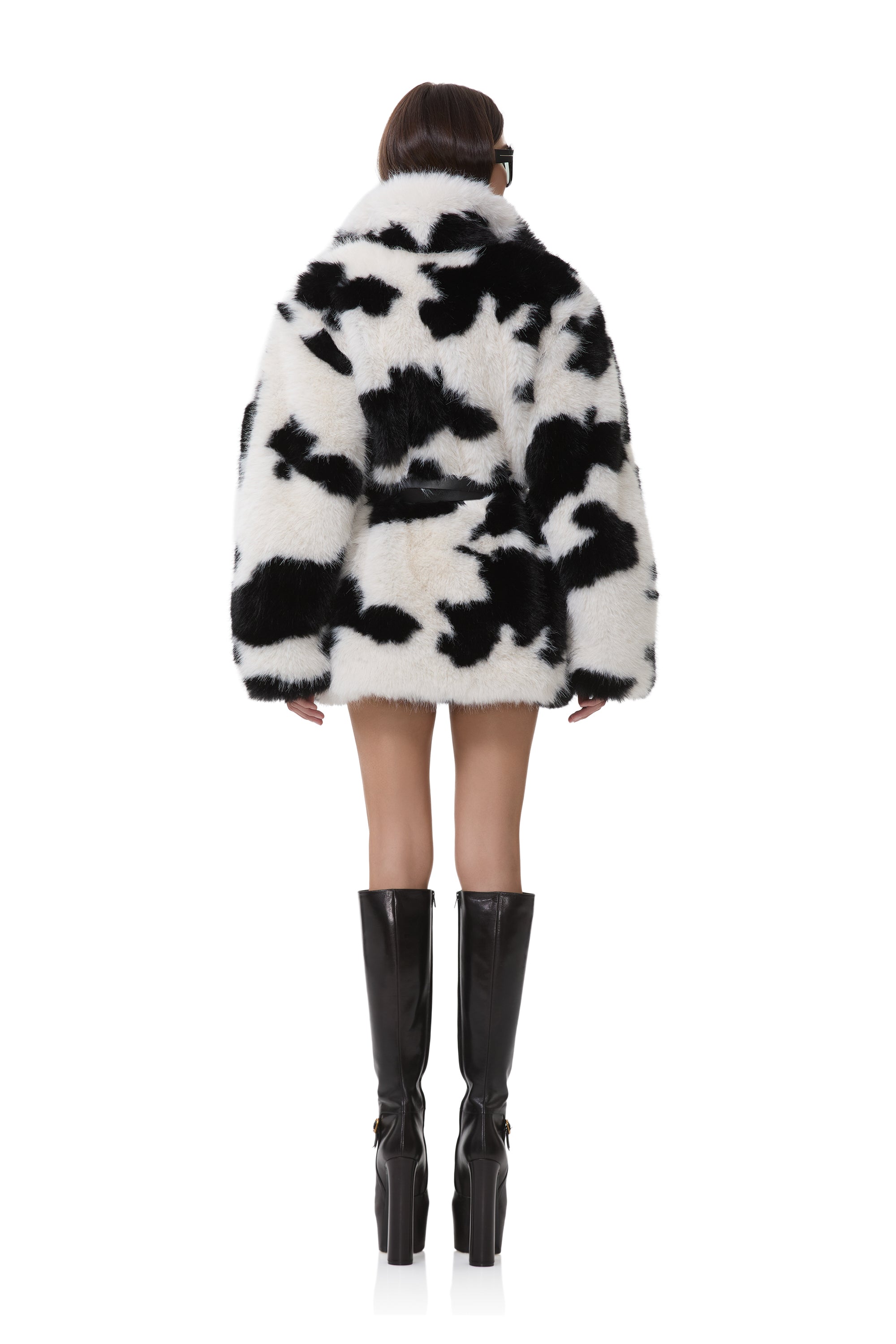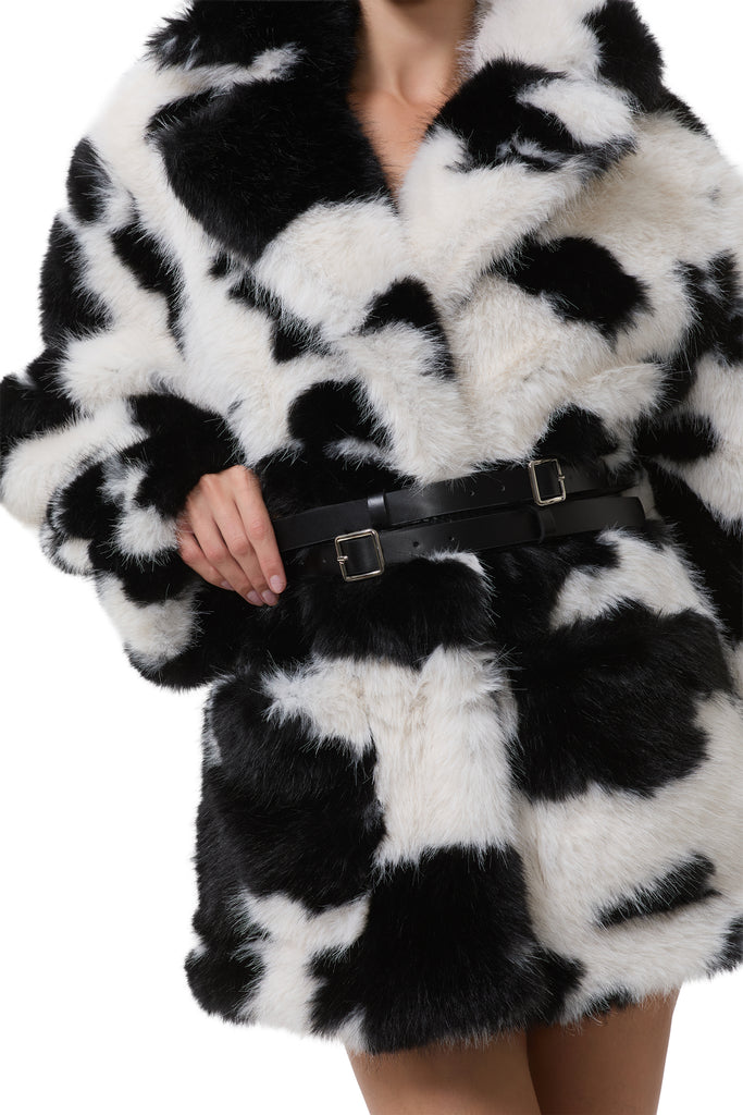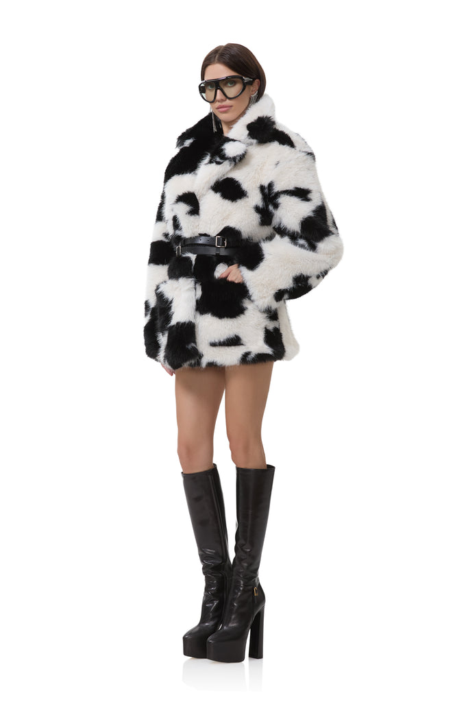 The definition of a statement fur jacket, meet the Livingston. This plush faux fur jacket is designed with a bold cattle print with a high fashion edge, pairing oversized volume with a double waist defining belt. Livingston is iconic, unapologetic, and designed to turn sidewalks into runways.