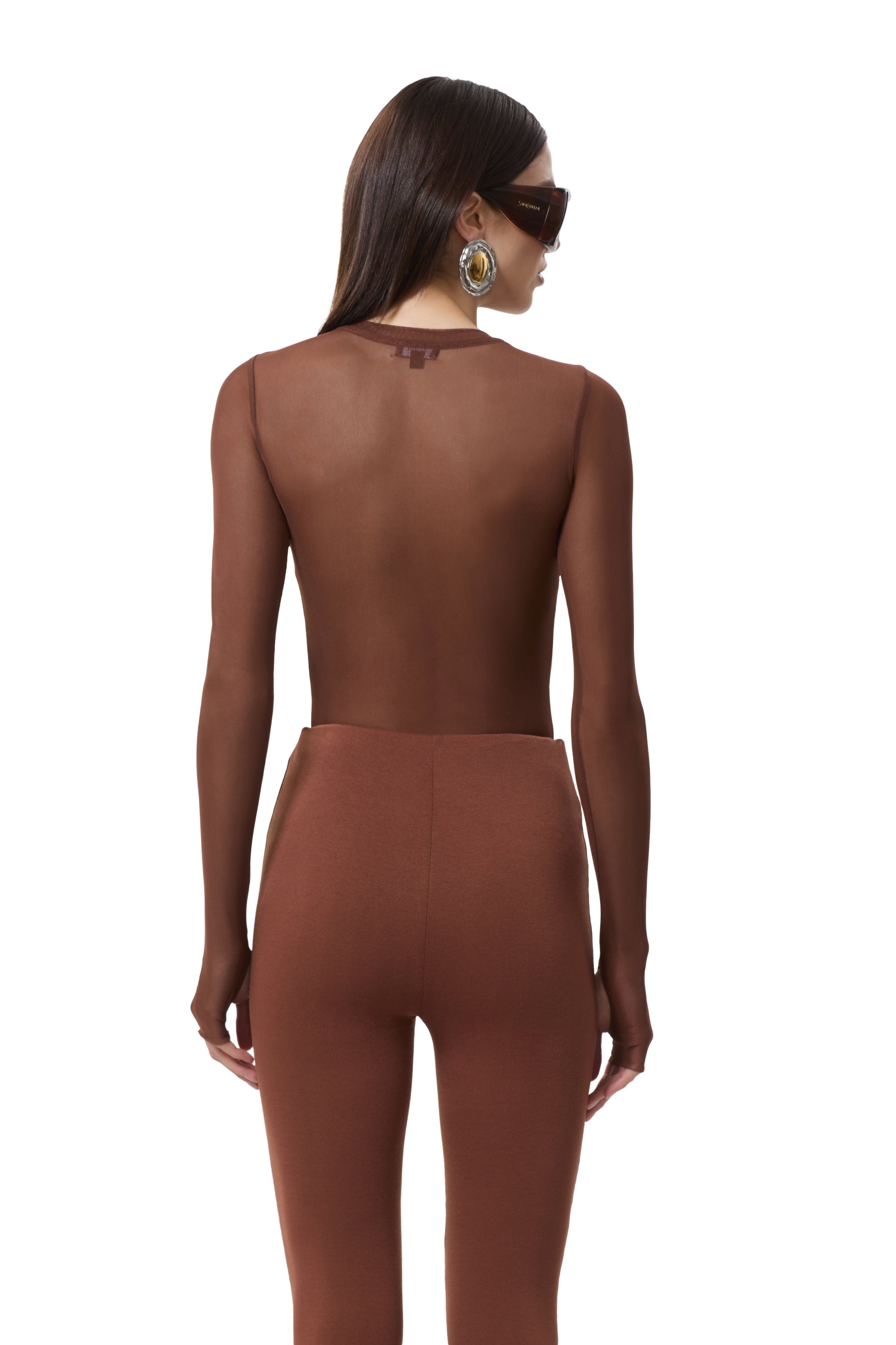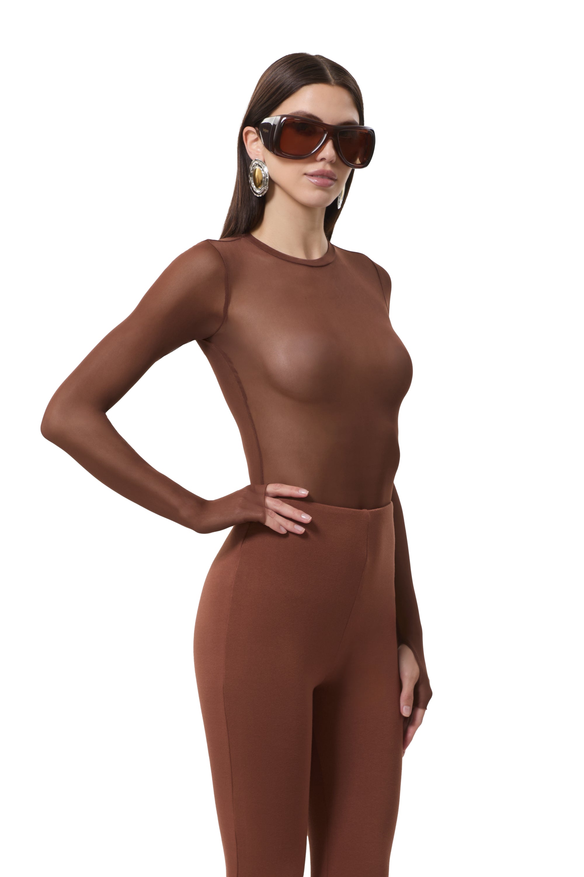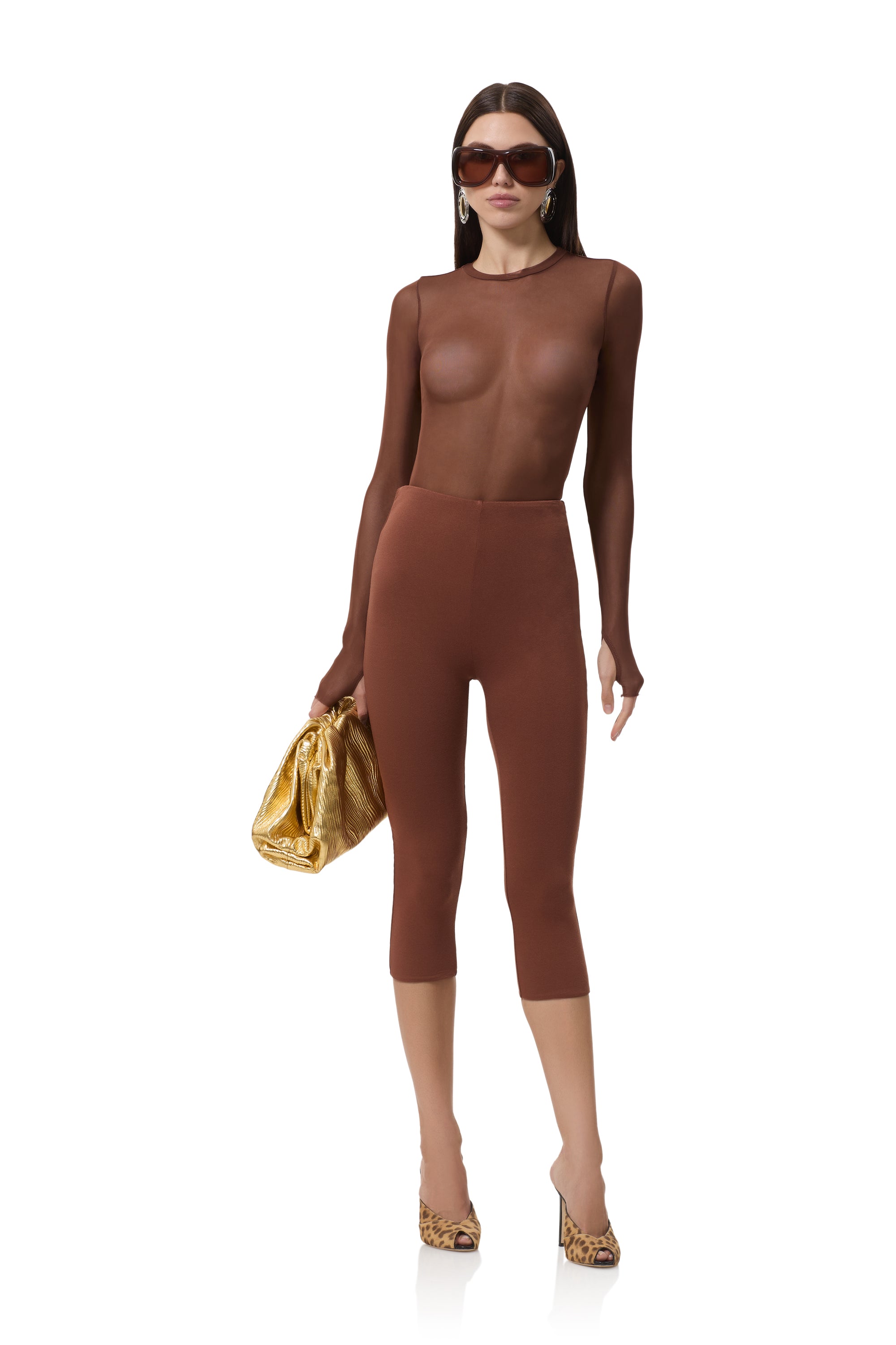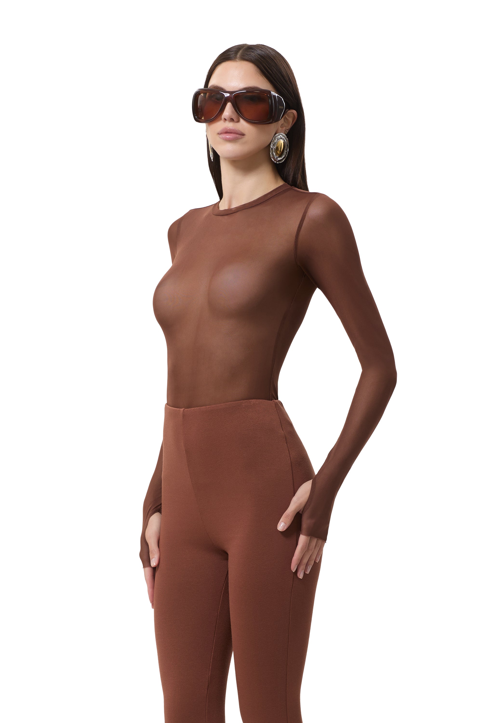 The Kaylee top features a sheer mesh material, crew neck and street-style thumbholes that lend an edgy update to off-duty style. She comes in Cappuccino.