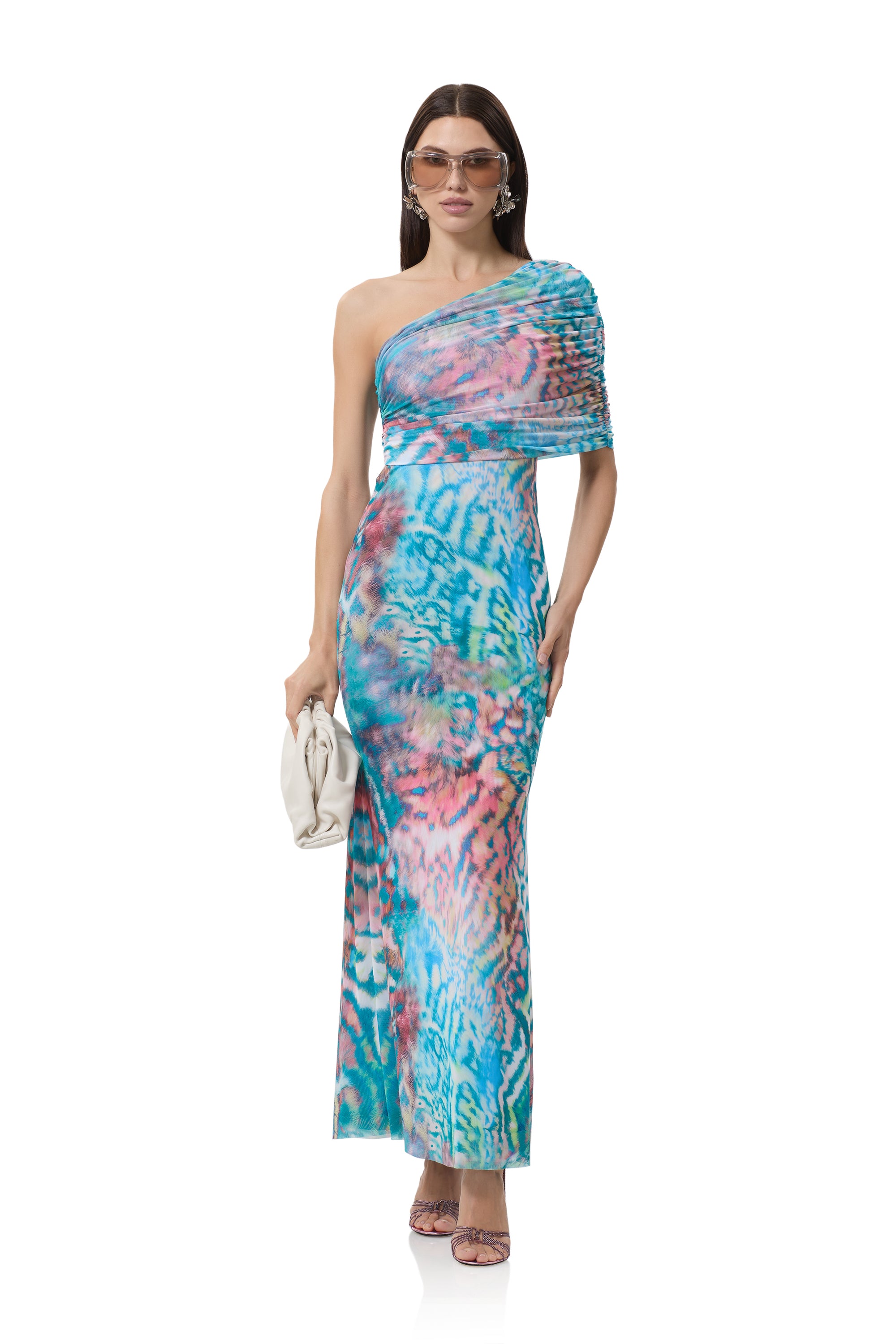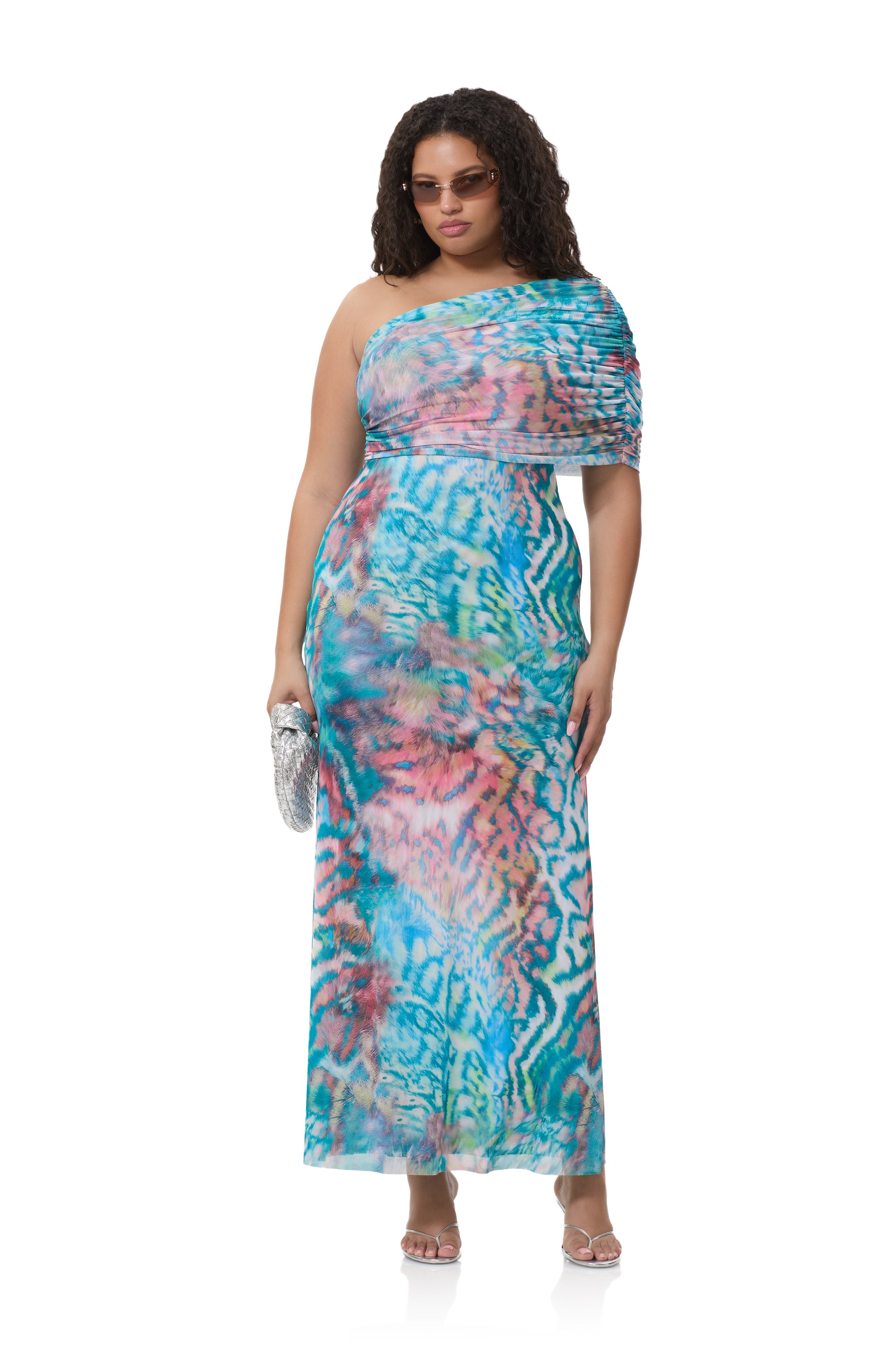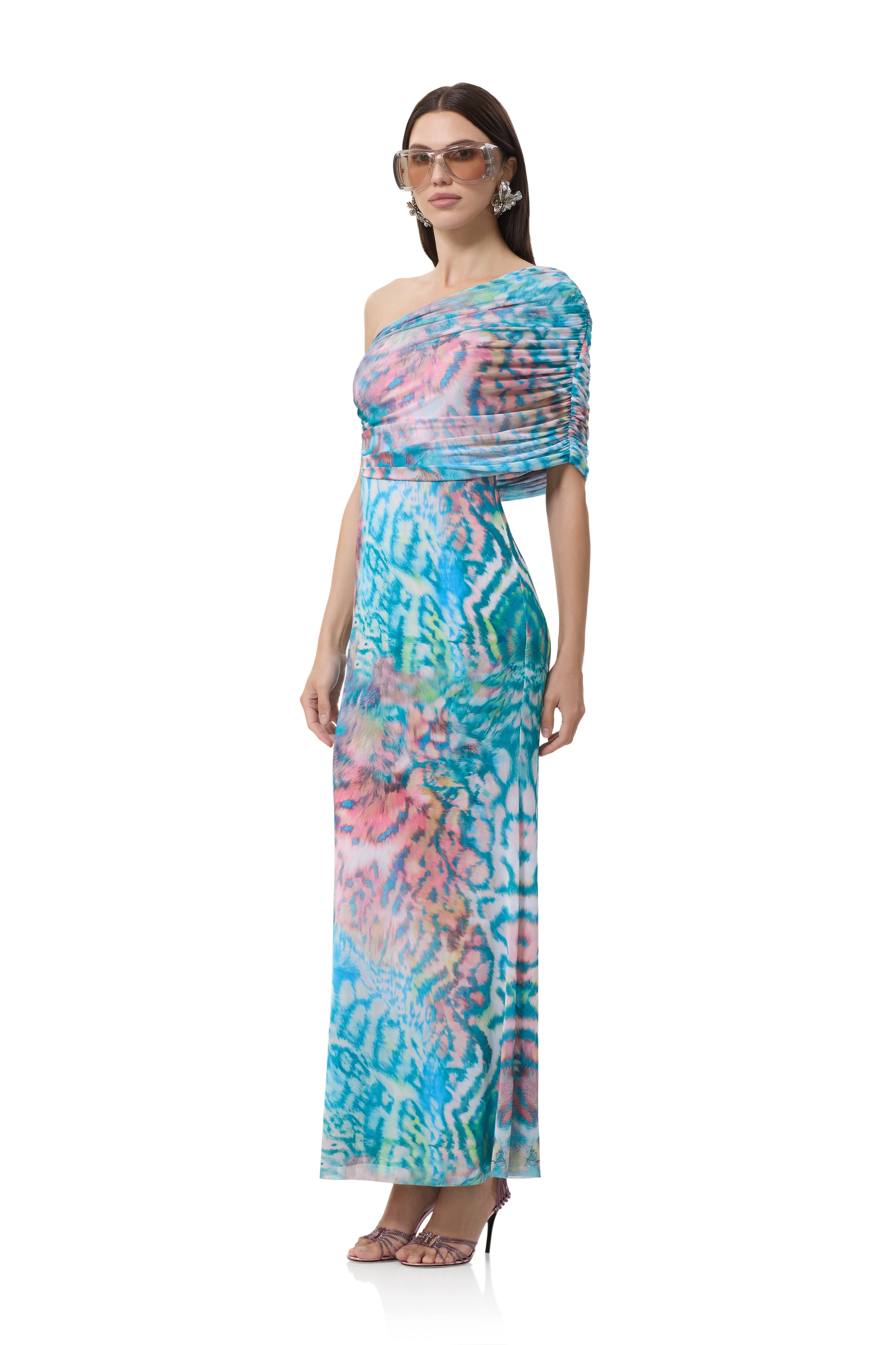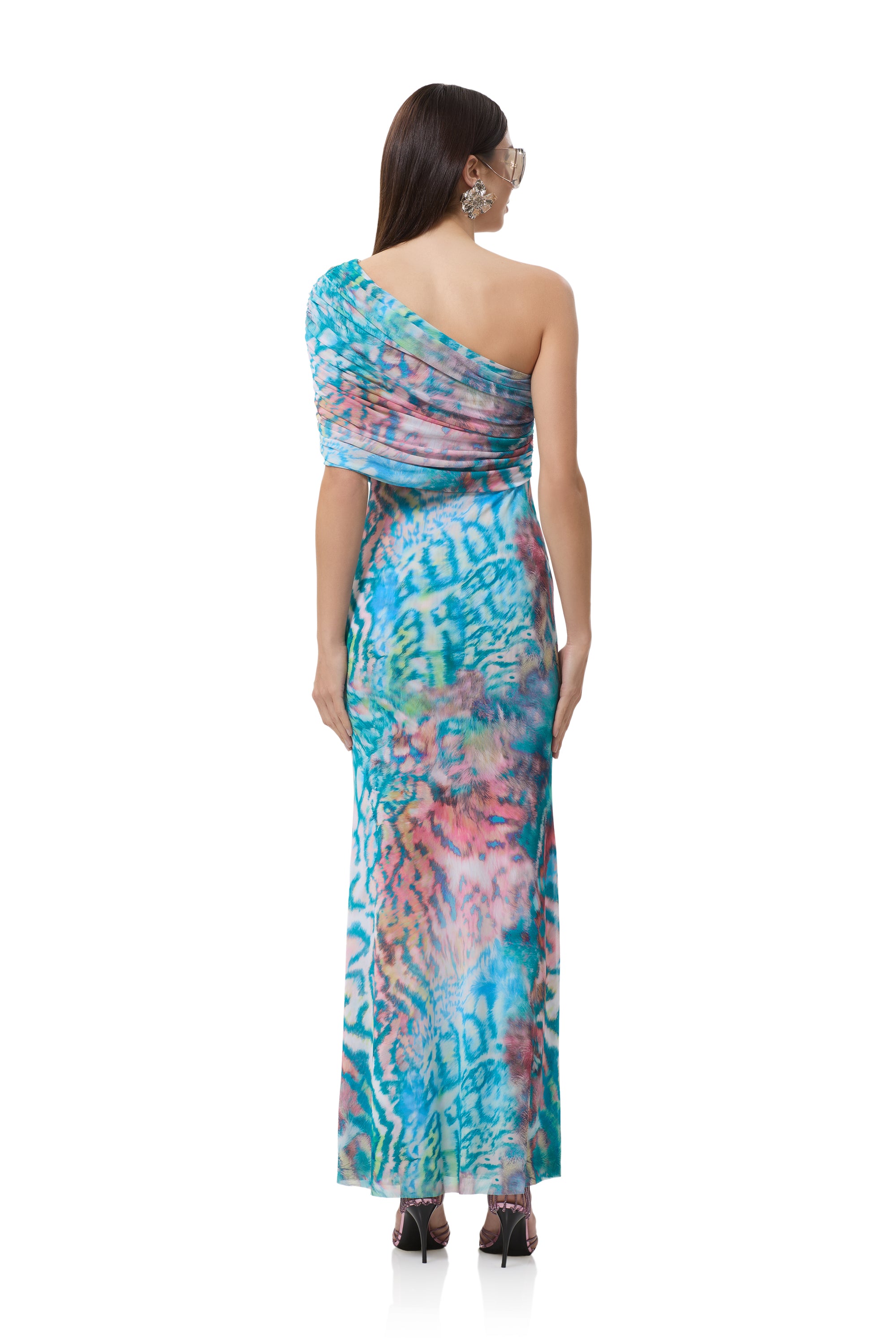 A bold new silhouette destined for icon status, introducing the Mirabel. Defined by its asymmetrical one shoulder neckline and delicate draping shoulder detail, this fluid maxi silhouette makes a bold statement in our newest Pastel Animal placement print.