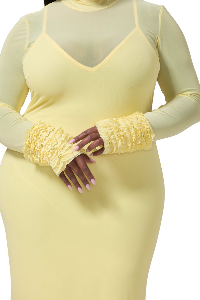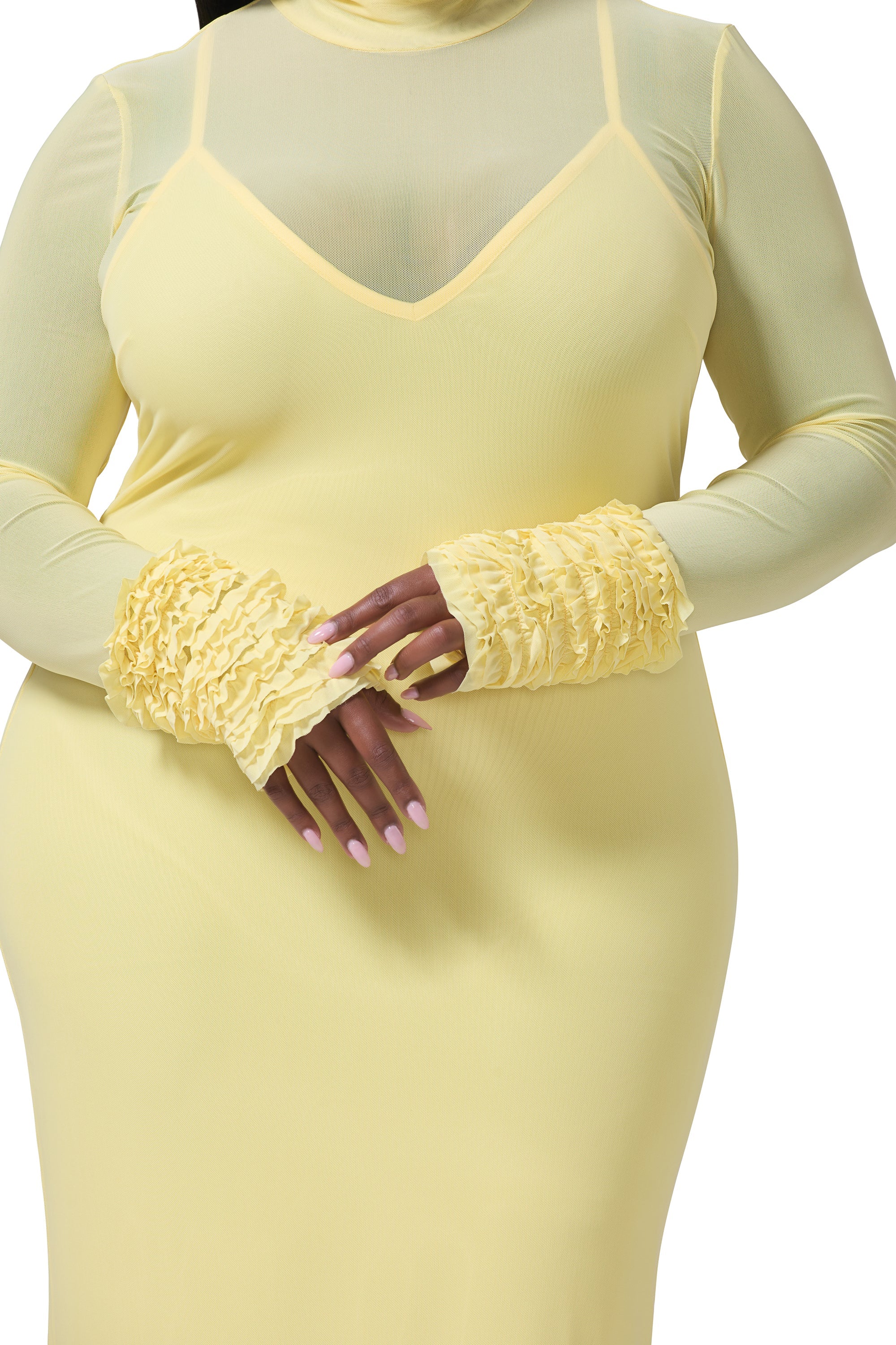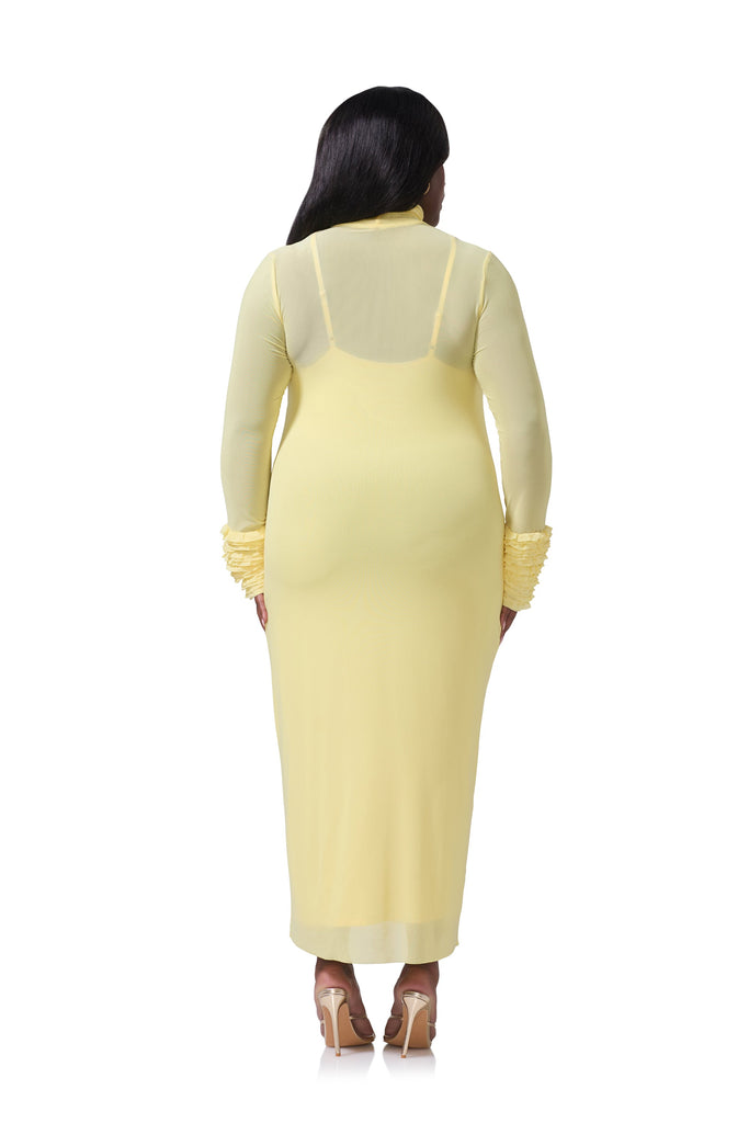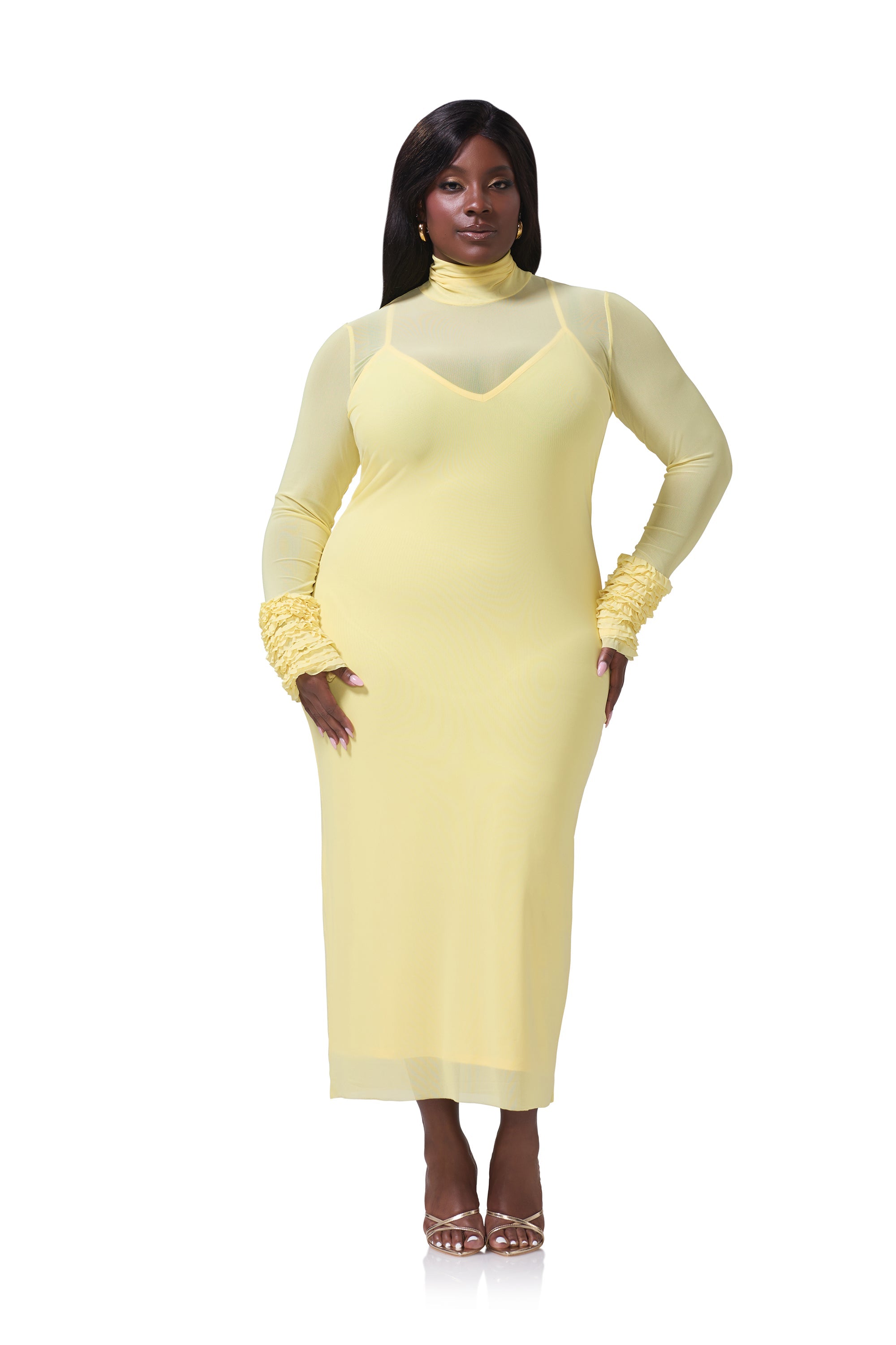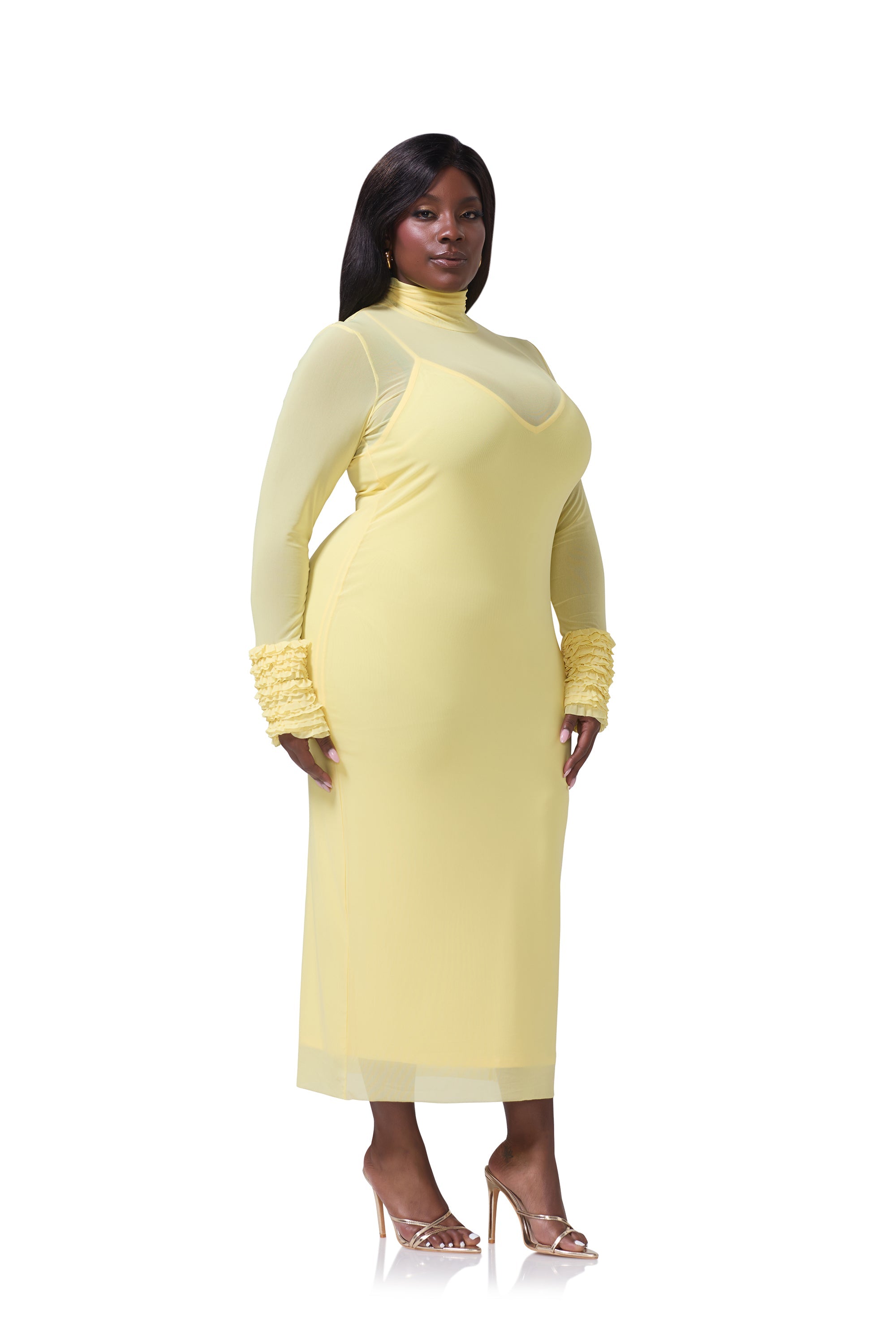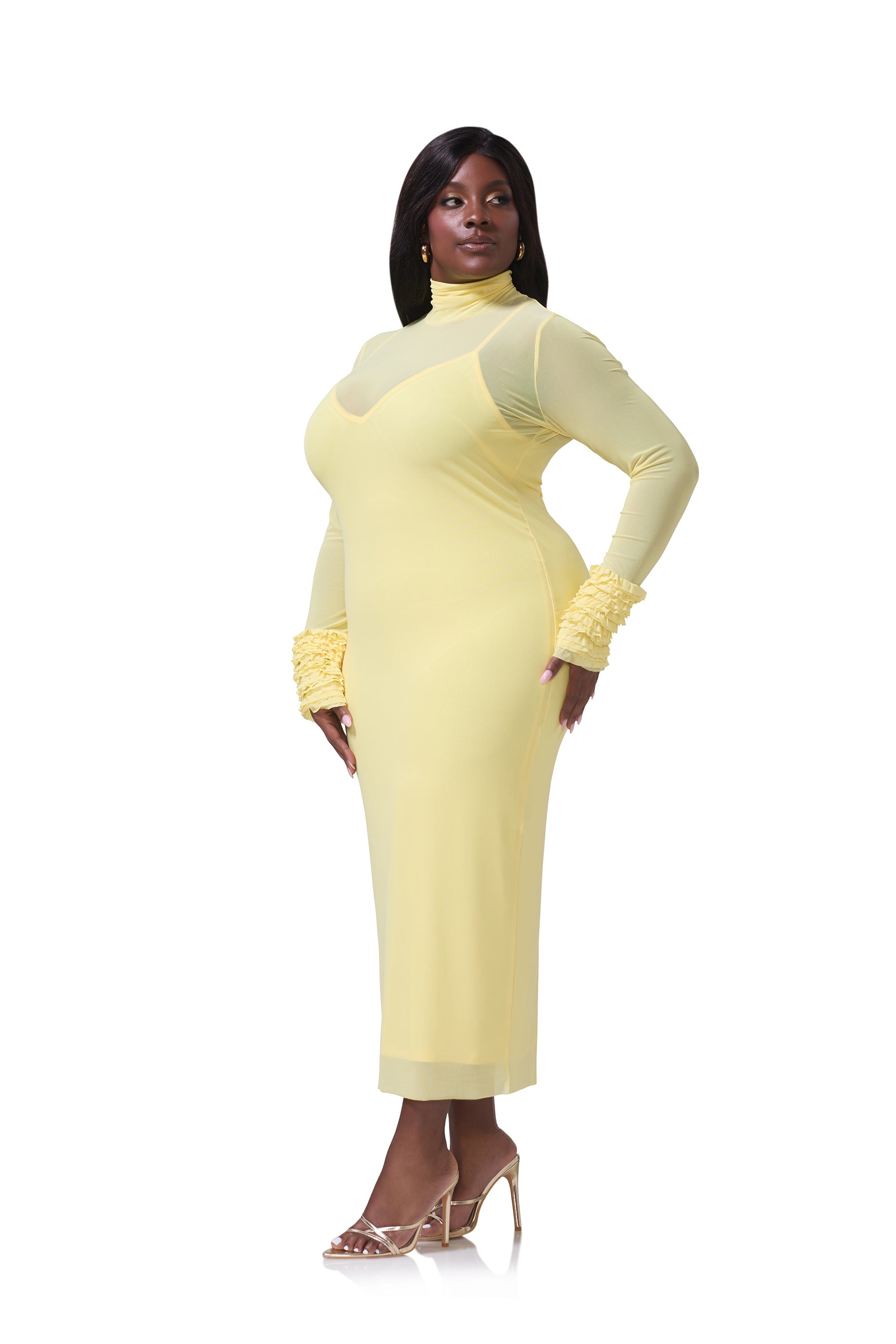 Meet Ariel. An update to our most-sold silhouette, the Shailene. In a sheer powermesh, the Ariel features a turtleneck fitted midi length and micro ruffle cuff details. She comes with a removable slip if you dare to show extra skin. Ariel was meant for you.