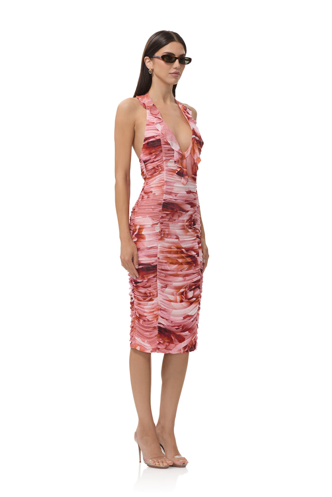 The all new Balmer Dress is the embodiment of effortless allure. Featuring a daring deep V neckline and a sultry low back, this statement silhouette turns heads in our signature power mesh and newest print, Peach Roses.