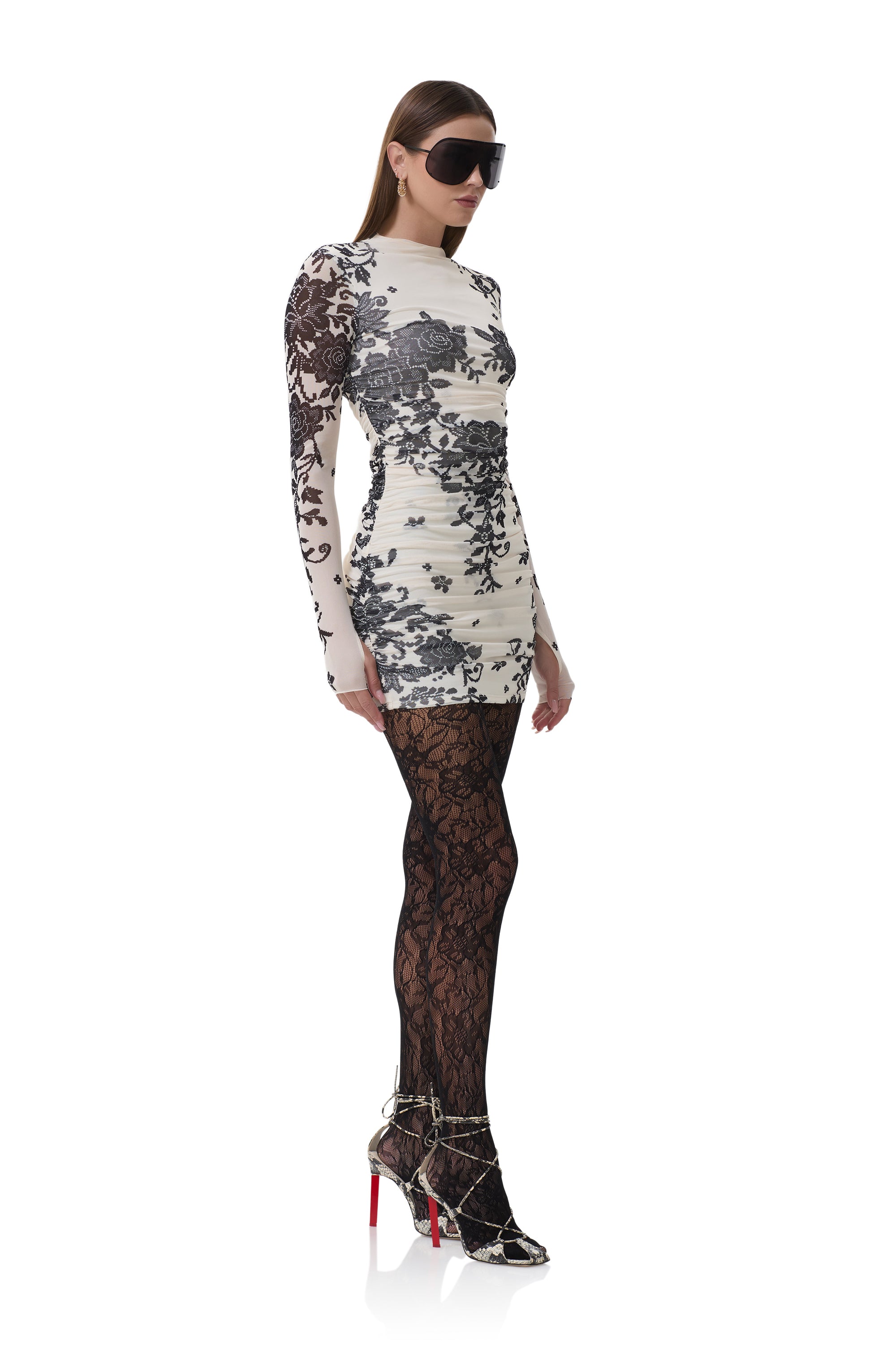 Be the moment with the Darcie Mini Dress in Stark Lace. This body hugging silhouette finds balance through its sleek, yet flattering fit, while featuring side ruching that is sure to turn heads.
