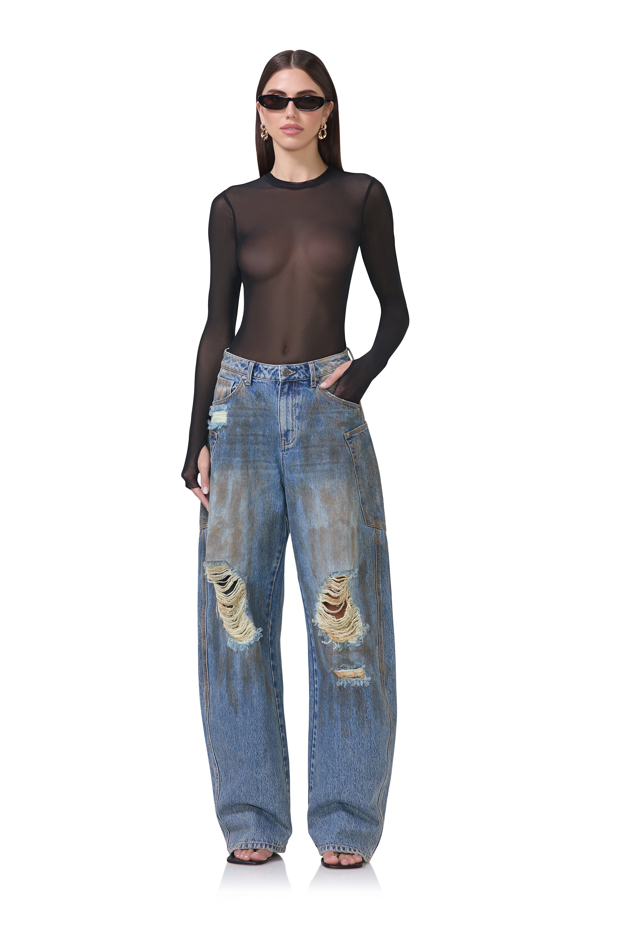 The Kaylee top features a sheer mesh material, crew neck and street-style thumbholes that lend an edgy update to off-duty style. She comes in Noir.