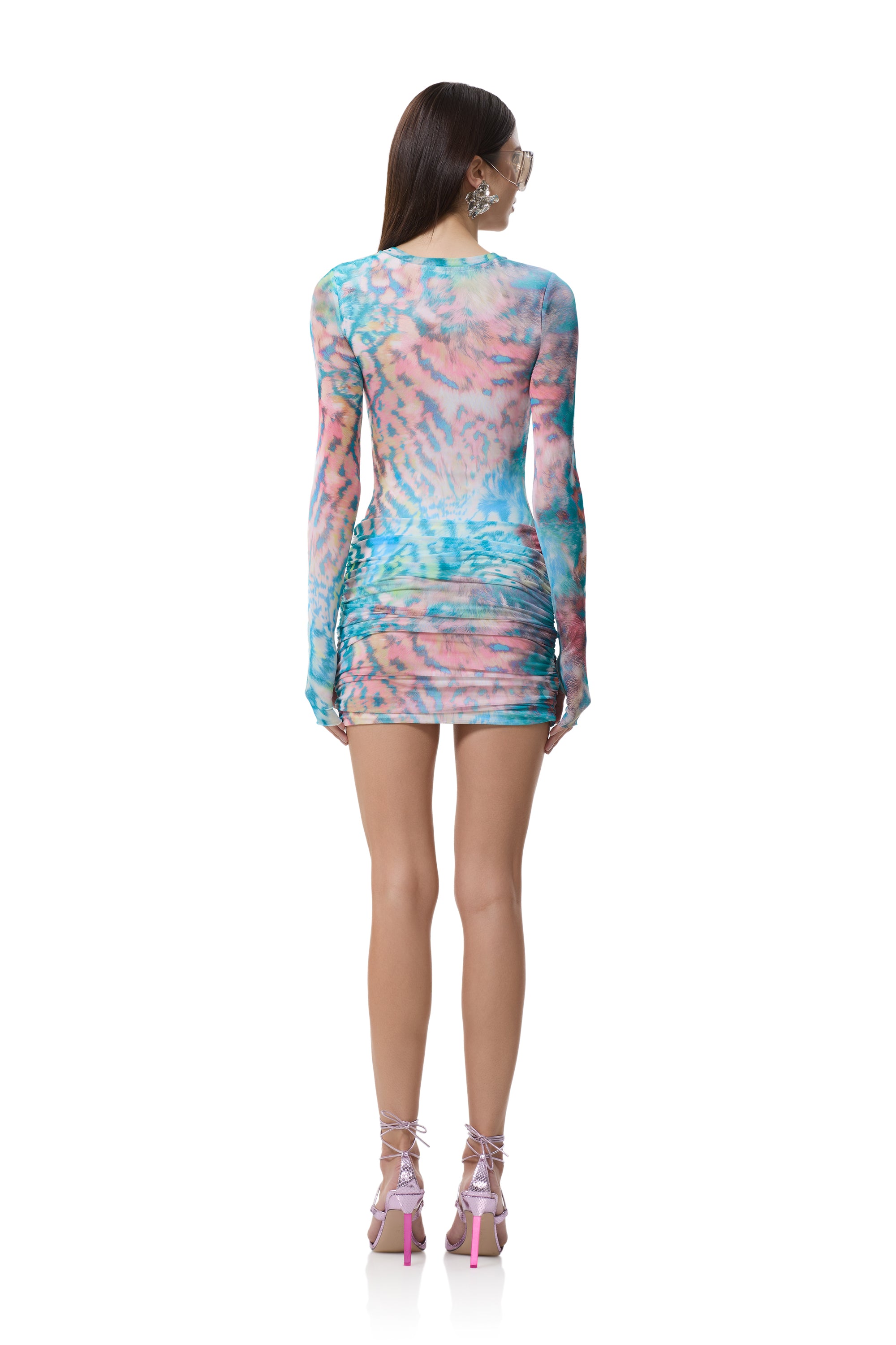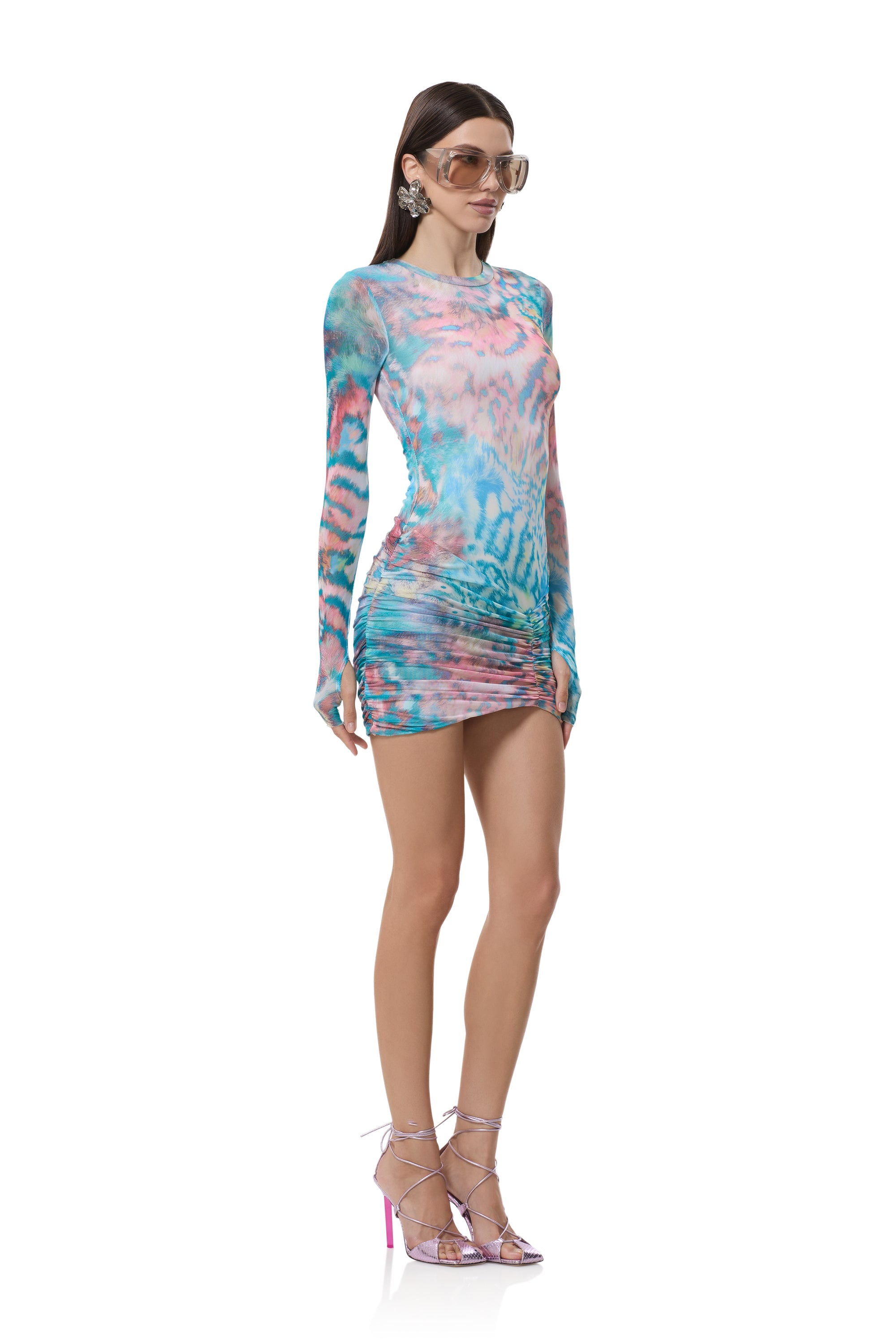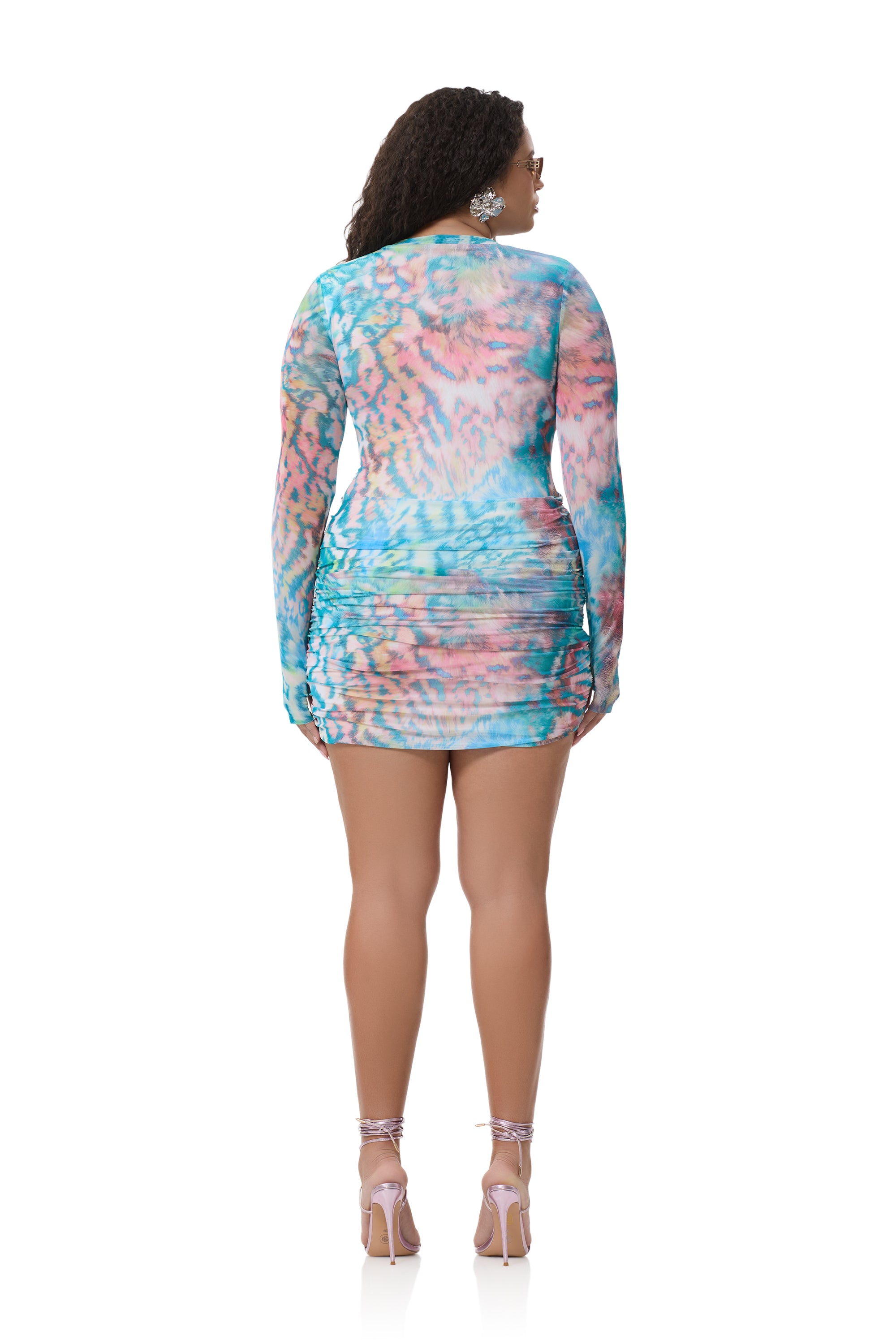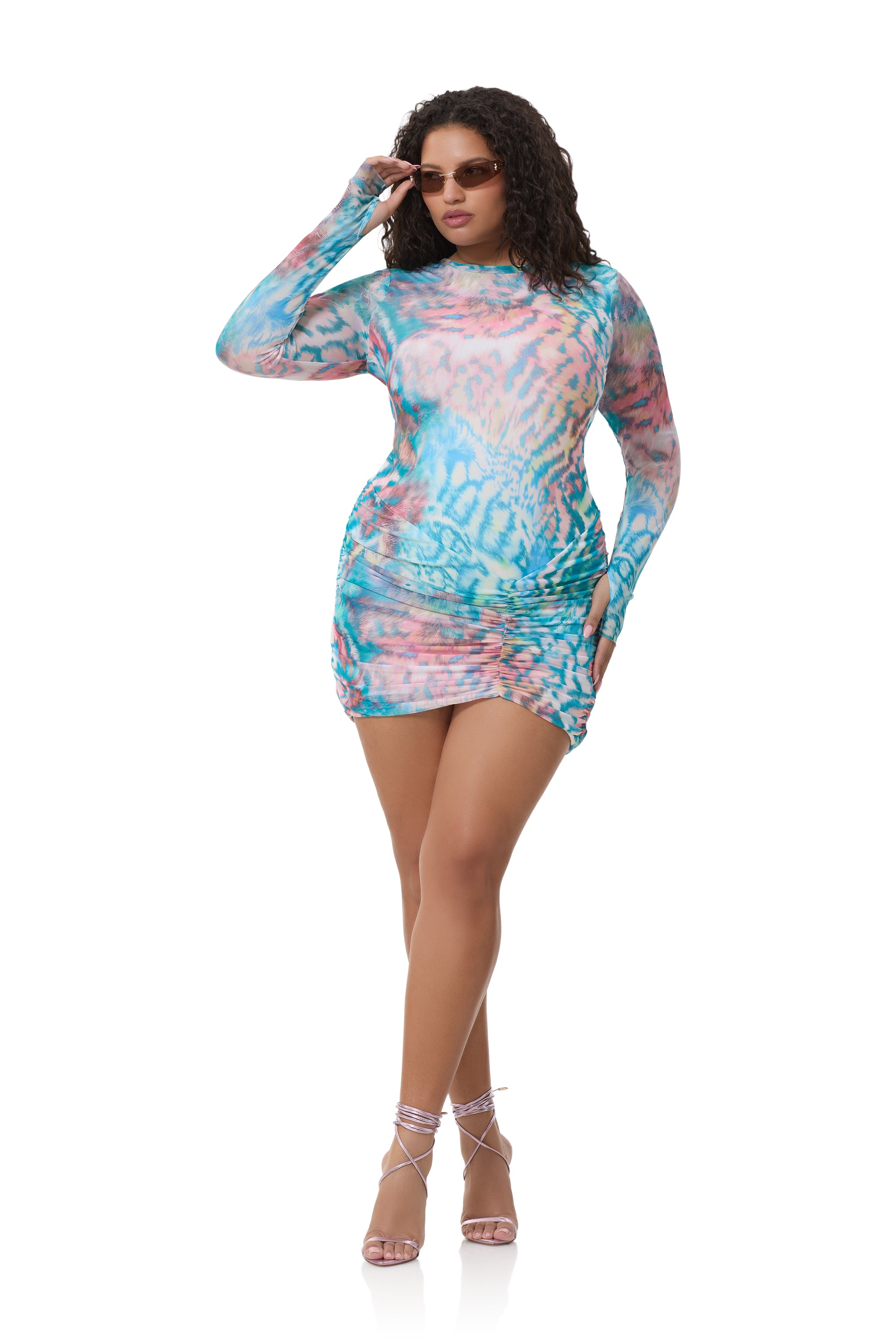 Have a mesh moment with the best selling Mirza crew neck mini dress. This body hugging silhouette finds balance in a sleek fit, drop waist details, and front ruching. She comes in our newest placement print, Pastel Animal.