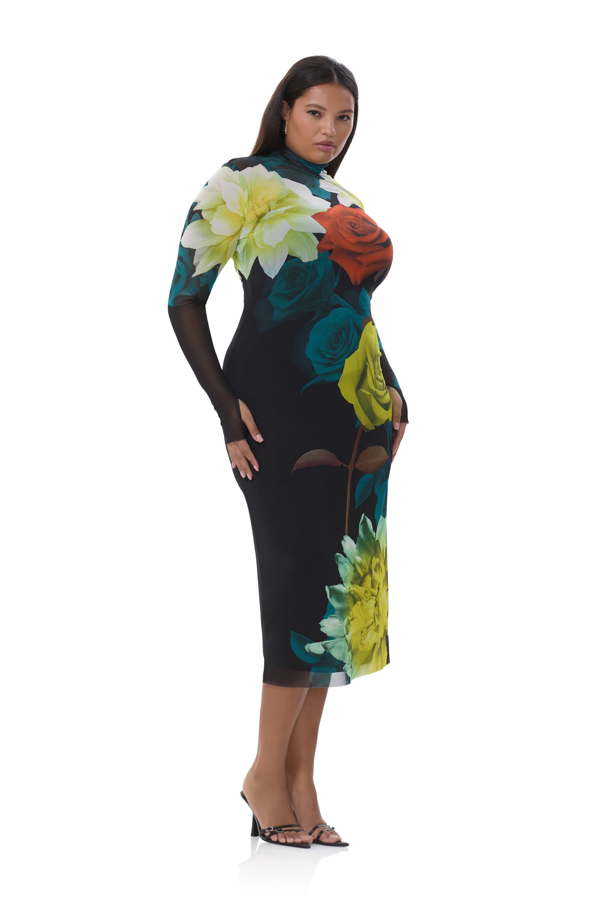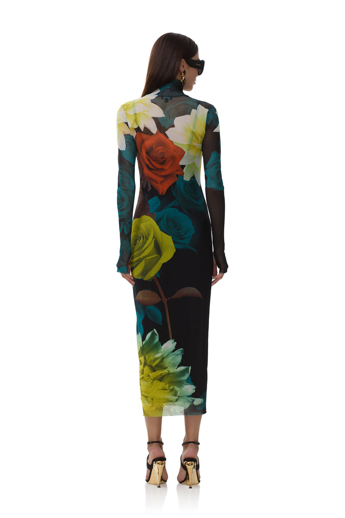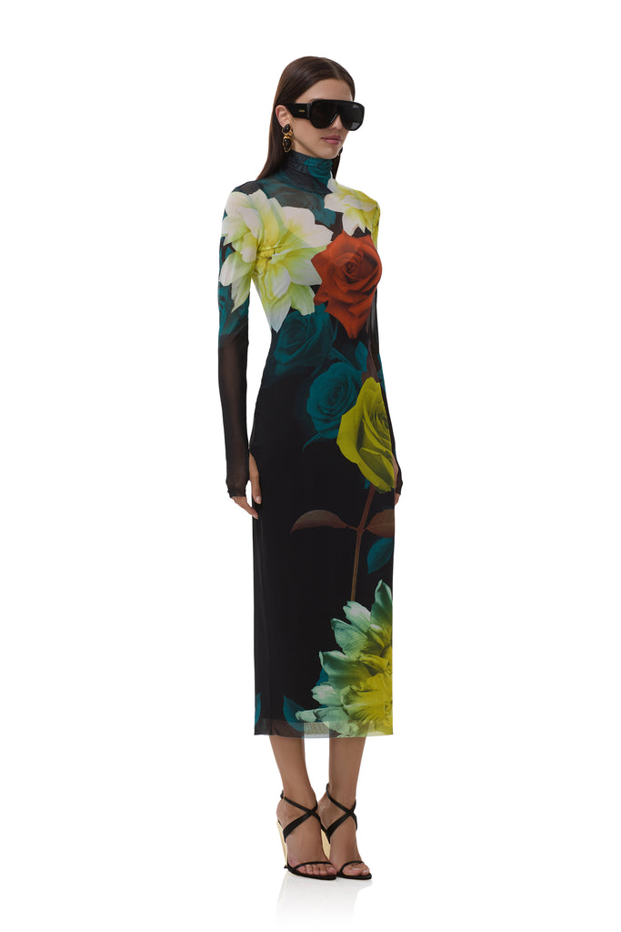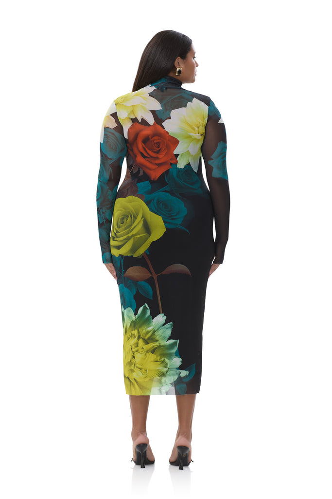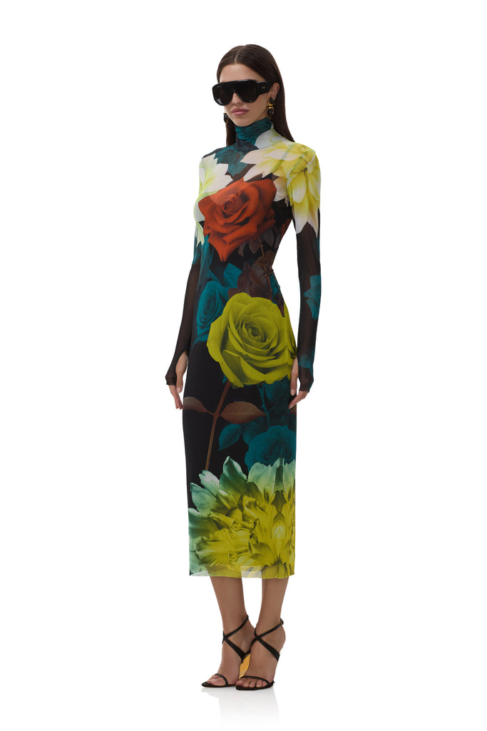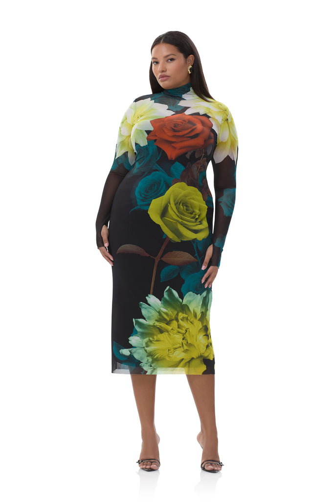 In a sheer power mesh in Citron Blossom, the Shailene dress features a turtleneck and fitted midi silhouette. Her sleeve thumbholes add off-duty detail, and she comes in a pullover design that includes a removable slip.