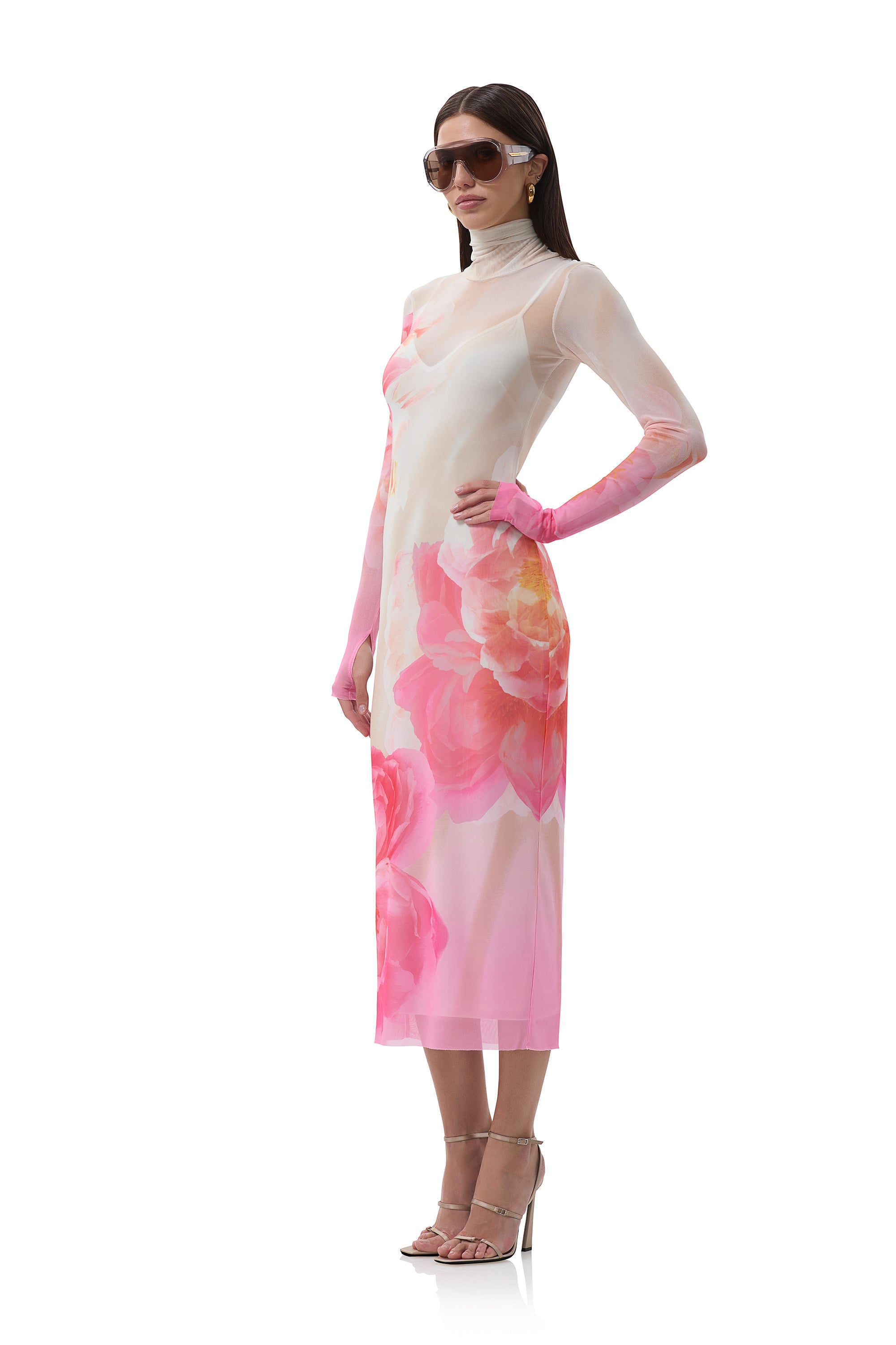 In a sheer power mesh in Cloud Floral, the Shailene dress features a turtleneck and fitted midi silhouette. Her sleeve thumbholes add off-duty detail, and she comes in a pullover design that includes a removable slip.