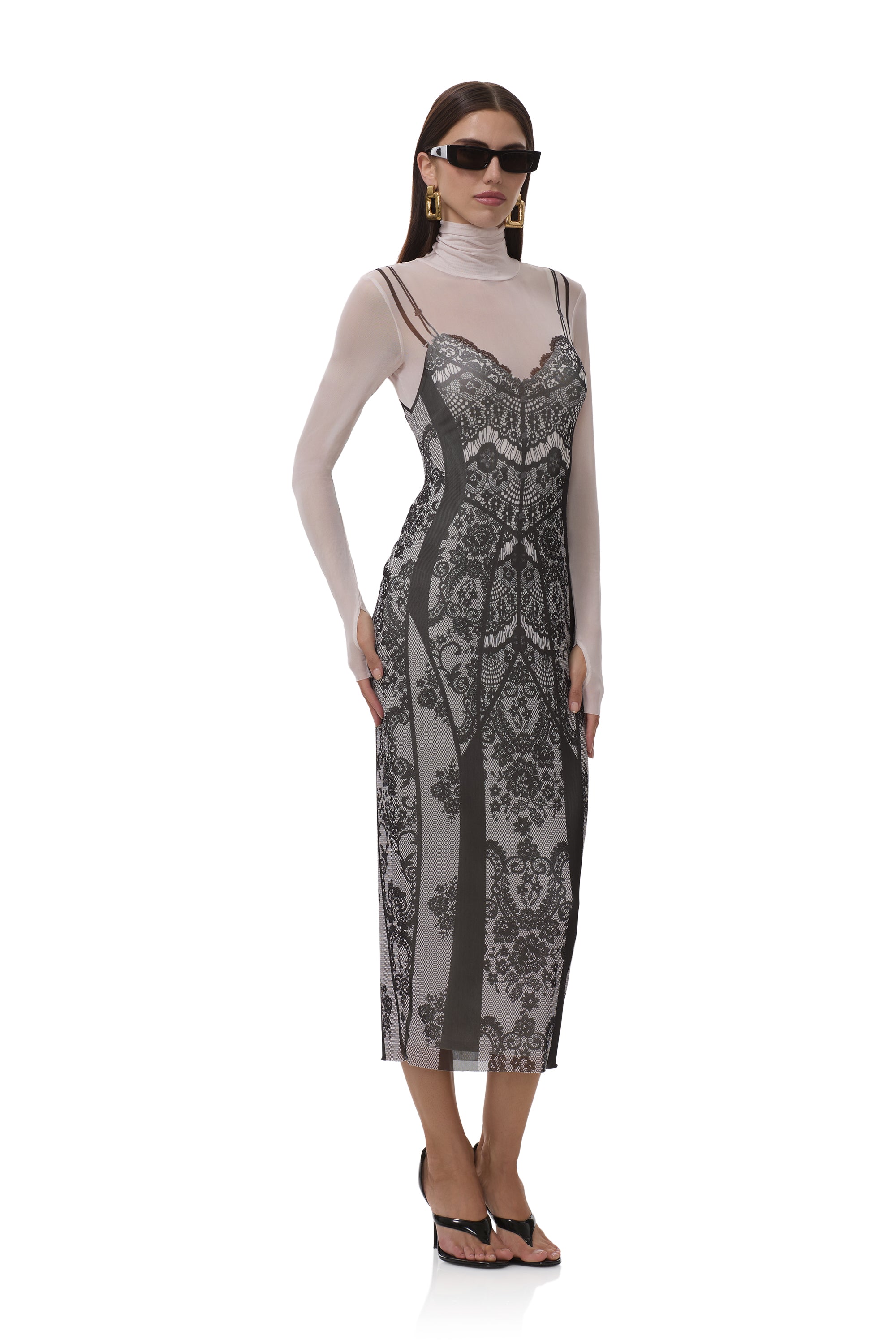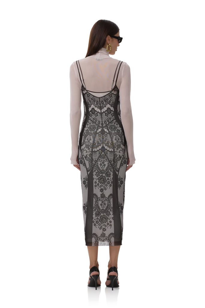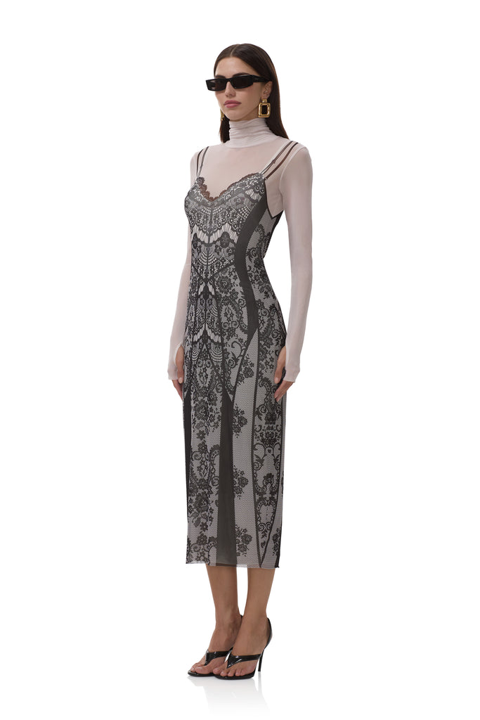 In a sheer power mesh in Corset Slip, the Shailene dress features a turtleneck and fitted midi silhouette. Her sleeve thumbholes add off-duty detail, and she comes in a pullover design that includes a removable slip.