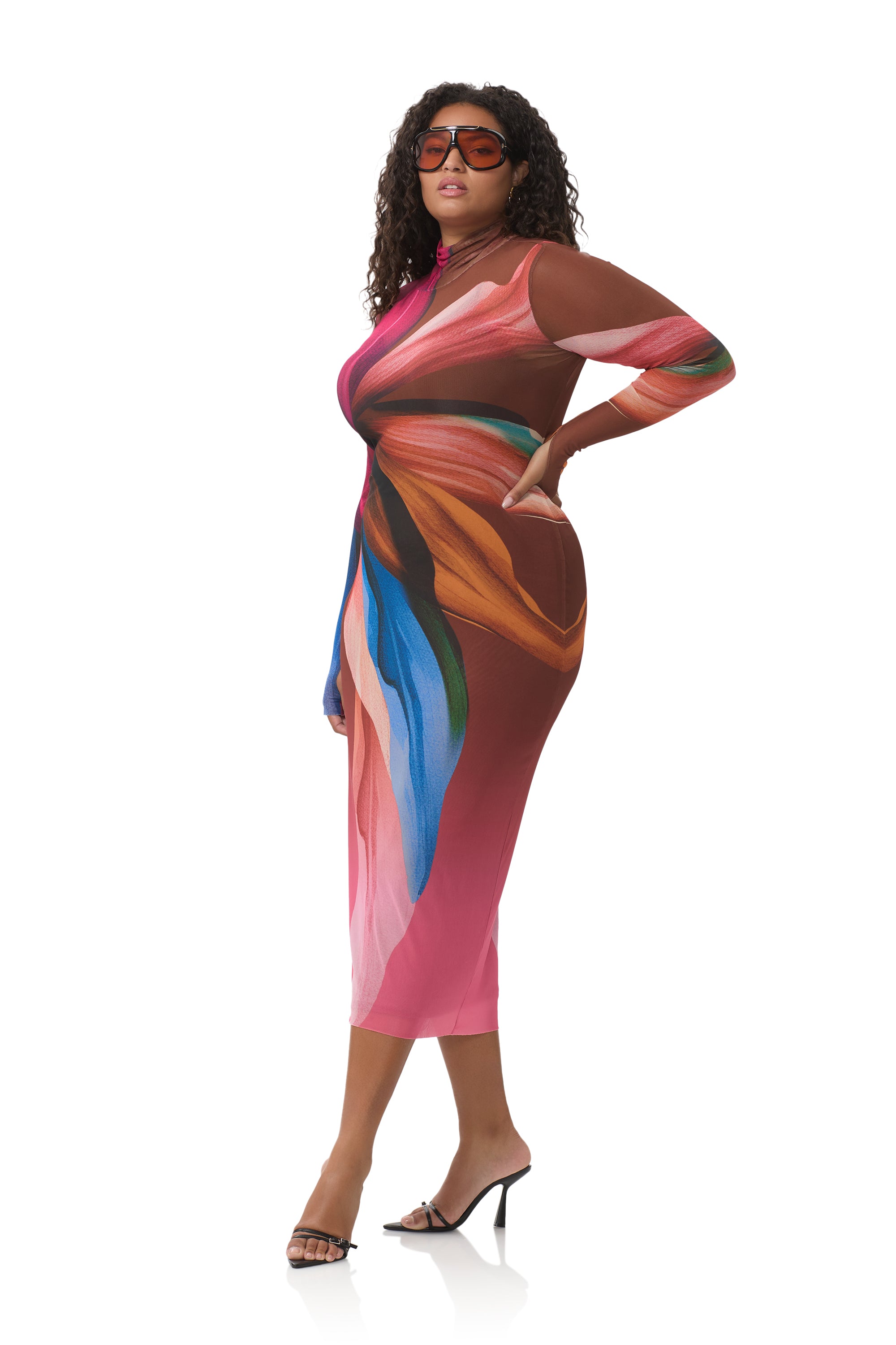In a sheer power mesh in Earthen Leaf Lotus, the Shailene dress features a turtleneck and fitted midi silhouette. Her sleeve thumbholes add off-duty detail, and she comes in a pullover design that includes a removable slip.
