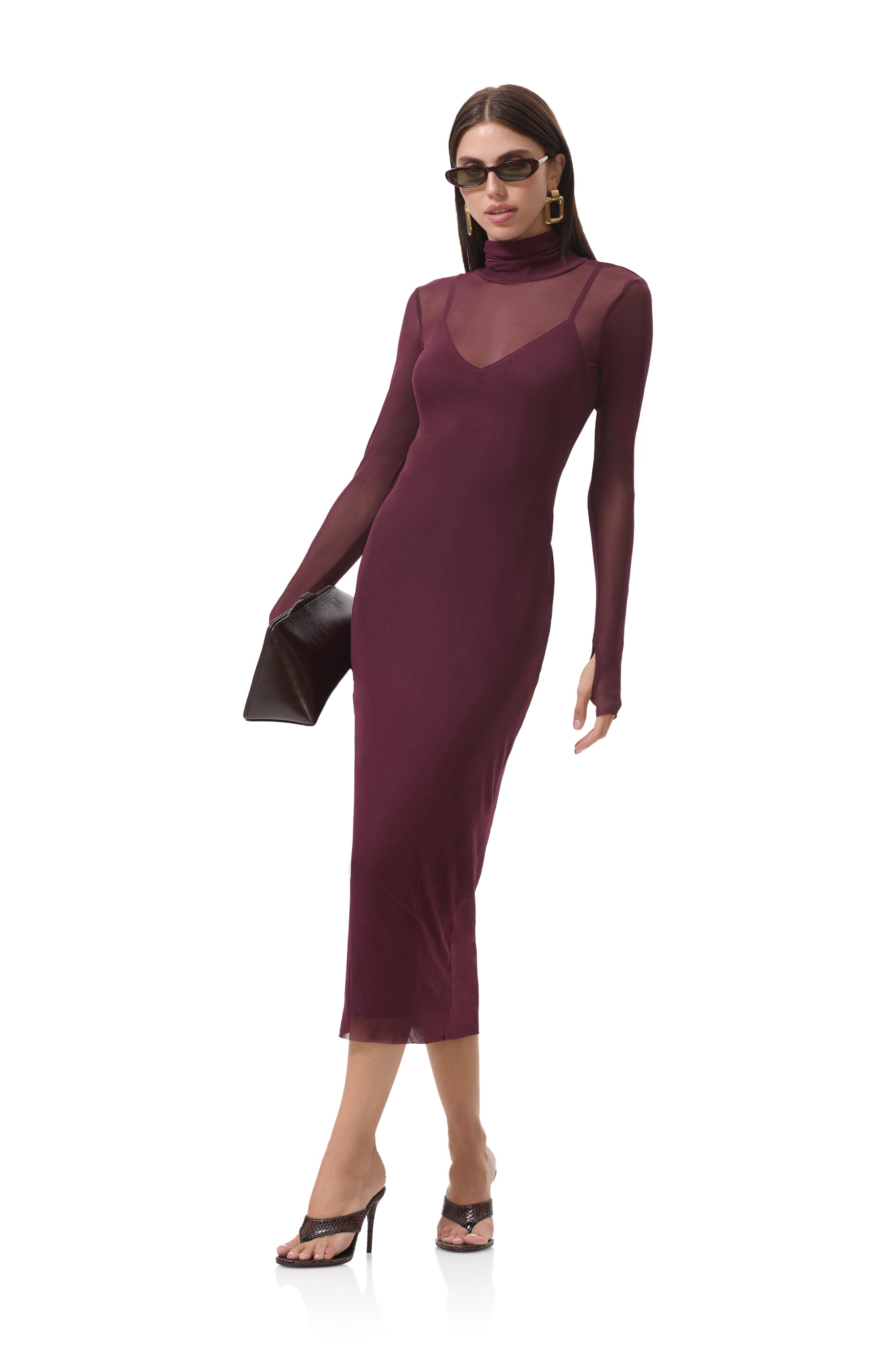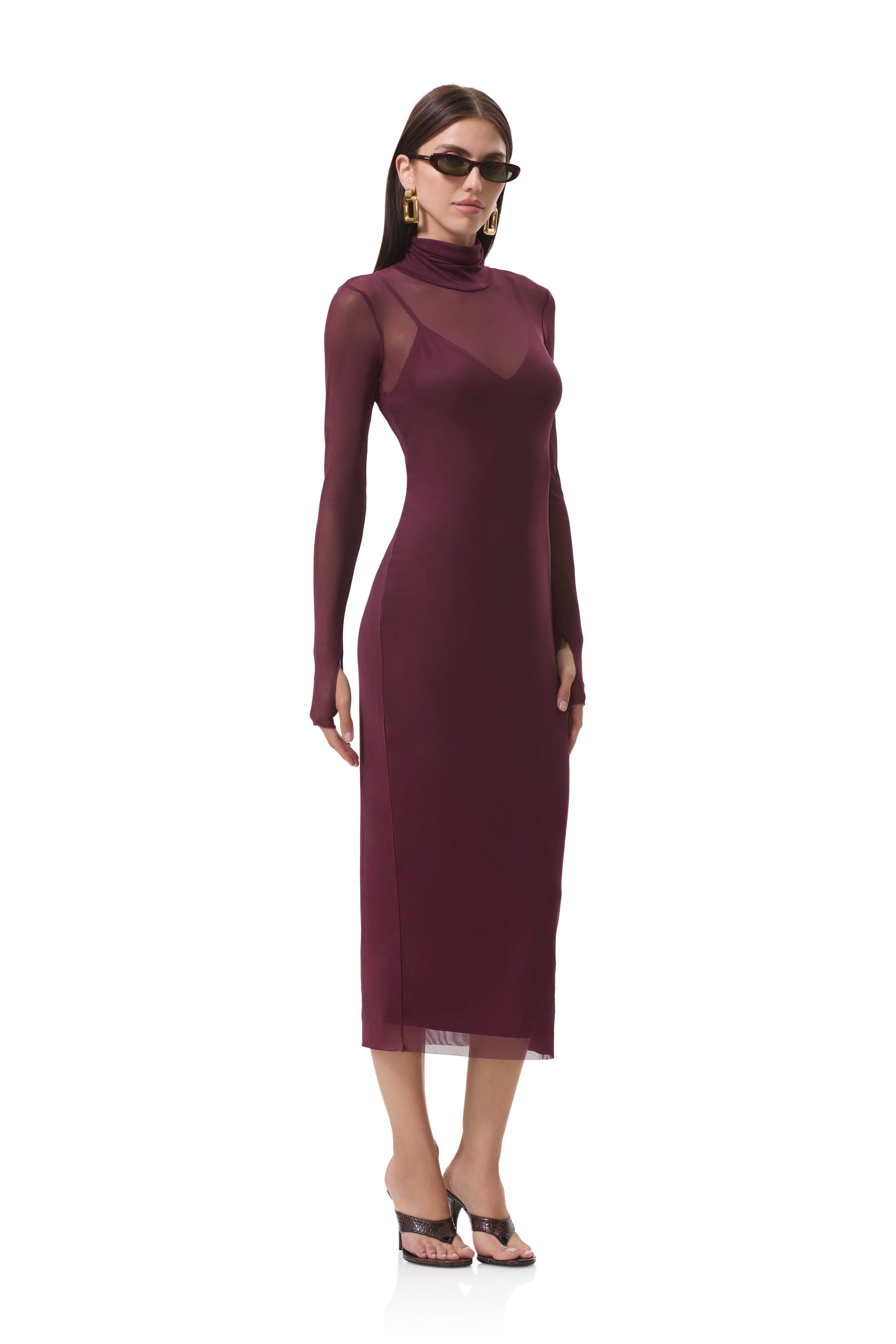 In a sheer power mesh in Fig, the Shailene dress features a turtleneck and fitted midi silhouette. Her sleeve thumbholes add off-duty detail, and she comes in a pullover design that includes a removable slip.