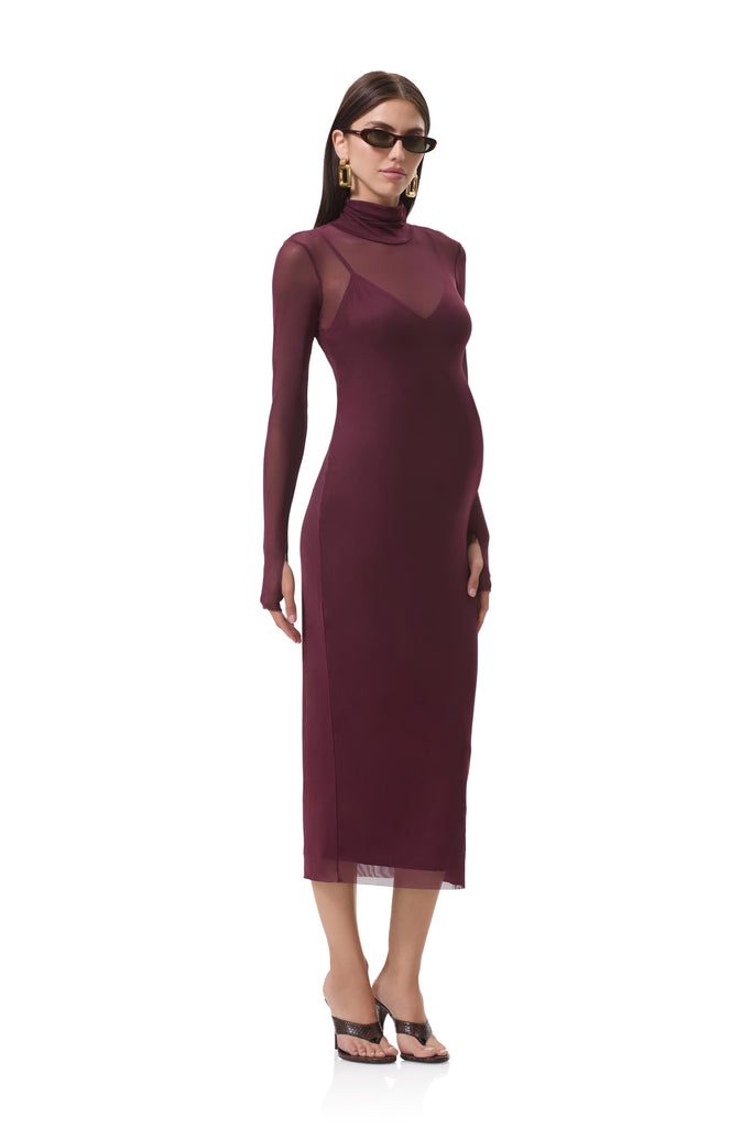 Embrace this new chapter with confidence and style. From bump to baby and beyond, our styles will always move with you. Whether you're dressing up or winding down, find your feel-good fit in our iconic statement prints, and versatile designs that transition seamlessly from day to night. In a sheer power mesh in Fig, the Shailene dress features a turtleneck and fitted midi silhouette.
