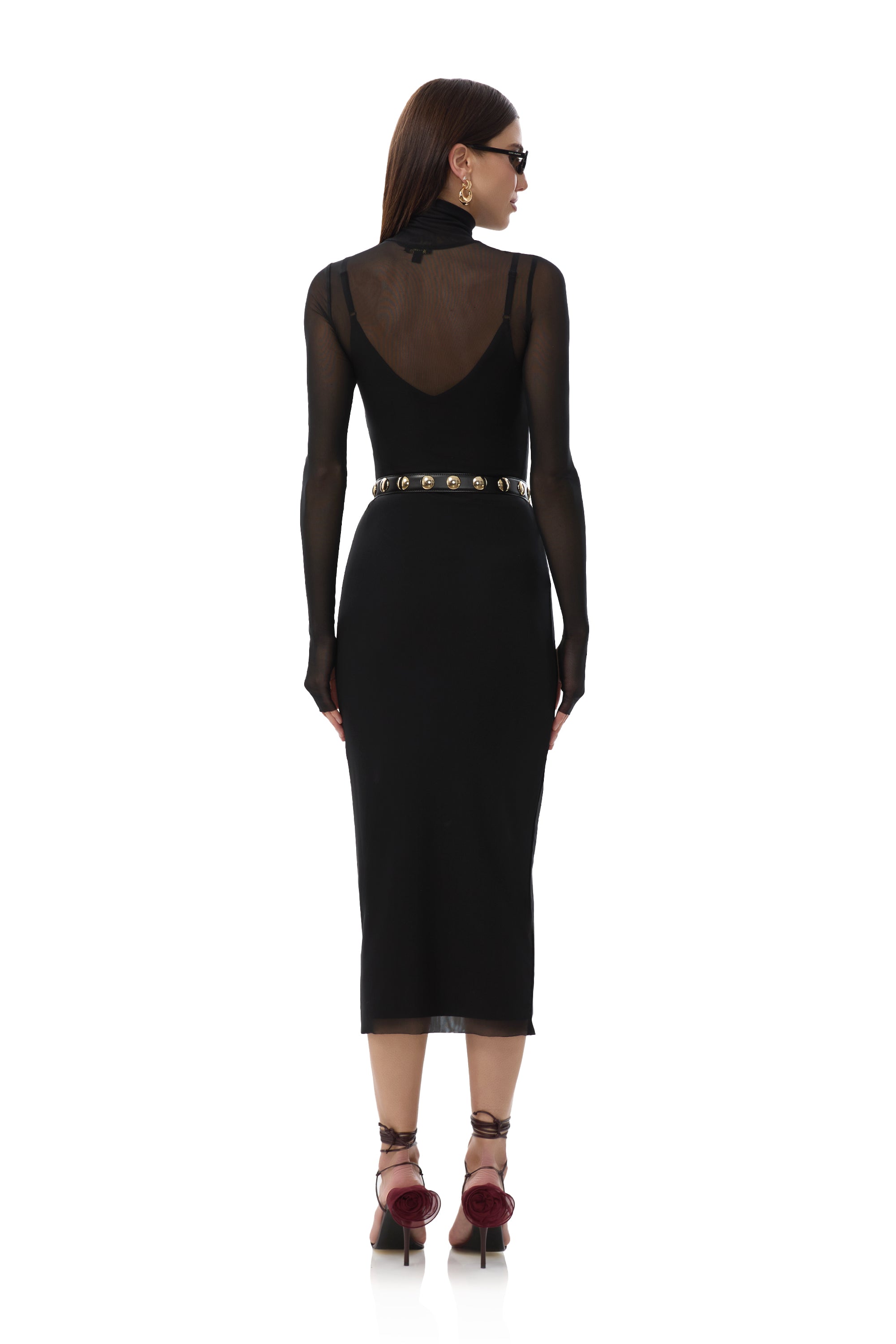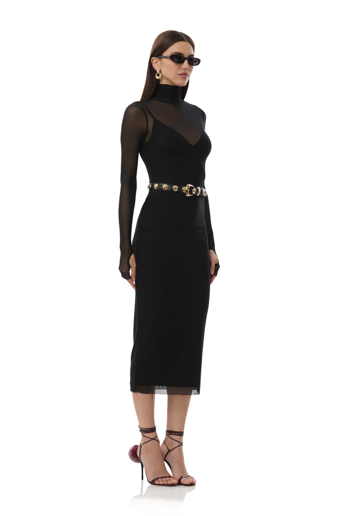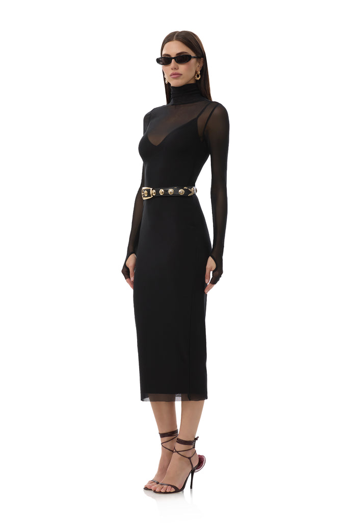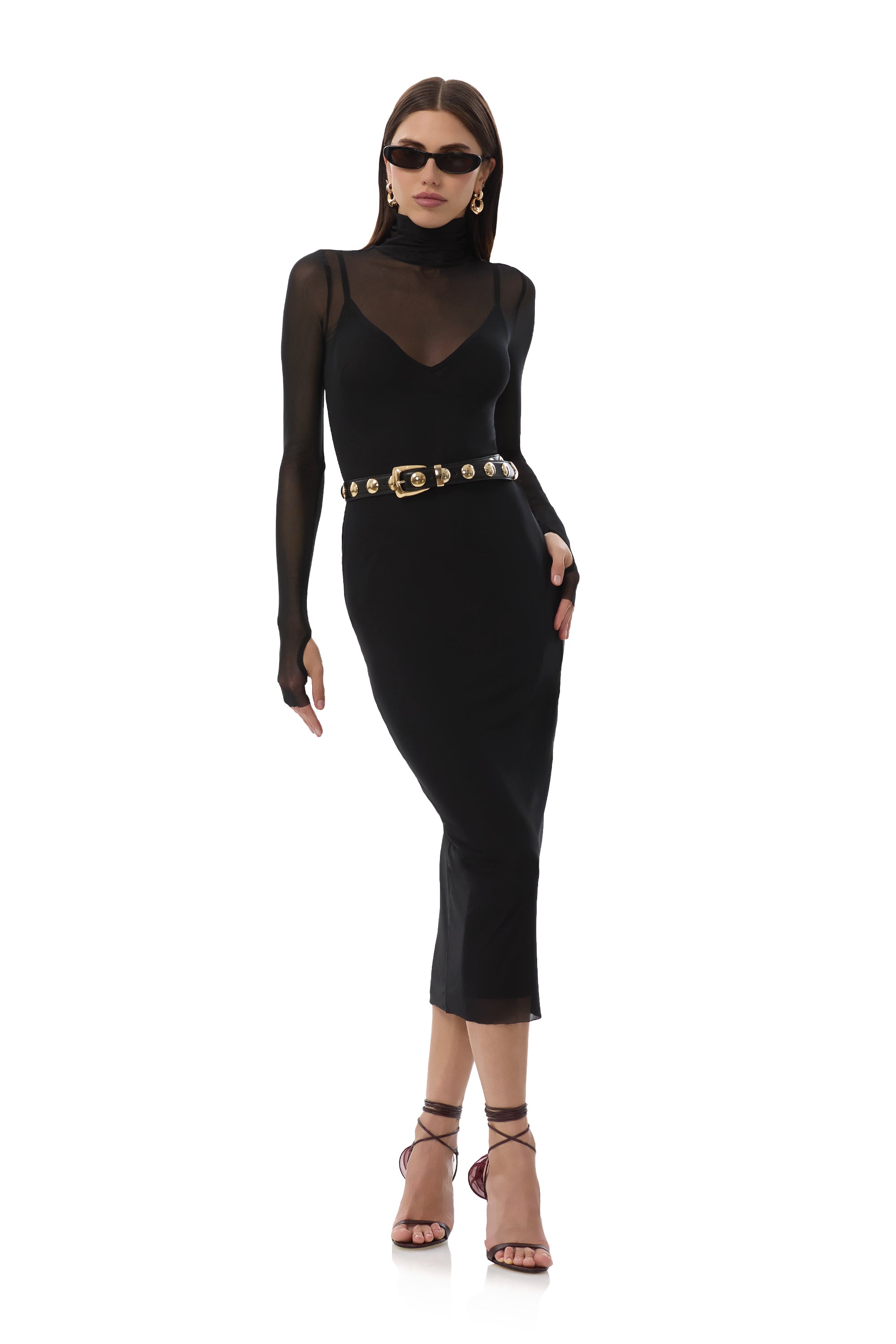 In a sheer power mesh in Noir, the Shailene dress features a turtleneck and fitted midi silhouette. Her sleeve thumbholes add off-duty detail, and she comes in a pullover design that includes a removable slip.