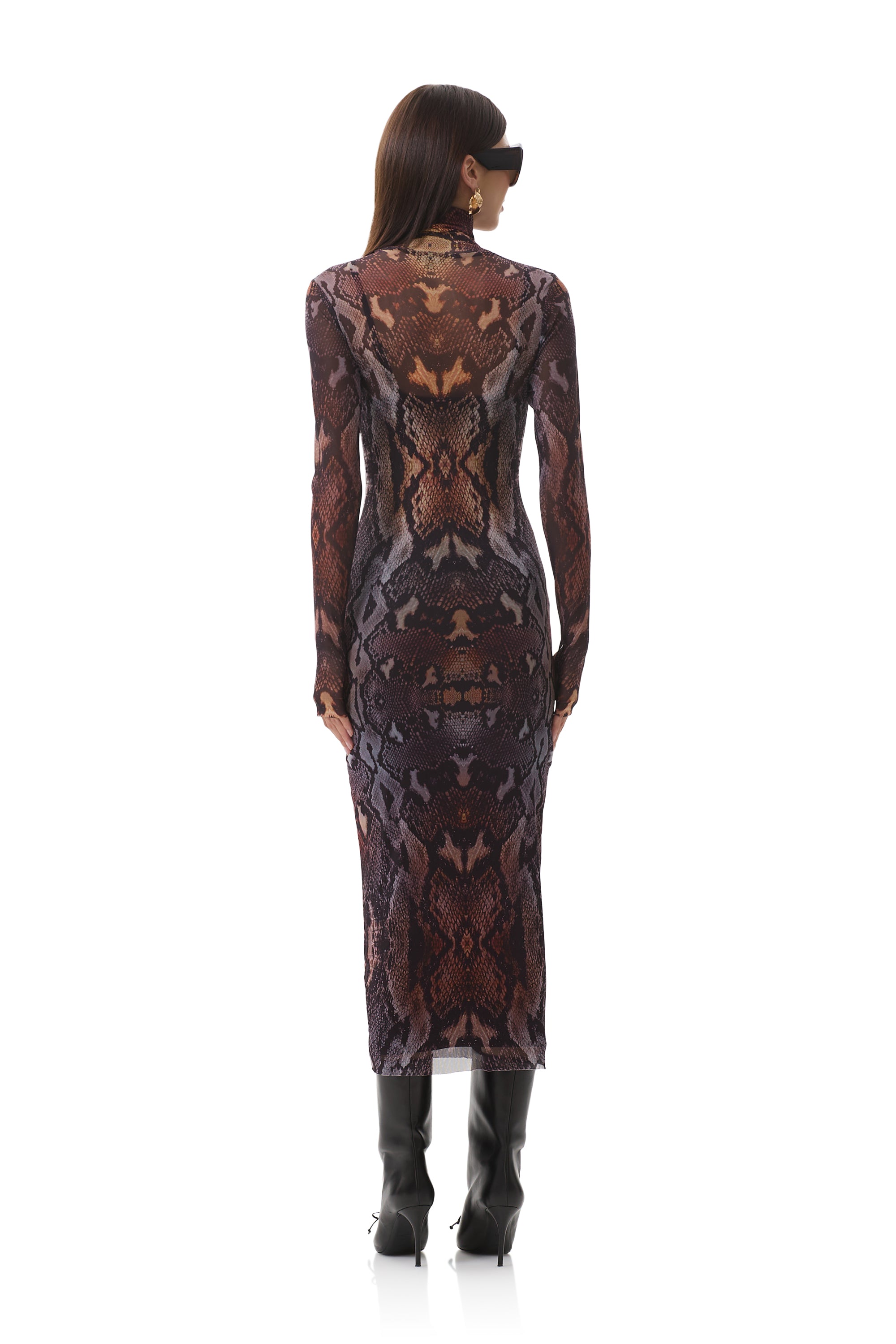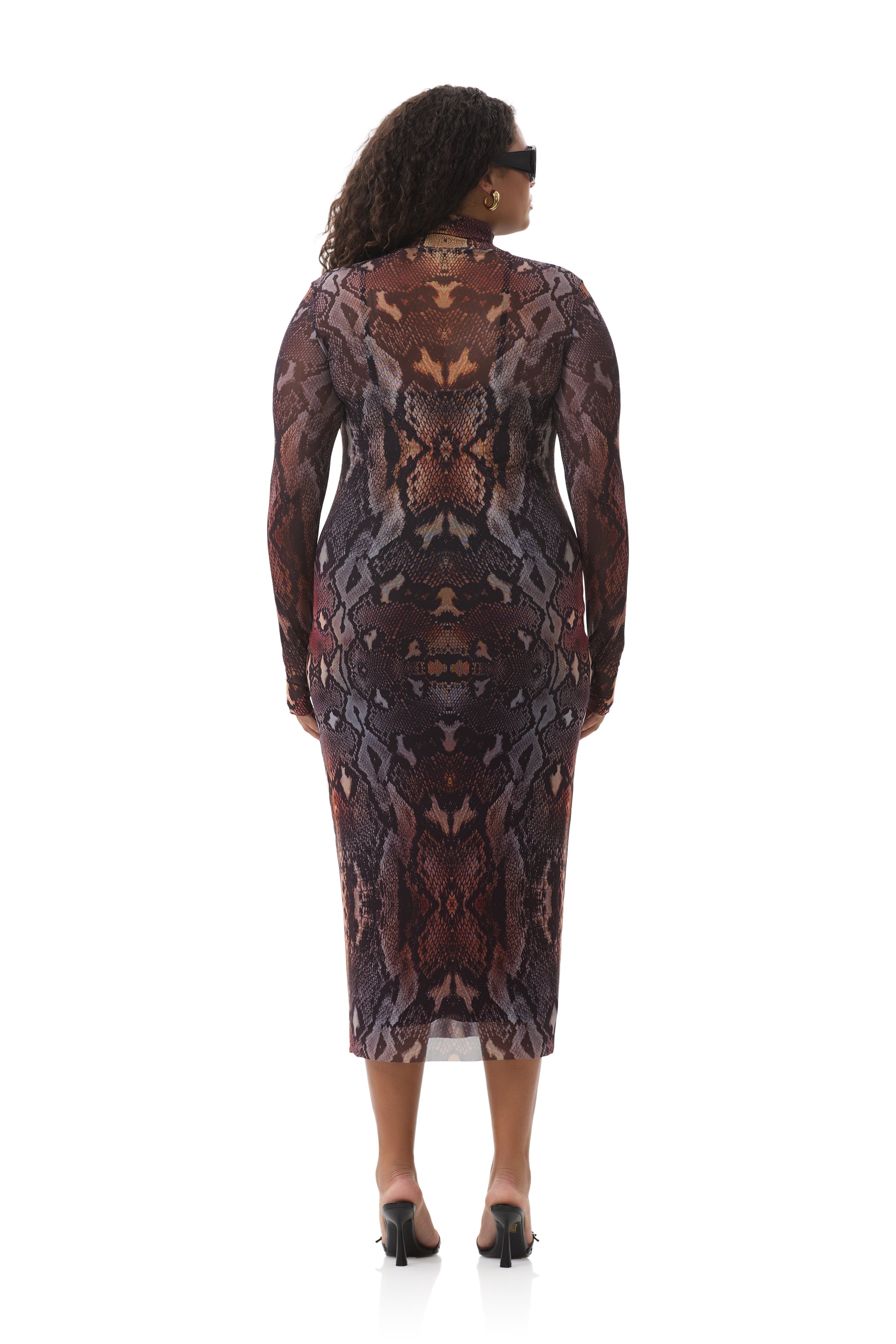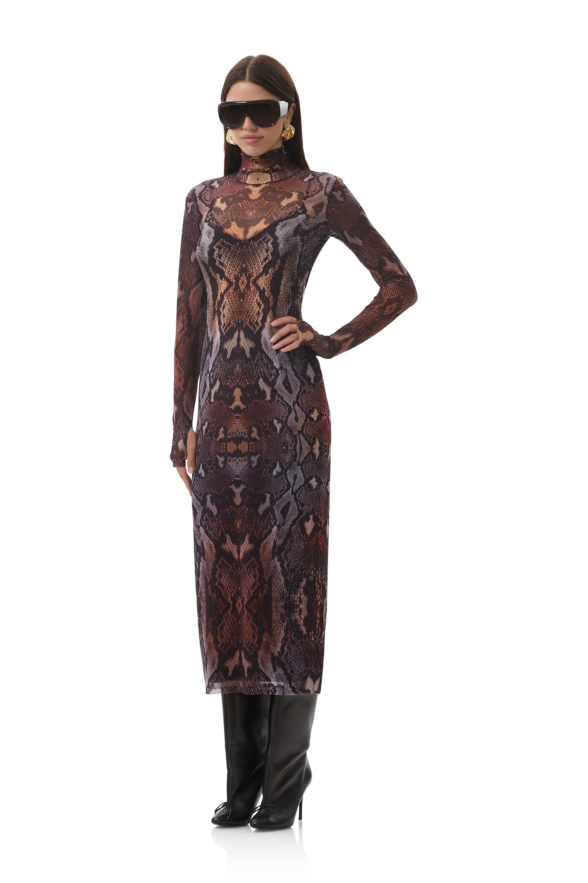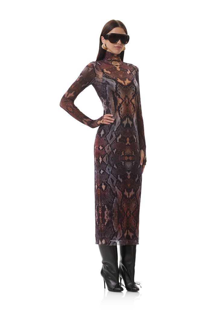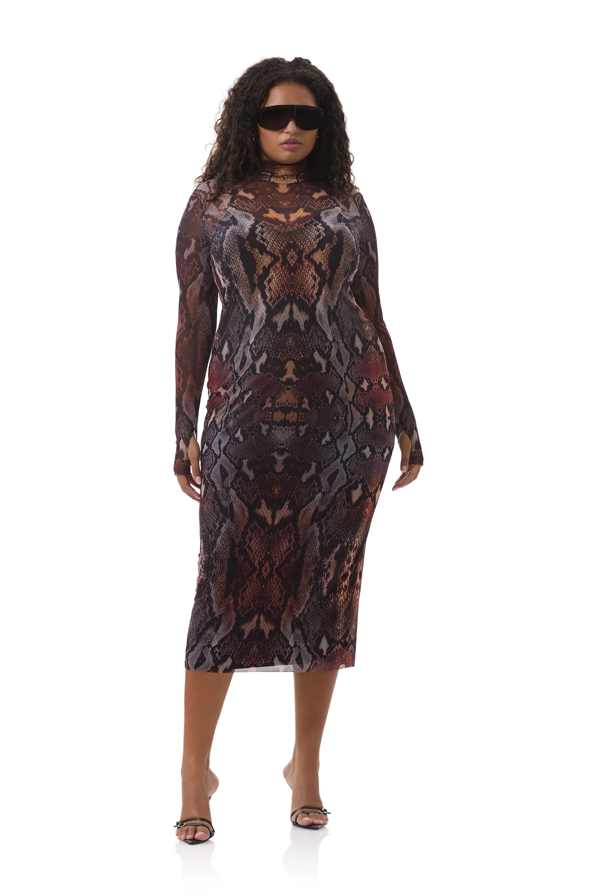 In a sheer power mesh in Placed Umber Snake, the Shailene dress features a turtleneck and fitted midi silhouette. Her sleeve thumbholes add off-duty detail, and she comes in a pullover design that includes a removable slip.